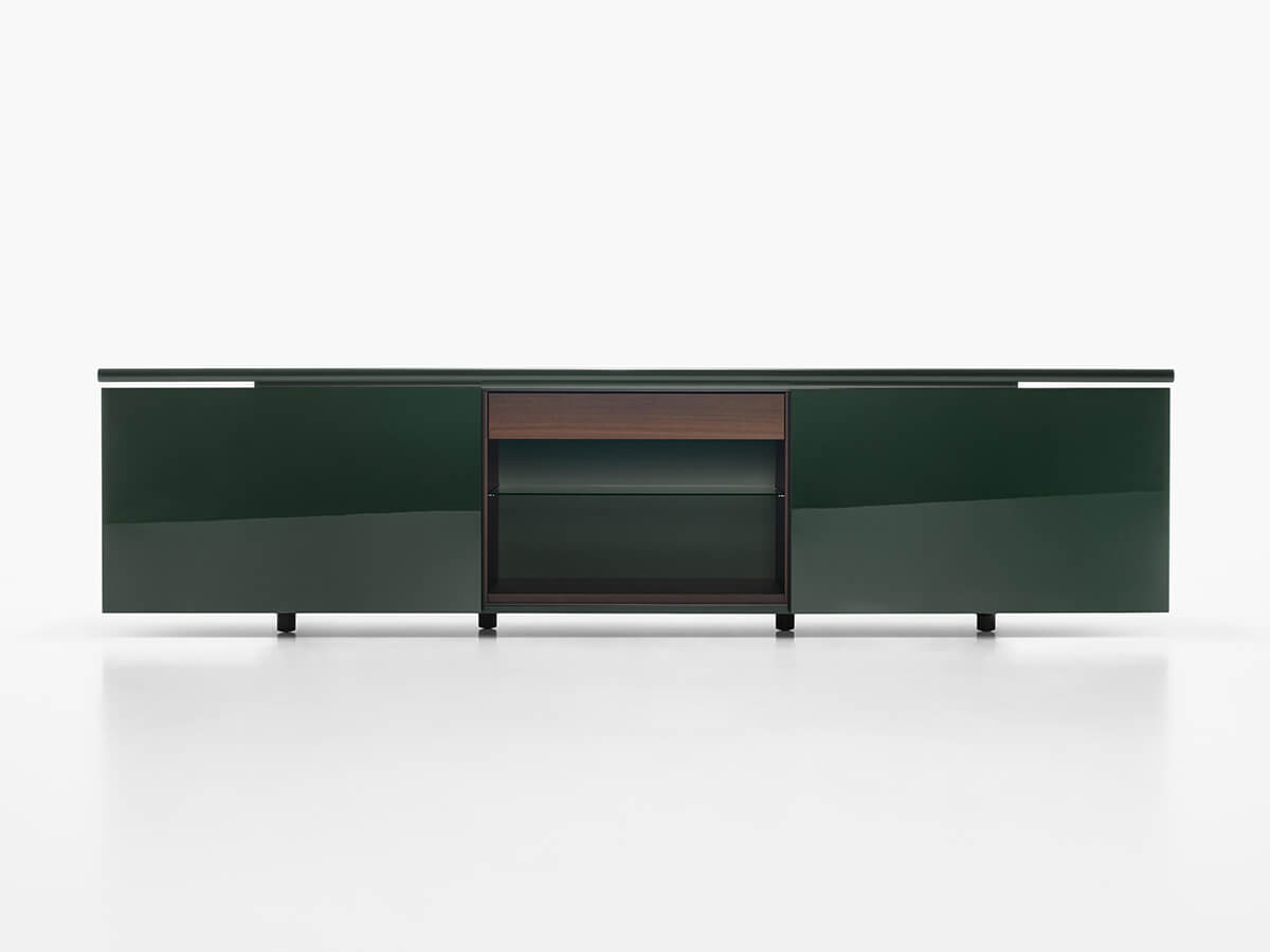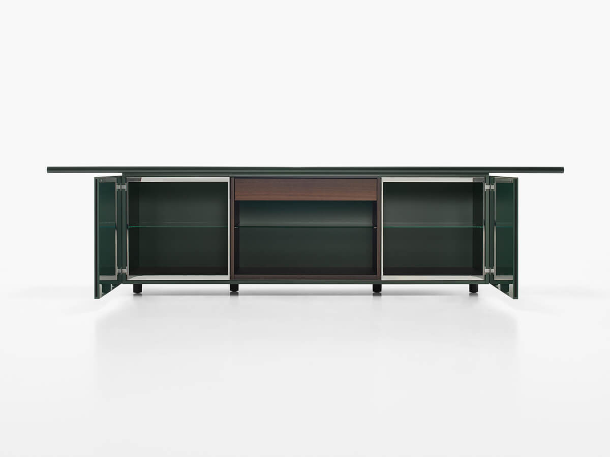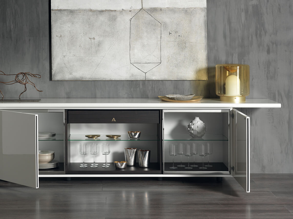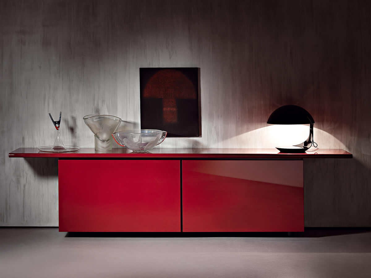 La madia Sheraton è uno dei simboli intramontabili della produzione Acerbis. Premiata nel 1979 con il prestigioso Compasso d’Oro, Sheraton è stata disegnata dallo storico titolare dell’azienda, Lodovico Acerbis, in collaborazione con un designer versatile e apprezzato come Giotto Stoppino. Le sue forme, classiche e intramontabili, risultano attualissime oggi tanto quanto all’epoca e sono rese ancor più vivide dalla brillante laccatura lucida che è sempre stata uno dei grandi marchi di fabbrica della produzione Acerbis. Le grandi ante di Sheraton possono essere spalancate totalmente grazie all’innovativo sistema di apertura scivolo-rotante e sono sormontate da un top molto più ampio della base, che le dona così anche una funzione di consolle e piano d’appoggio.