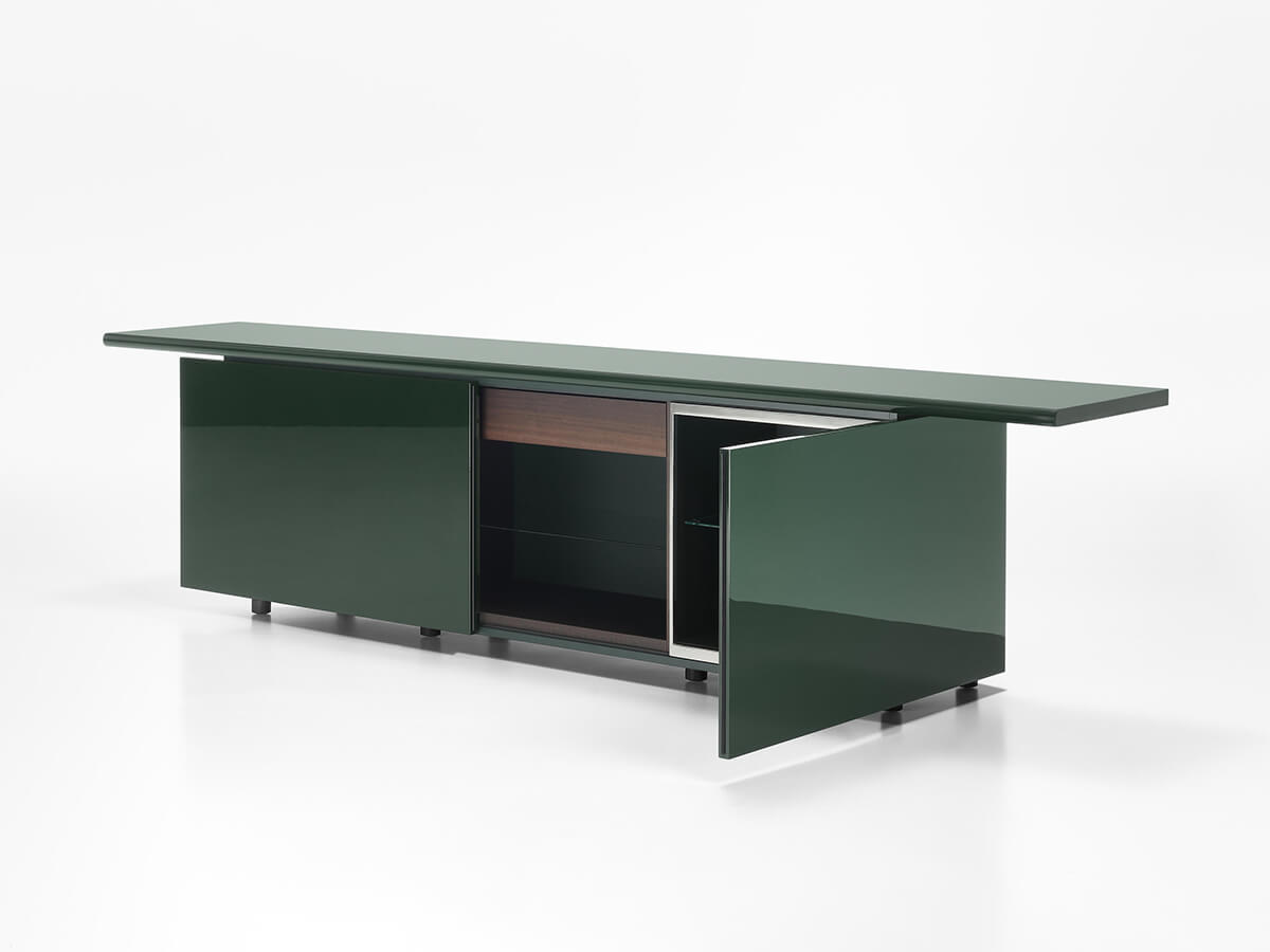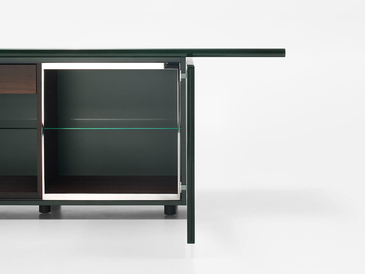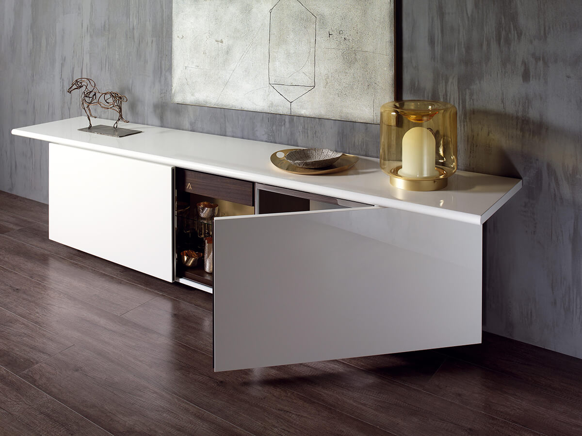 *Prezzo valido per la versione con ante e top in laccato lucido – corpo del mobile in laccato opaco nello stesso colore dell’esterno - cassetto centrale in noce tinto scuro e tre ripiani in vetro trasparente (cod. F012809).