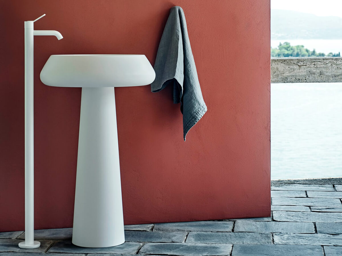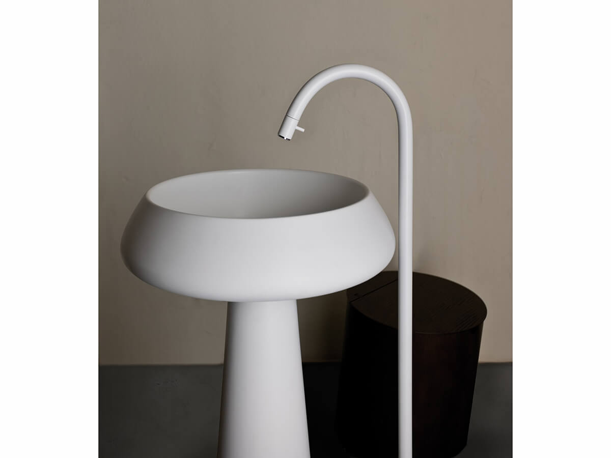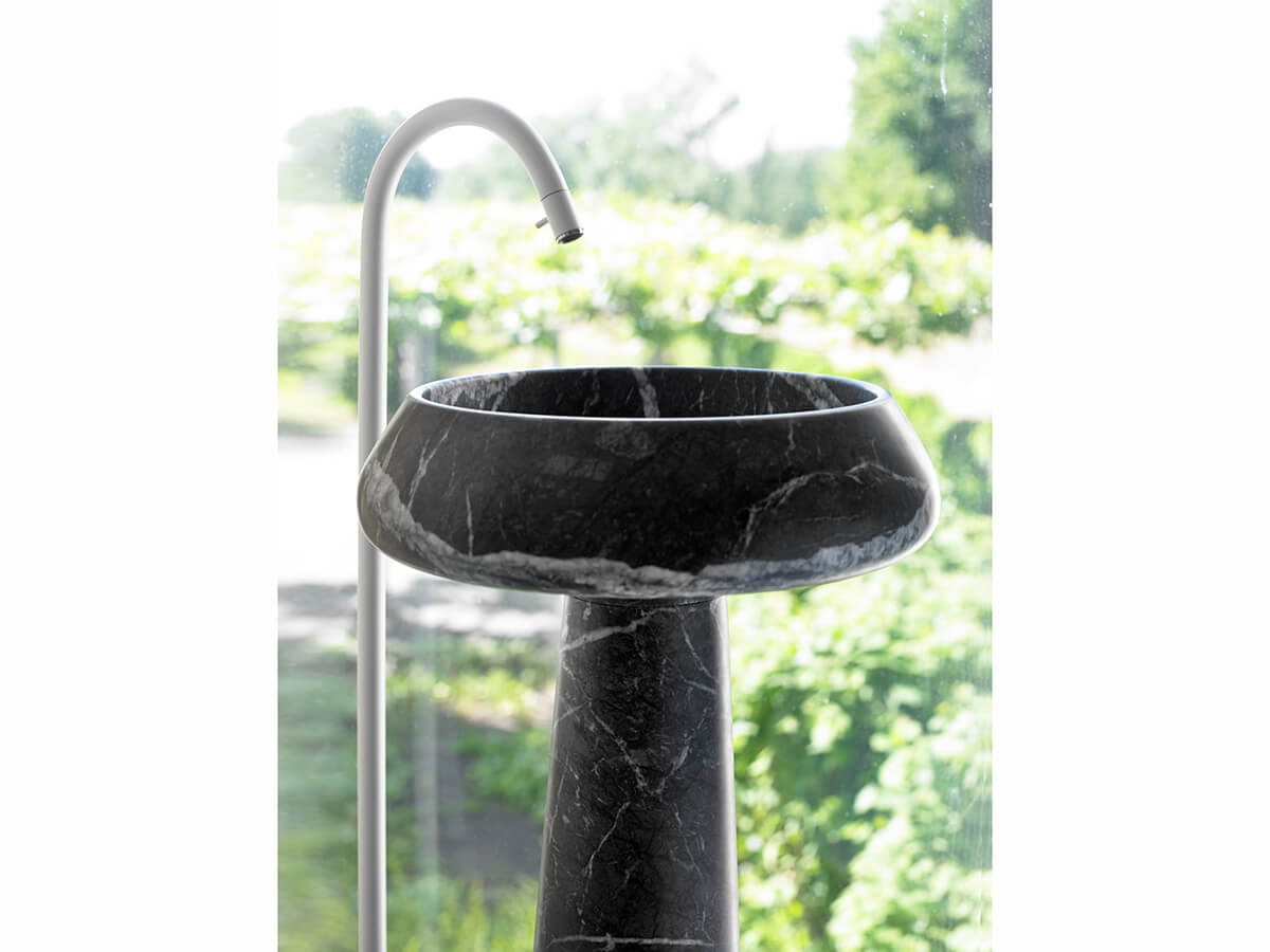 Il lavabo self standing Bjhon di Agape porta la firma di uno dei nomi che hanno fatto la storia del design italiano: Angelo Mangiarotti, di cui Agape sta riproponendo in esclusiva molte delle creazioni più celebri in un’operazione di estrema accuratezza filologica. Disegnato da Mangiarotti nel 1970, Bjhon si caratterizza per l’equilibrio aggraziato delle forme, in cui la monumentalità scultorea non trascende mai in un senso di pesantezza. È disponibile in due versioni: Bjhon 1, in cui la circonferenza del bacino forma un cerchio e perfetto, e Bjhon 2, nel quale invece il bacino lavamani presenta una base più larga e un’apertura più stretta enfatizzando così l’effetto di rotondità. Sono entrambi realizzabili in marmo o in Cristalplant e sono entrambi disponibili anche in versione Outdoor (in questo caso nelle finiture Petit Granit o Cementoskin, adatte all’uso in esterno). Caratteristiche tecniche: la versione Bjhon 2 Outdoor è disponibile solo in Petit Granit