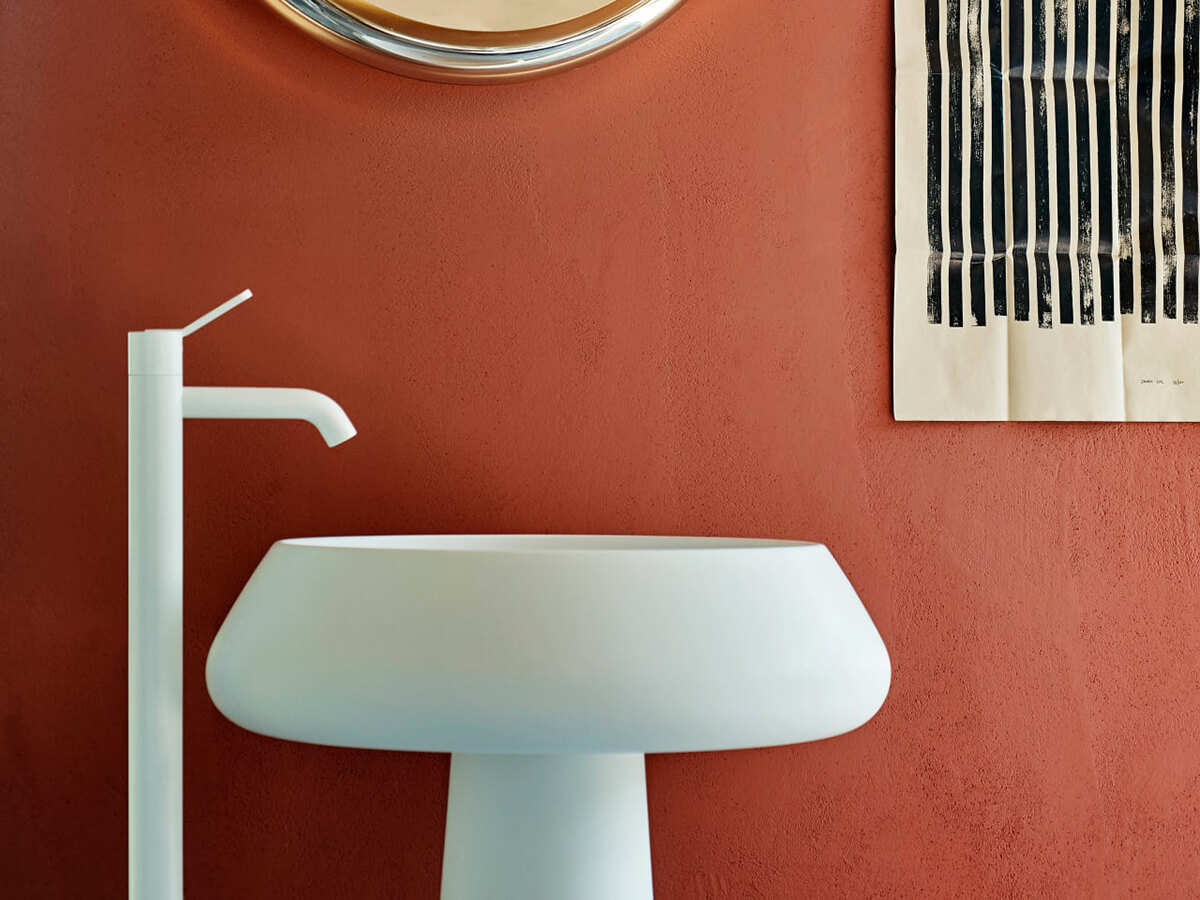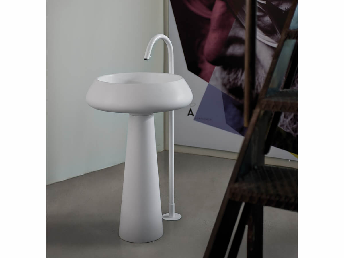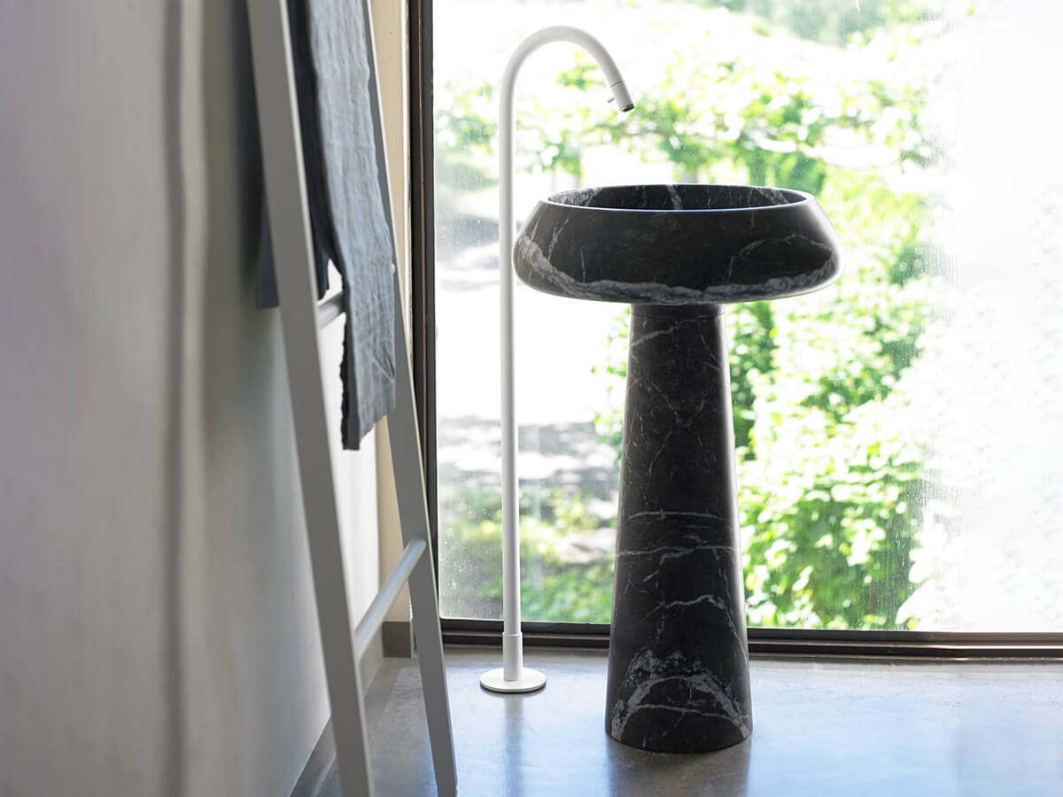 Il lavabo self standing Bjhon di Agape porta la firma di uno dei nomi che hanno fatto la storia del design italiano: Angelo Mangiarotti, di cui Agape sta riproponendo in esclusiva molte delle creazioni più celebri in un’operazione di estrema accuratezza filologica. Disegnato da Mangiarotti nel 1970, Bjhon si caratterizza per l’equilibrio aggraziato delle forme, in cui la monumentalità scultorea non trascende mai in un senso di pesantezza. È disponibile in due versioni: Bjhon 1, in cui la circonferenza del bacino forma un cerchio e perfetto, e Bjhon 2, nel quale invece il bacino lavamani presenta una base più larga e un’apertura più stretta enfatizzando così l’effetto di rotondità. Sono entrambi realizzabili in marmo o in Cristalplant e sono entrambi disponibili anche in versione Outdoor (in questo caso nelle finiture Petit Granit o Cementoskin, adatte all’uso in esterno). Caratteristiche tecniche: la versione Bjhon 2 Outdoor è disponibile solo in Petit Granit
