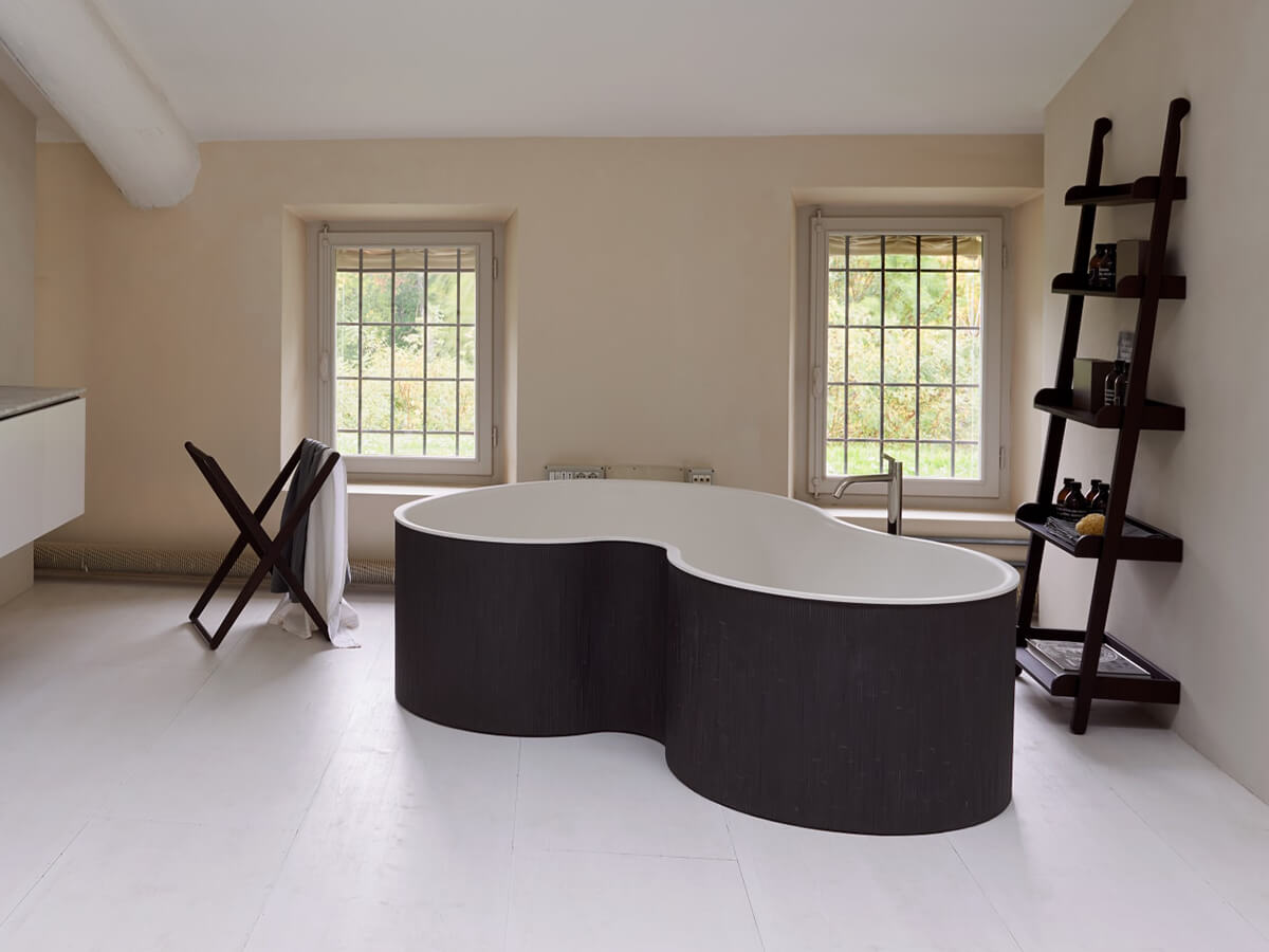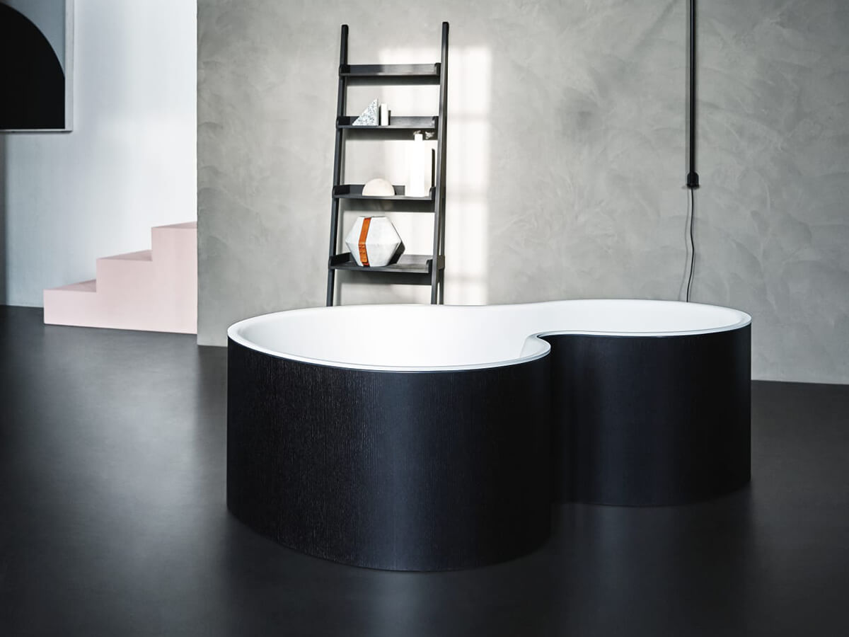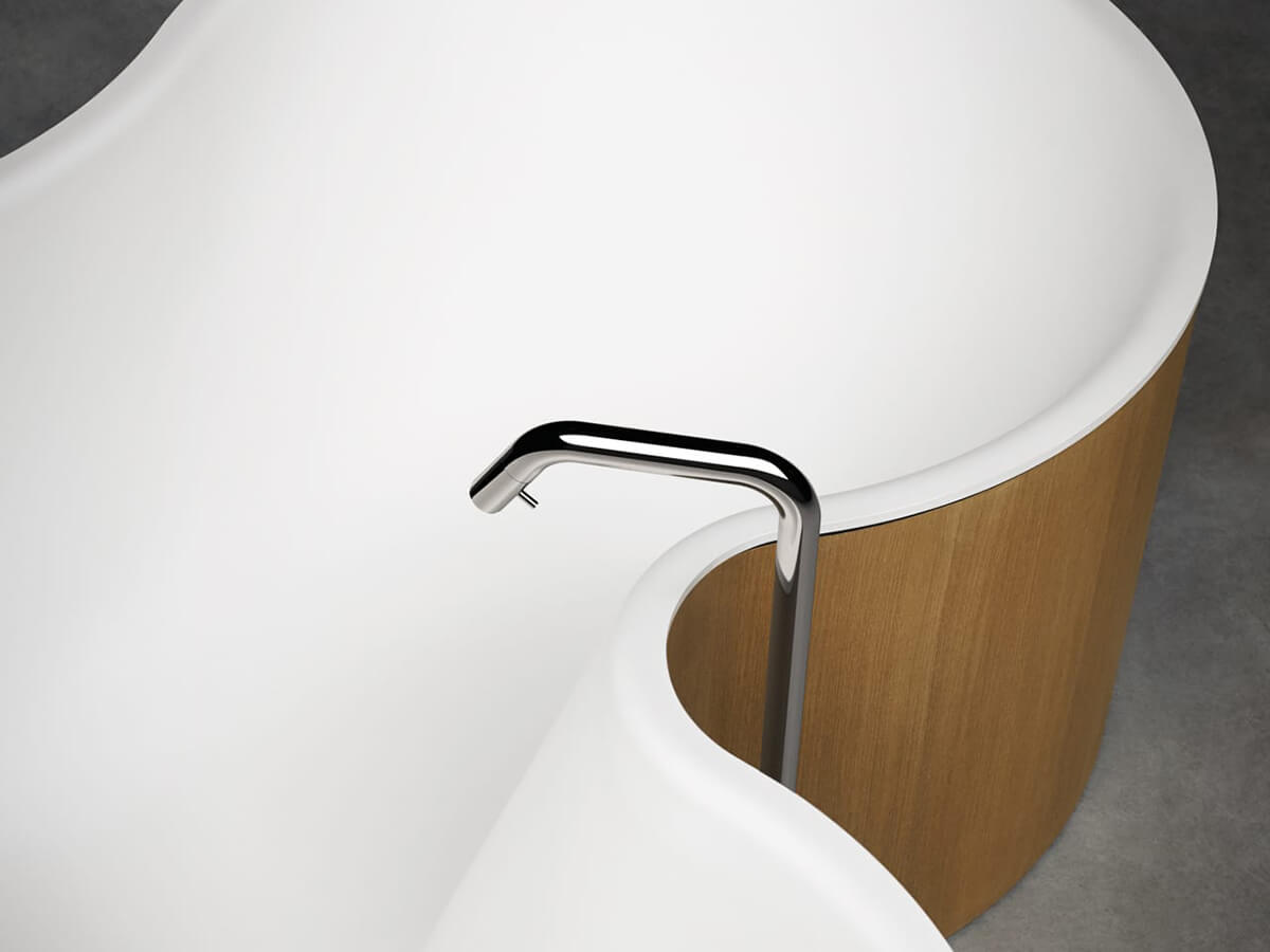 La vasca DR, firmata per Agape dallo studio brasiliano M27 di Marcio Kogan e Mariana Ruzante, è composta da anse sinuose e imprevedibili che le conferiscono un aspetto organico e naturale, simile a una frastagliata linea di costa. Amichevole e accogliente, DR è disponibile in diverse configurazioni: può essere infatti presentata ad incasso nel pavimento, con un effetto fortemente scenografico, oppure in una configurazione self standing nella quale il bacino interno in Solid Surface è ricoperto all’esterno con del legno curvato. È inoltre disponibile anche nella versione DR Cemento, adatta per gli ambienti esterni, anche questa configurabile anche in una versione ad incasso che prende le forme di una piccola piscina.