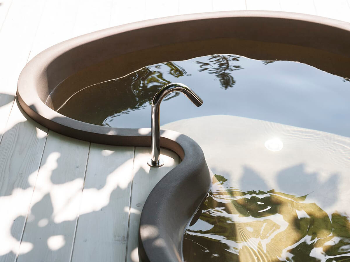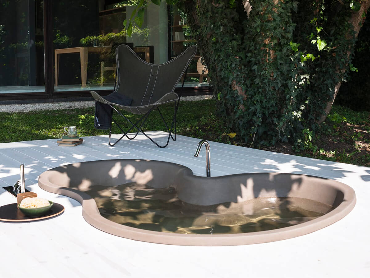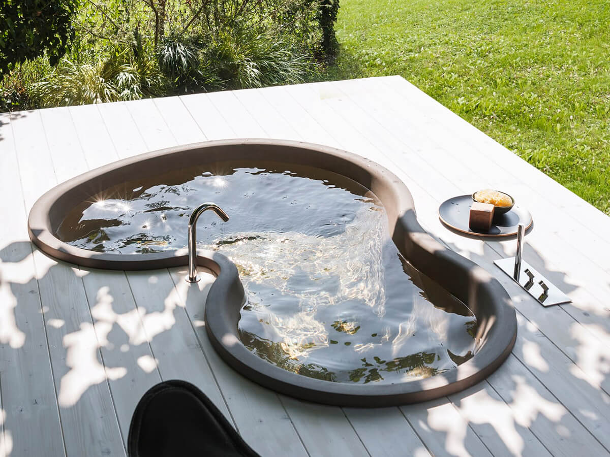 La vasca DR, firmata per Agape dallo studio brasiliano M27 di Marcio Kogan e Mariana Ruzante, è composta da anse sinuose e imprevedibili che le conferiscono un aspetto organico e naturale, simile a una frastagliata linea di costa. Amichevole e accogliente, DR è disponibile in diverse configurazioni: può essere infatti presentata ad incasso nel pavimento, con un effetto fortemente scenografico, oppure in una configurazione self standing nella quale il bacino interno in Solid Surface è ricoperto all’esterno con del legno curvato. È inoltre disponibile anche nella versione DR Cemento, adatta per gli ambienti esterni, anche questa configurabile anche in una versione ad incasso che prende le forme di una piccola piscina.