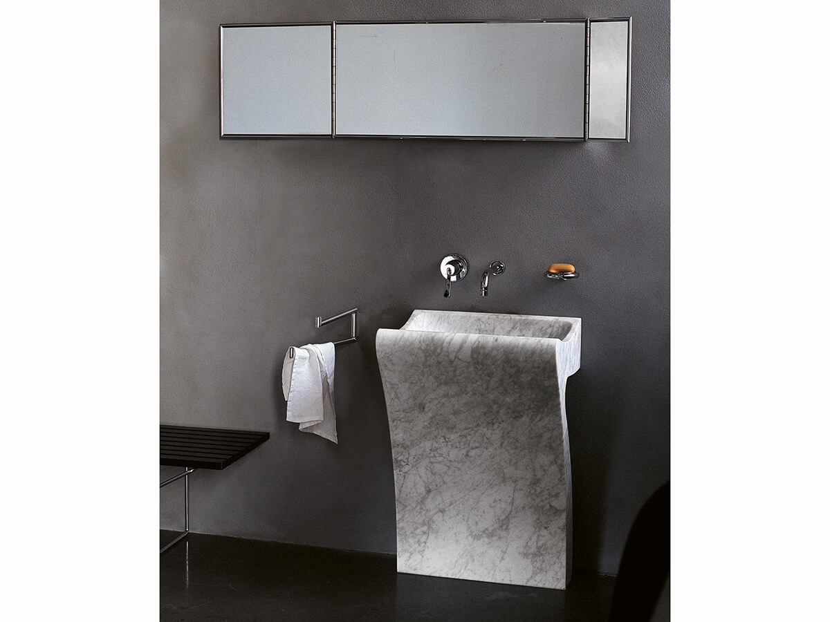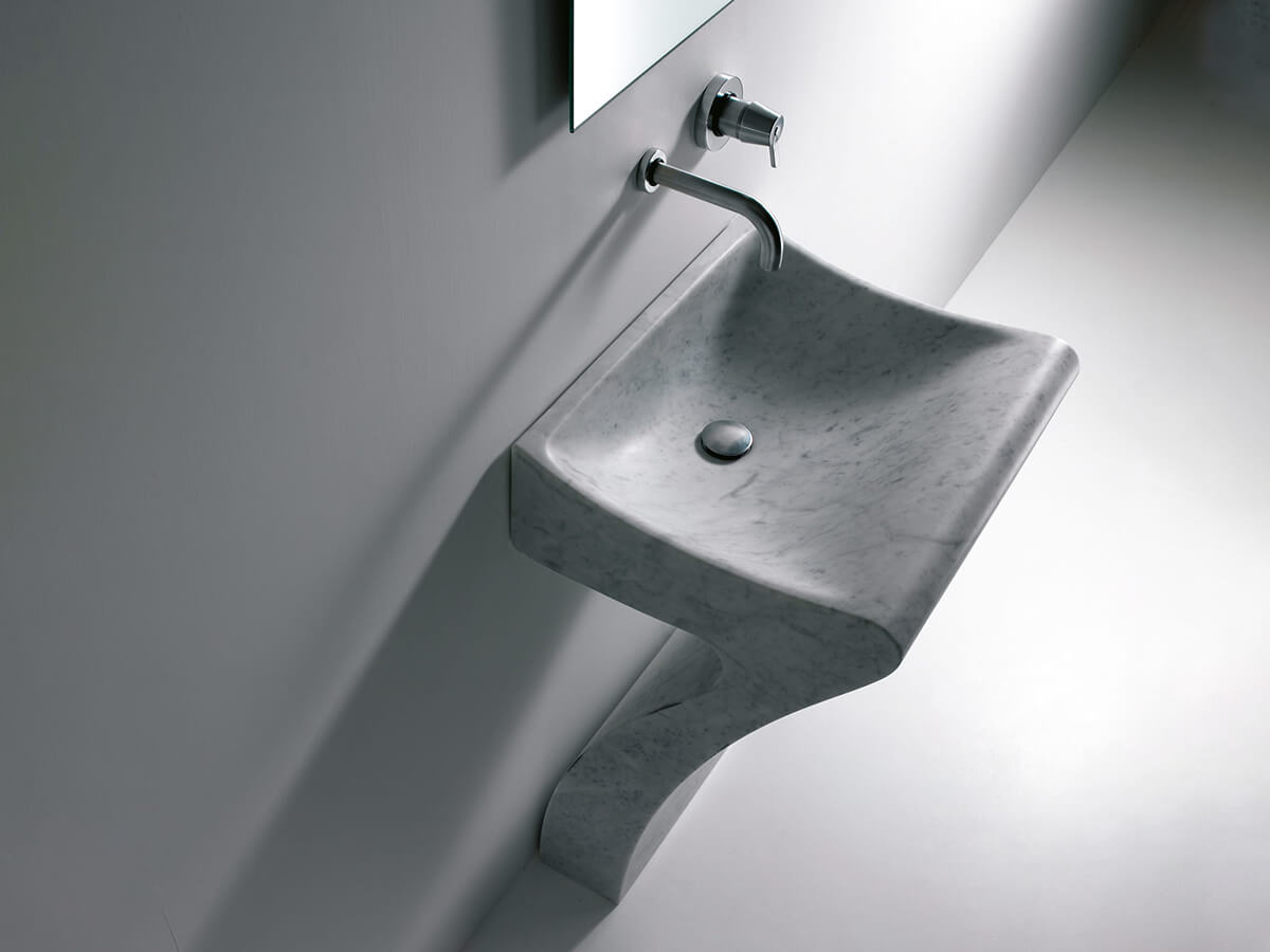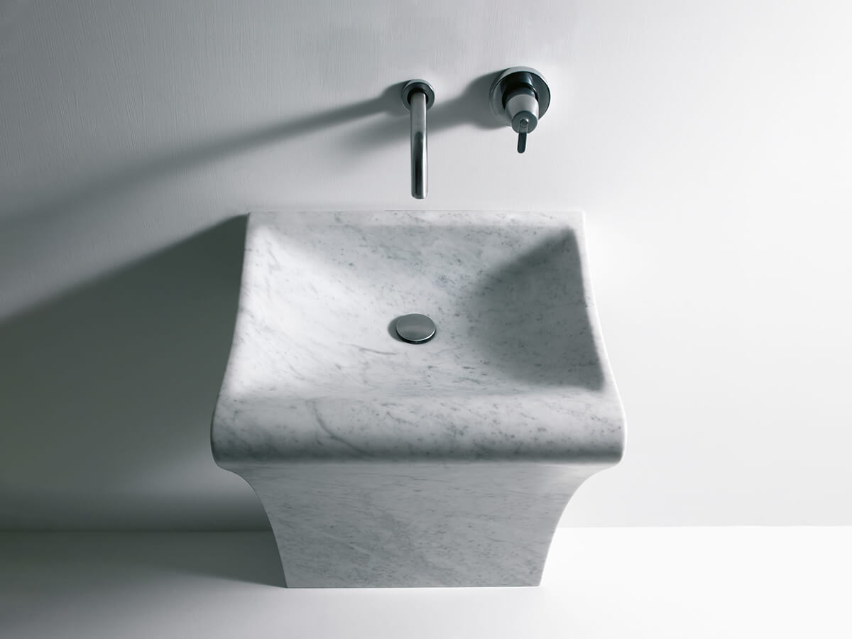 Lito 1 è un lavabo indipendente con appoggio a parete firmato per Agape da Angelo Mangiarotti, uno dei grandi padri fondatori del design italiano. Lito 1 è costituito da un unico blocco in marmo bianco di Carrara a cui il genio di Mangiarotti imprime una forma fluida e dinamica, al contempo compatta e movimentata. Si va così a costituire una piccola scultura il cui profilo ricorda quello di una “L” rovesciata e nel quale il bacino lavamani sul lato superiore si fonde senza soluzione di continuità con l’armonia dell’insieme. Il progetto di Lito 1 risale all’ultimo periodo di attività di Mangiarotti (porta la data del 2003), nel quale la sua progettualità si è arricchita grazie all’esperienza della realizzazione di numerose sculture pubbliche di impianto monumentale, attività che a partire dagli anni ’90 ha affiancato a quella di designer e architetto.