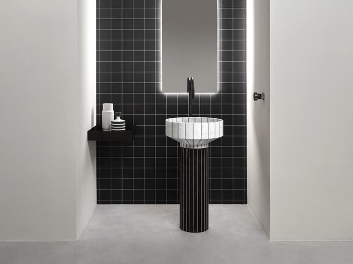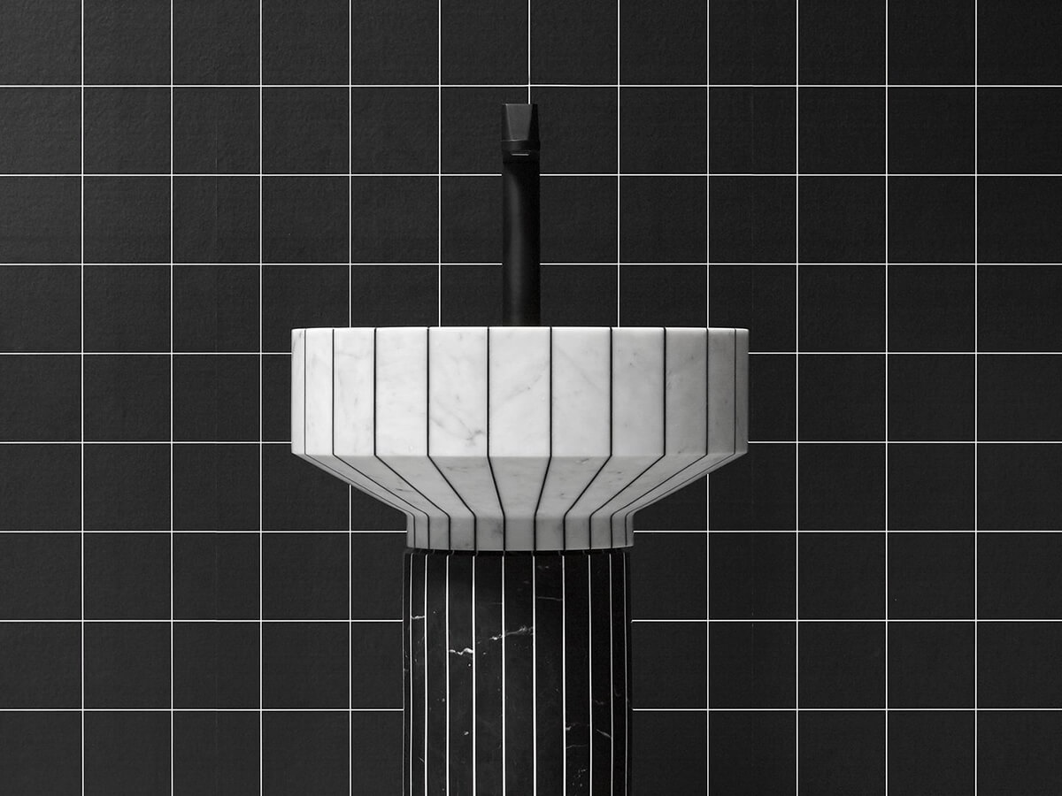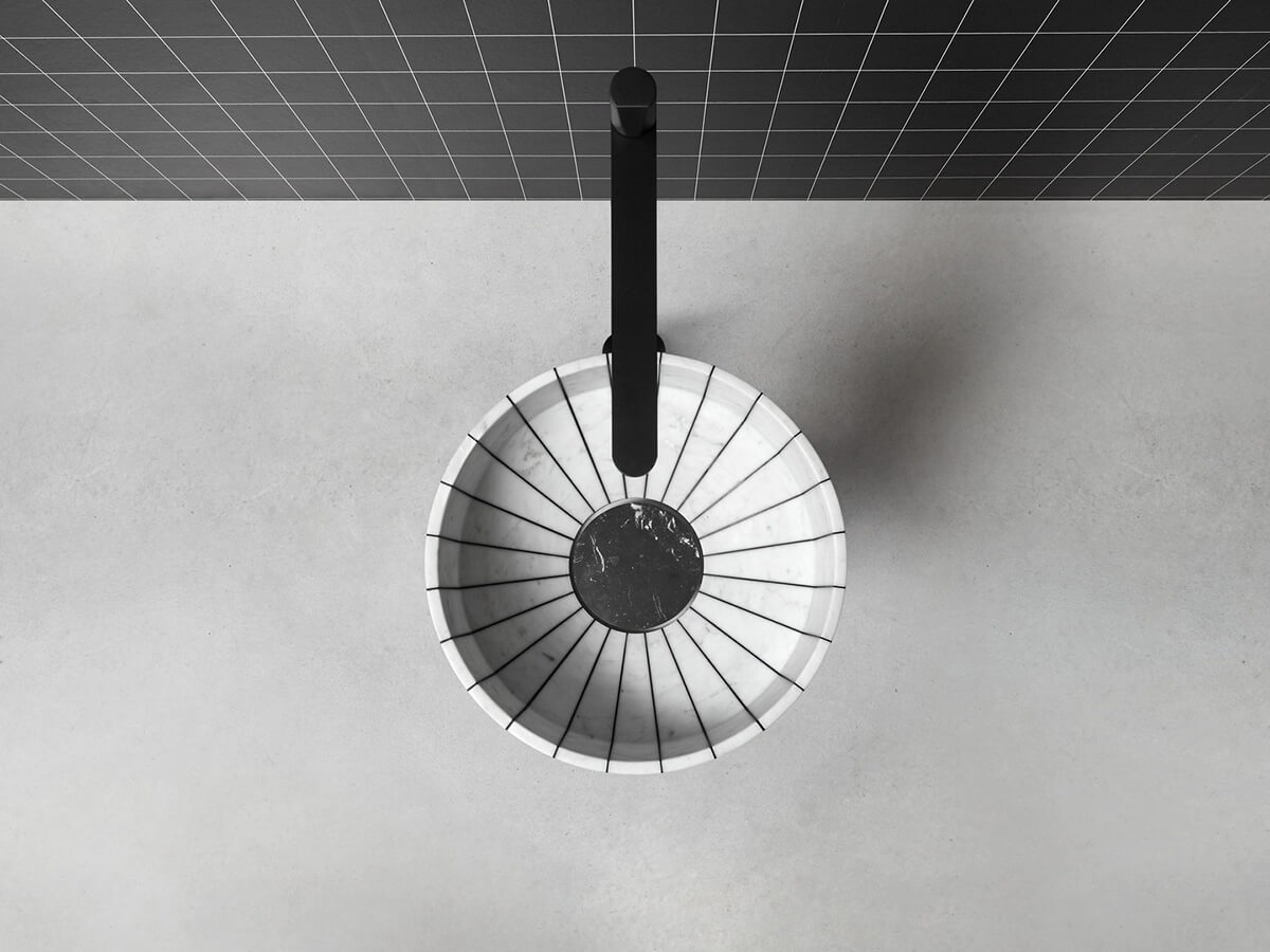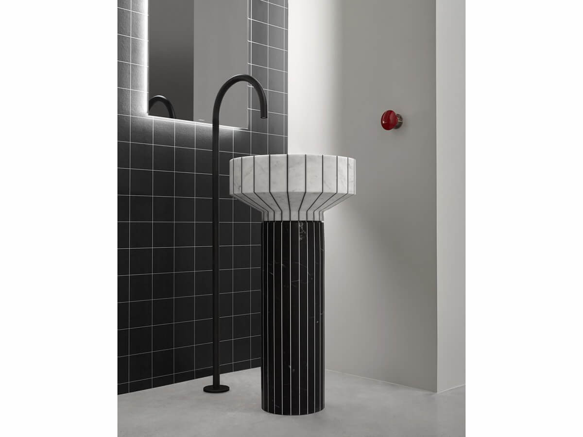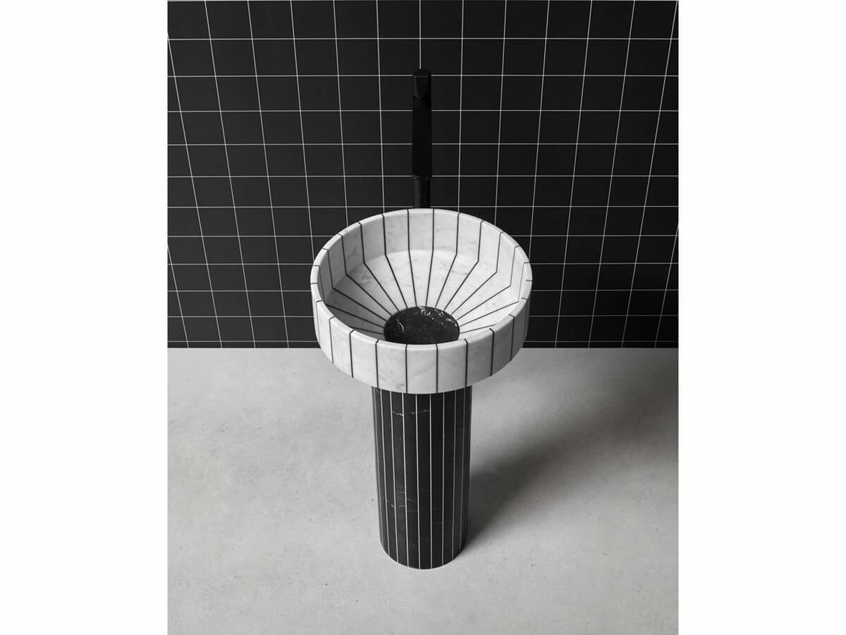 Il modello 024 di Antoniolupi è molto più che un semplice lavabo da terra: sarebbe più corretto considerarlo una vera e propria scultura marmorea, valorizzata da un’eleganza senza tempo e la precisione di lavorazioni complicate e artigianali. Come prefigurato dal nome stesso, è costituito da 24 spicchi di marmo (Nero Marquinia per la base, Bianco Carrara per il bacino lavamani), tenuti uniti da sottili strisce di resina colorata a contrasto. Il risultato finale vede un gioco di bianchi e di neri contrapposti in una solenne geometria dal marcato effetto ottico, portando così ad una percezione allargata di forme e volumi unito a un senso di piana armonia di matrice classicheggiante.
