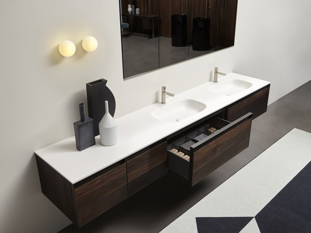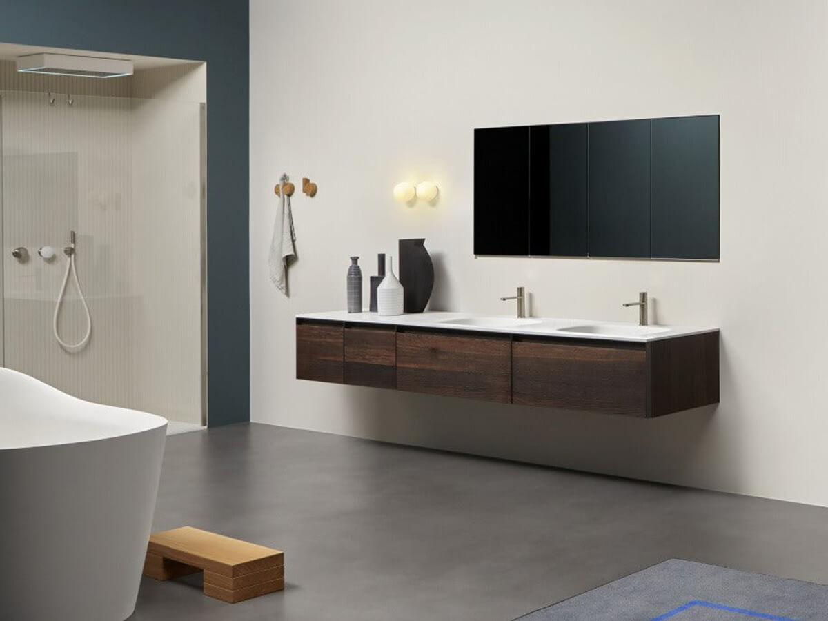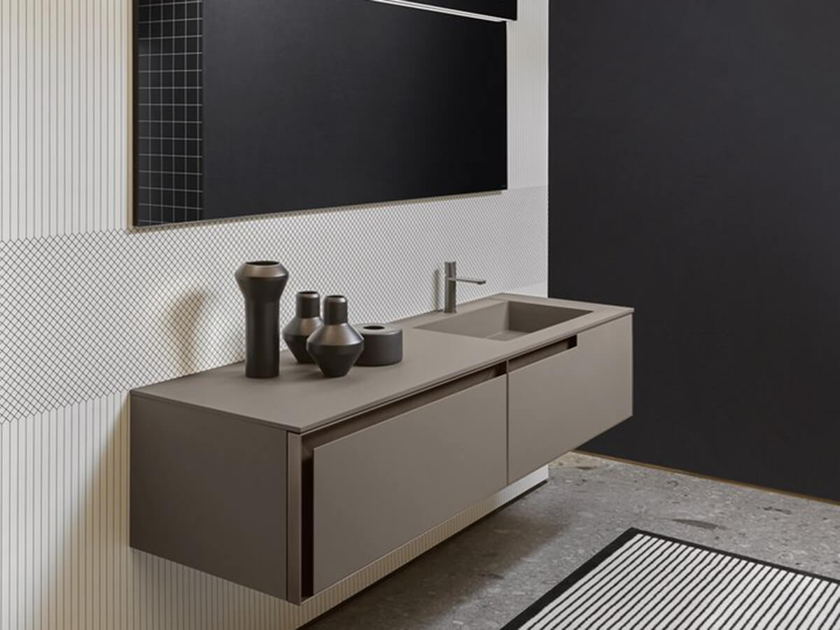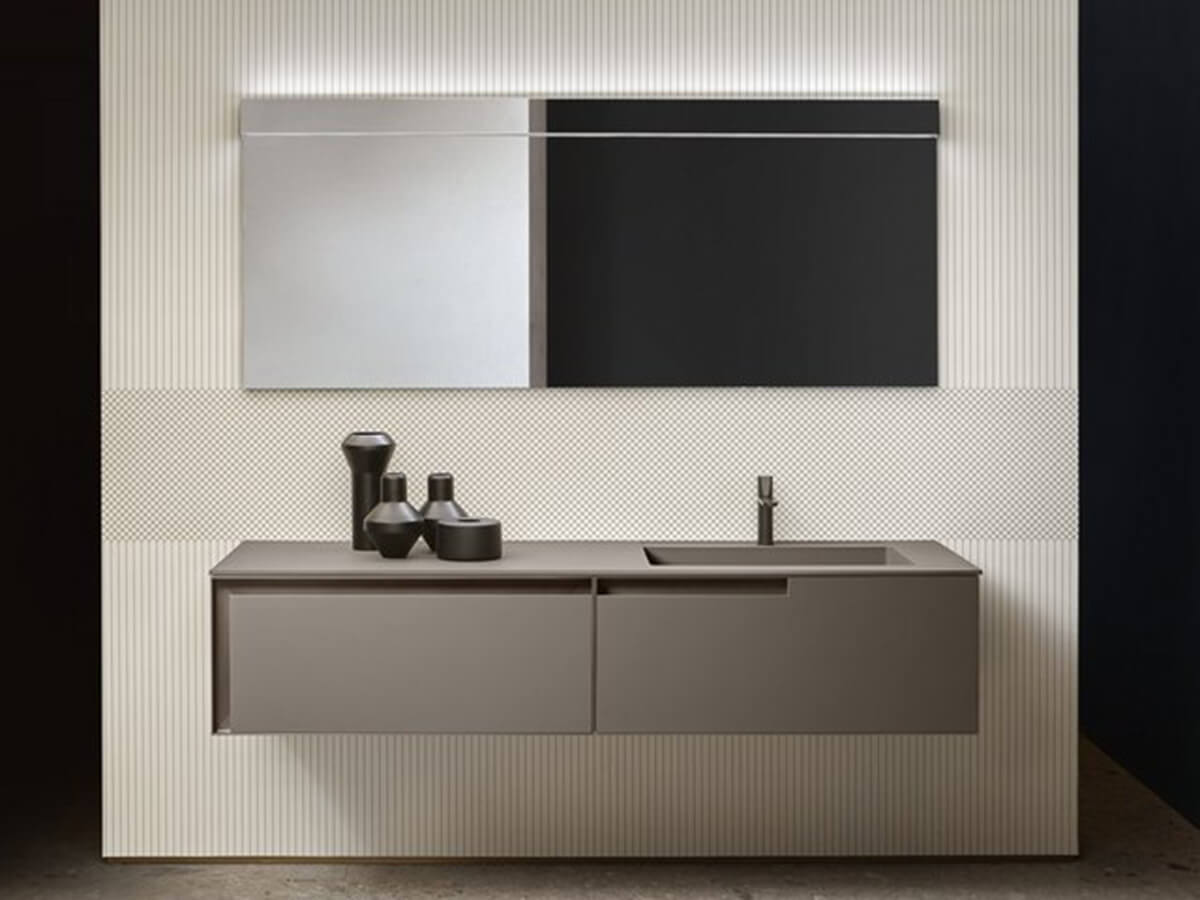 Il mobile bagno Atelier di Antoniolupi presenta una lavorazione dell’anta molto caratteristica e fortemente espressiva che nel suo gioco di vuoti e di pieni va a creare un andamento raffinatamente scultoreo. Nata da un’idea del designer Mario Ferrarini, l’anta della collezione Bemade consta di un profilo in alluminio a cui è sovrapposto un più piccolo frontale in legno (in essenza oppure laccato). Le aree lasciate scoperte dl frontale vanno così a formare delle gole, che possono essere posizionate nella parte superiore dell’anta, ma anche sui lati oppure tutto intorno al frontale, formando così intorno ad esso una sorta di cornice. Accanto alle funzioni di apertura queste gole vanno così a comporre in Atelier un vero e proprio disegno astratto dal forte impatto scenografico.