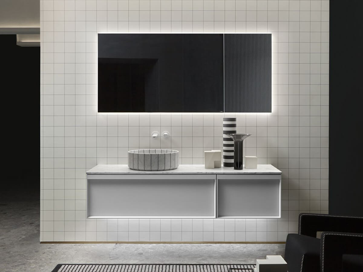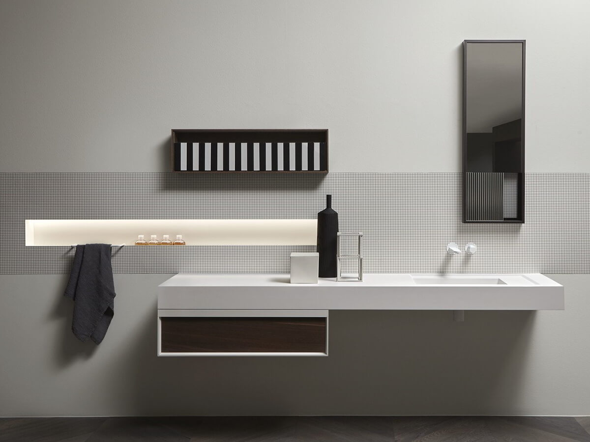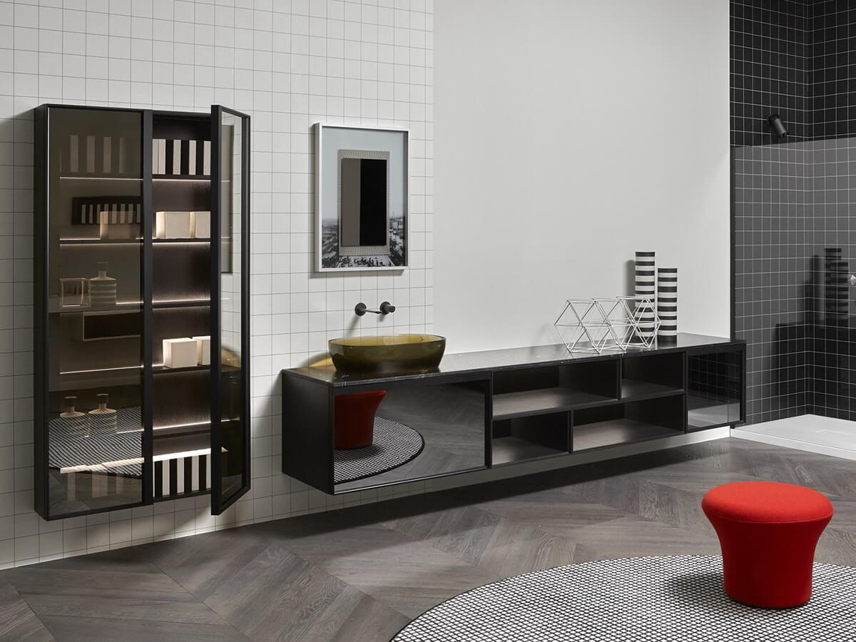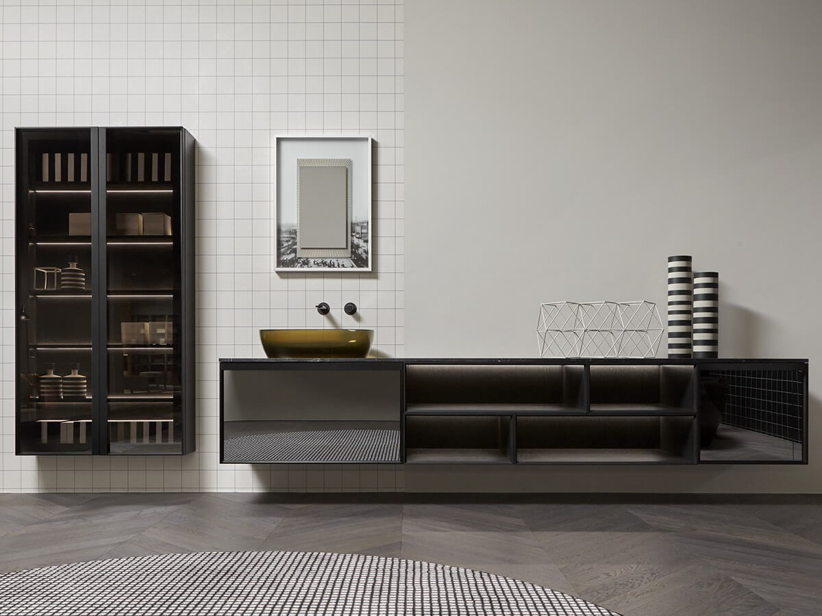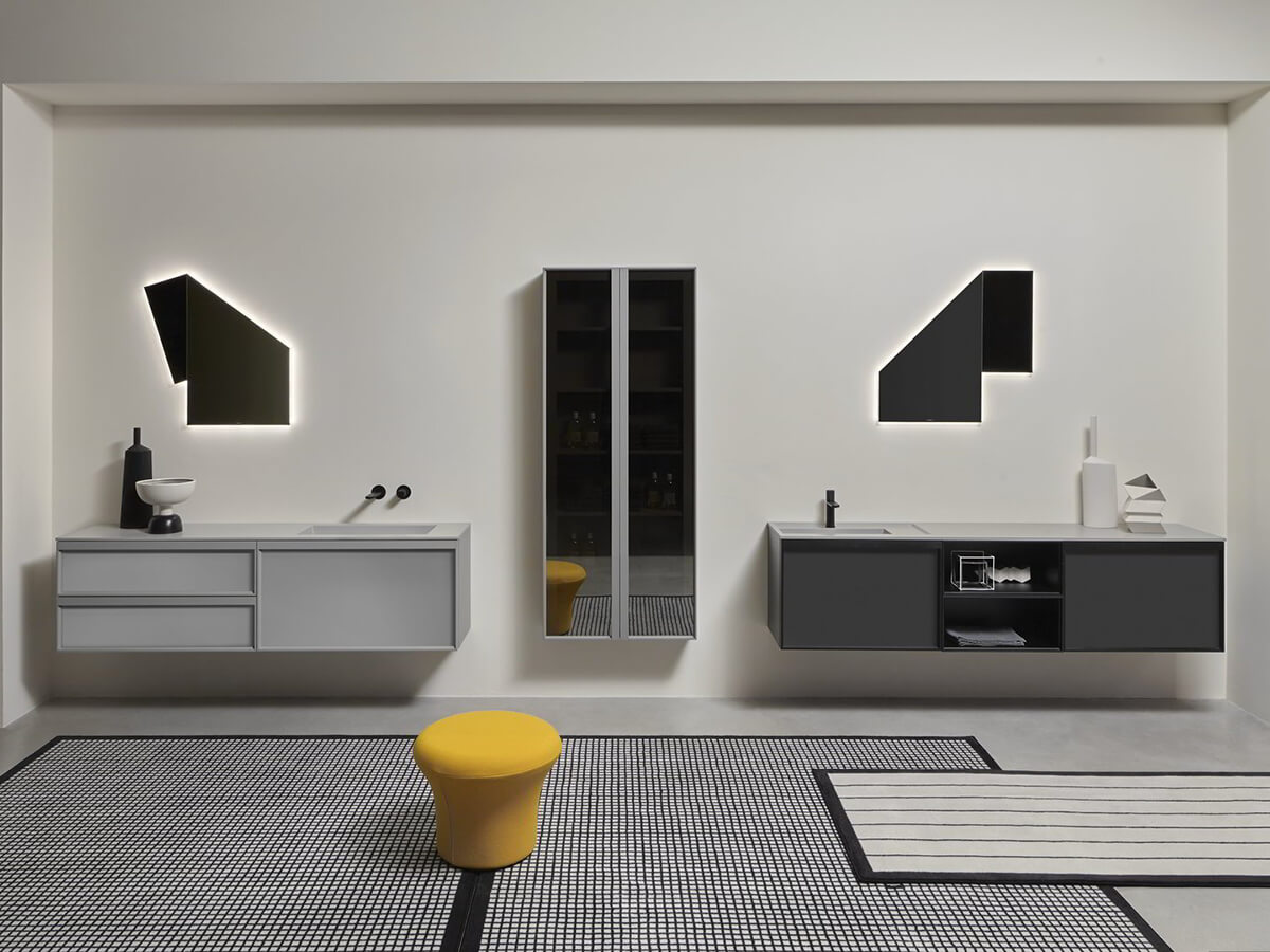 La serie di mobili bagno Bemade è una delle collezioni più complesse e raffinate proposte dal brand. Il rigore delle forme, il forte segno grafico delle cornici e la grande varietà dei materiali danno vita con Bemade a una vera e propria “architettura domestica”, capace di valorizzare un ambiente di uso quotidiano quale il bagno come pochi arredi prima d’ora. Sua caratteristica chiave è un’attenzione all’equilibrio e alle proporzioni di stampo quasi Rinascimentale (non per niente Antoniolupi getta le sue radici nel cuore della Toscana, a pochi chilometri da Firenze), che trova massima espressione nell’equilibrata cornice aggettante dei frontali. Le ante possono essere realizzate in una grande varietà di materiali, dai vetri di ogni tipo alle essenze più pregiate, e possono essere intervallate anche da pratici vani a giorno.