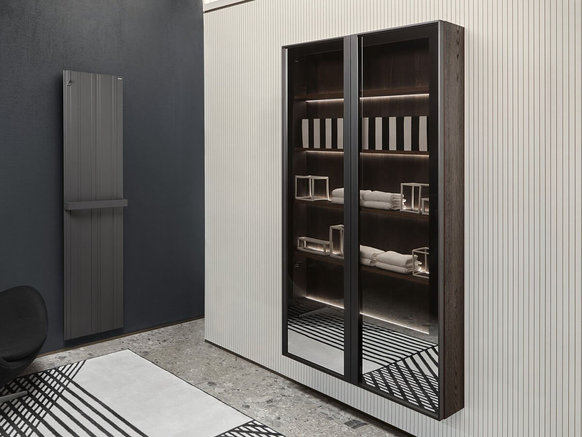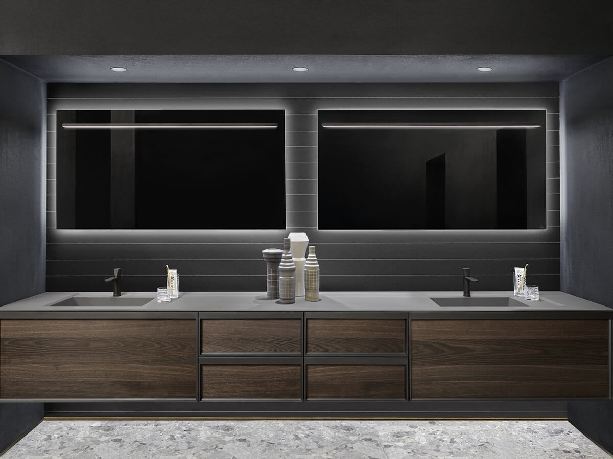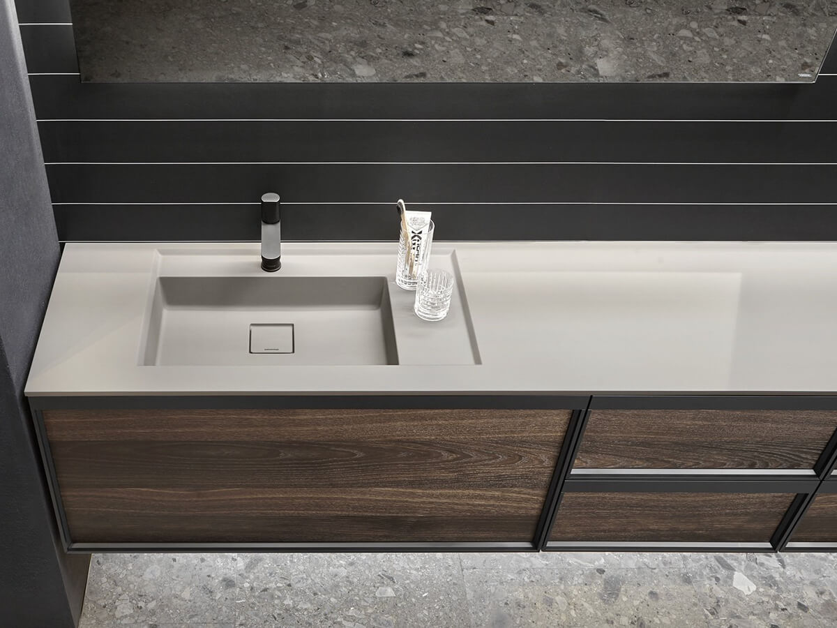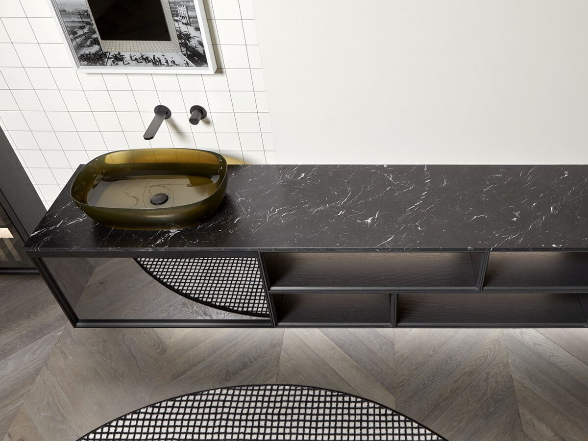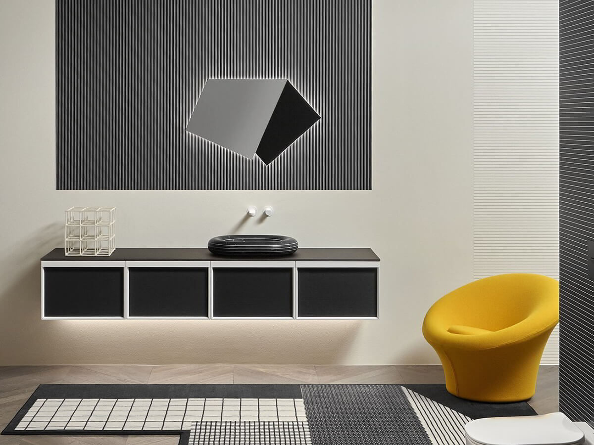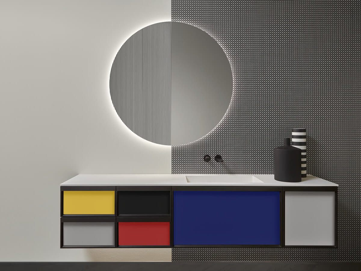 La serie di mobili bagno Bemade è una delle collezioni più complesse e raffinate proposte dal brand. Il rigore delle forme, il forte segno grafico delle cornici e la grande varietà dei materiali danno vita con Bemade a una vera e propria “architettura domestica”, capace di valorizzare un ambiente di uso quotidiano quale il bagno come pochi arredi prima d’ora. Sua caratteristica chiave è un’attenzione all’equilibrio e alle proporzioni di stampo quasi Rinascimentale (non per niente Antoniolupi getta le sue radici nel cuore della Toscana, a pochi chilometri da Firenze), che trova massima espressione nell’equilibrata cornice aggettante dei frontali. Le ante possono essere realizzate in una grande varietà di materiali, dai vetri di ogni tipo alle essenze più pregiate, e possono essere intervallate anche da pratici vani a giorno.