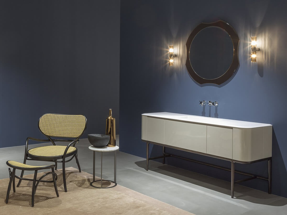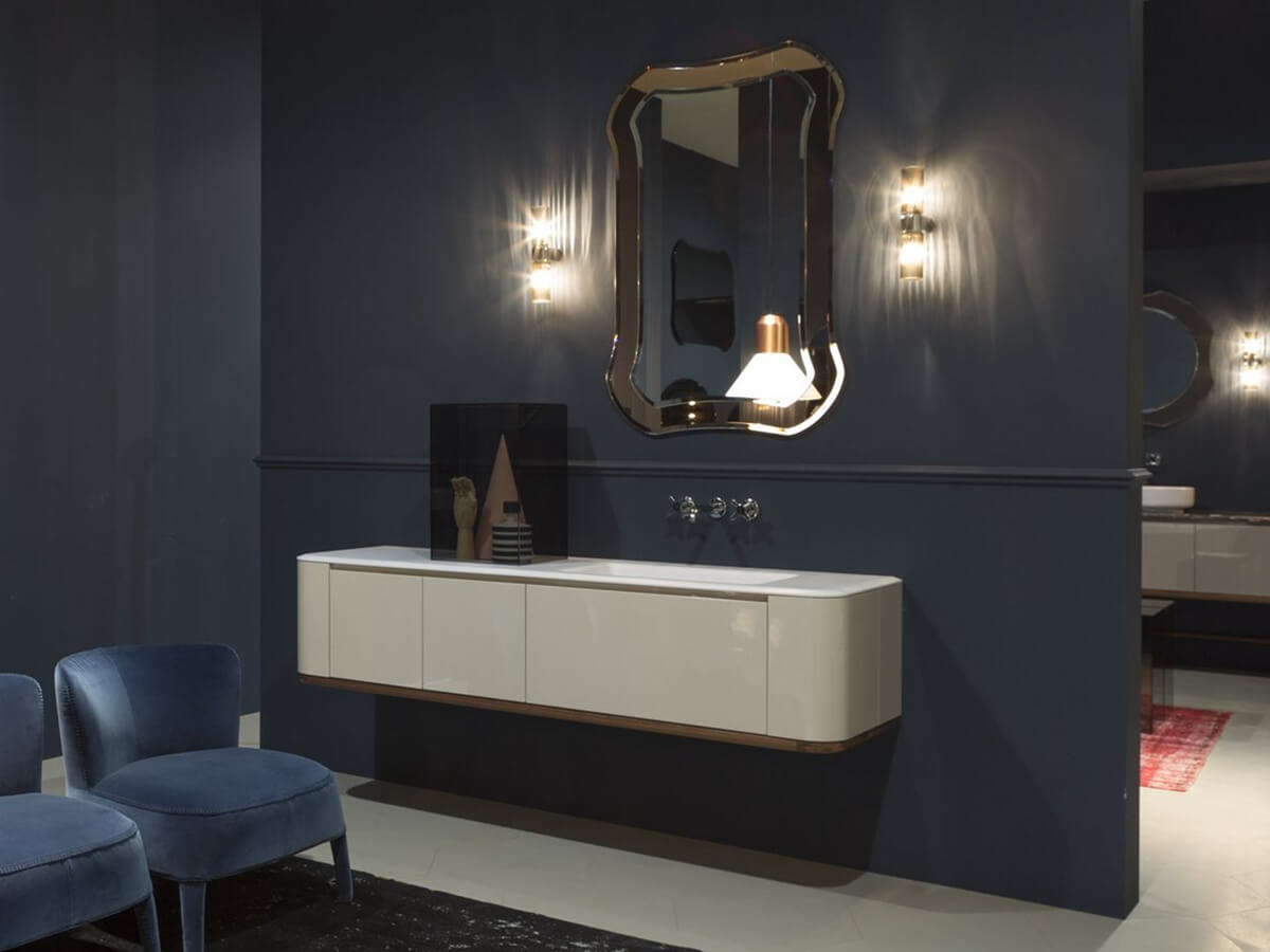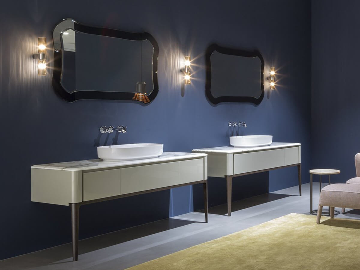Nell’esclusiva collezione “IlBagno”, firmata da Roberto Lazzeroni, Antoniolupi deroga eccezionalmente ai suoi consolidati principi di modernissima purezza per proporre una linea deliziosamente retrò, dal segno borghese e fortemente decorativo. Un omaggio al “bagno dei nonni” che, pure nel gusto delle citazioni passatiste, non rinuncia comunque a cercare un equilibrio sottile fra memorie e presente, senza poi perdere di vista la massima funzionalità. Ne nasce coì una linea variegata, in cui le composizioni sospese presentano dolci angoli fortemente stondati ma non presentano maniglie o altri orpelli inessenziali, limitandosi a una sobria apertura a gola. Le basi possono poggiare anche su due sottili puntali o in legno o in metallo o su basi più strutturate che rendono autoportanti le composizioni.