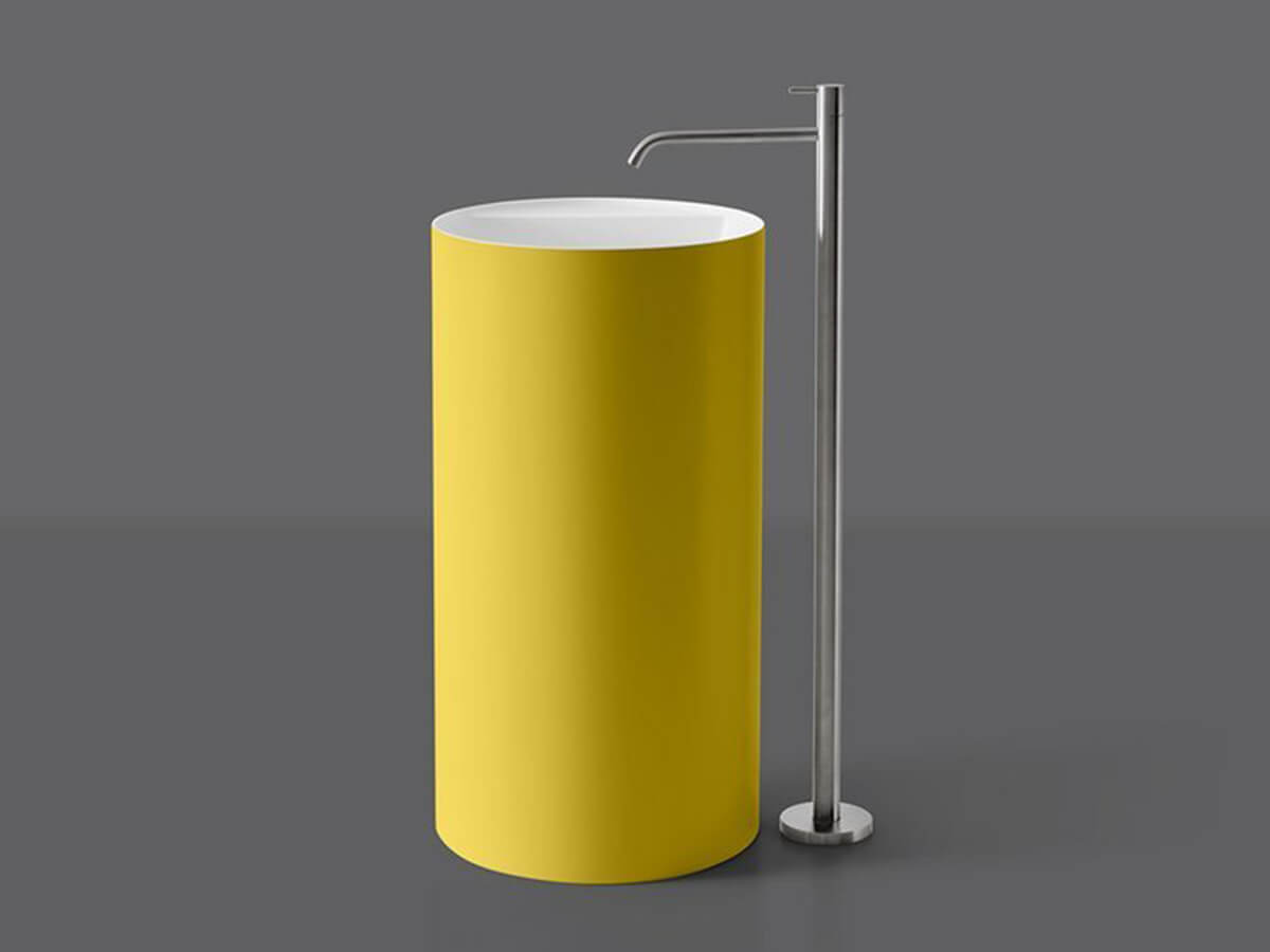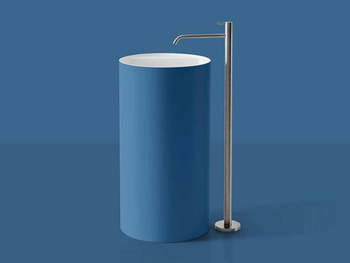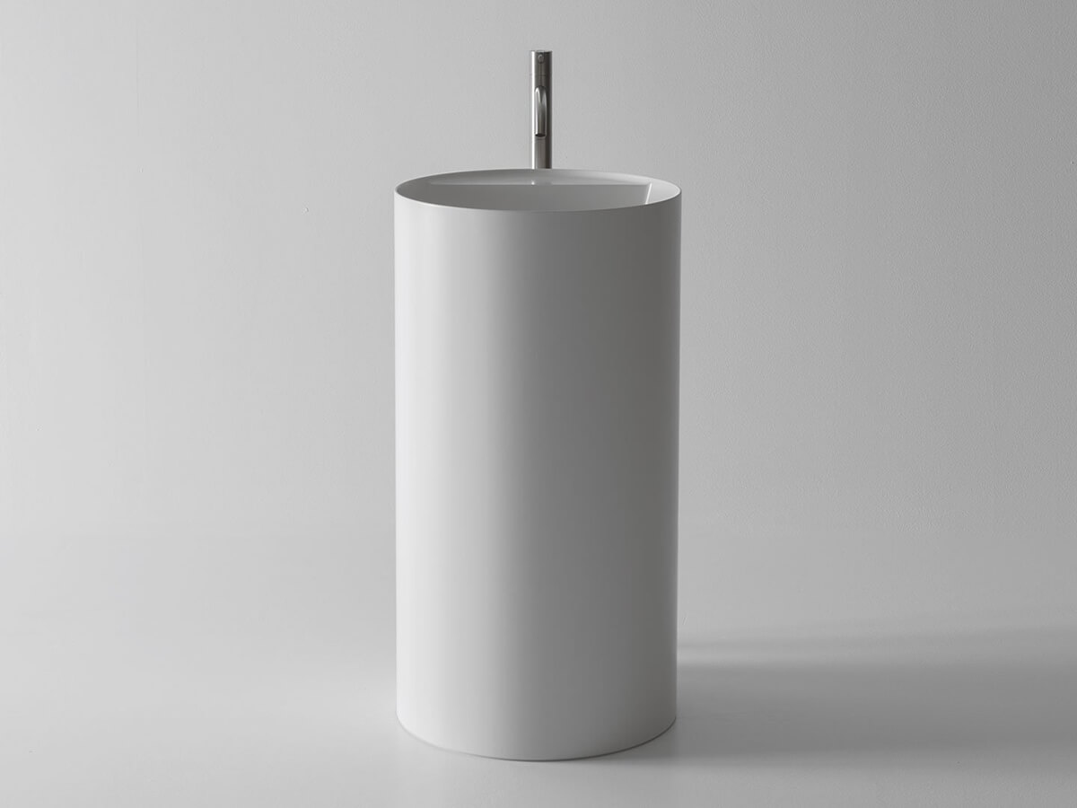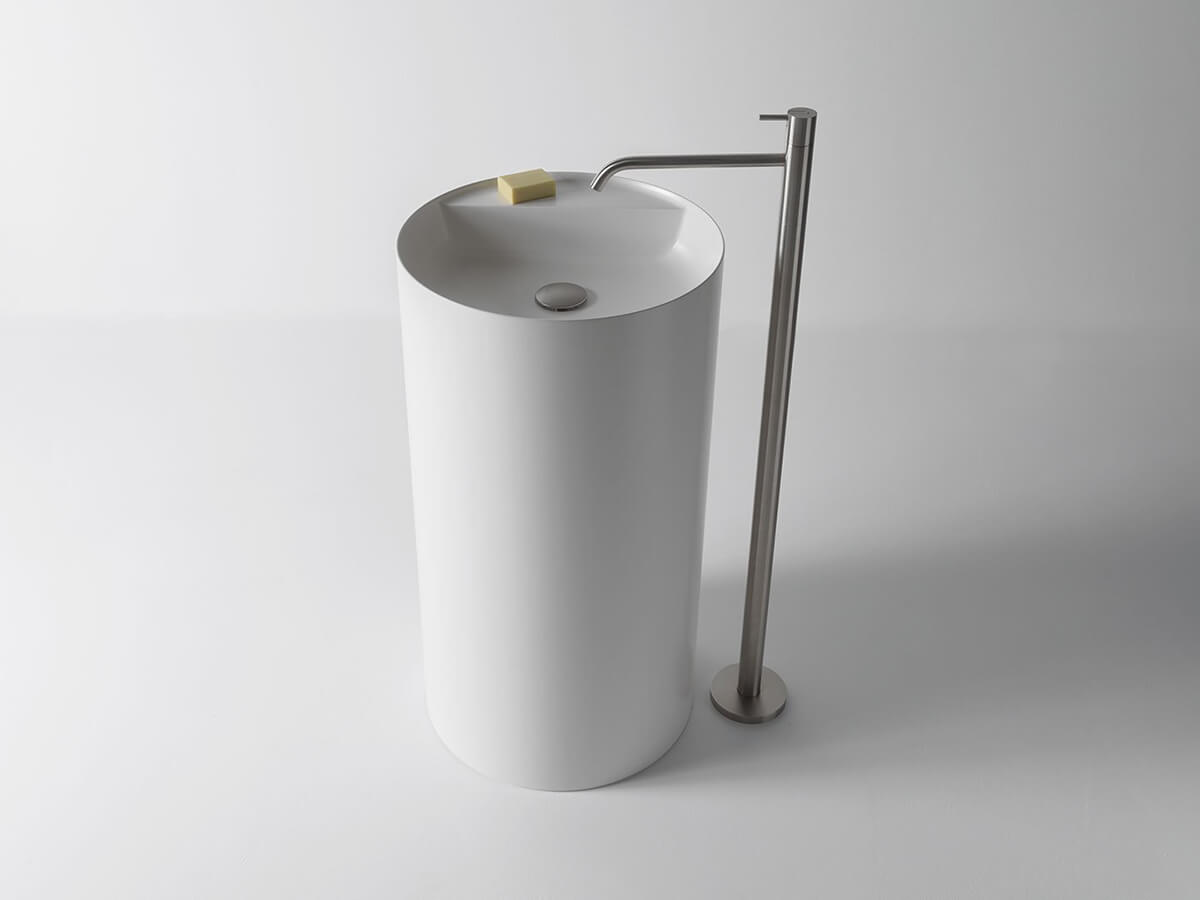 Il lavabo freestanding Simplo85 di Antoniolupi fa della semplicità la sua arma vincente: la purissima forma cilindrica, totalmente priva di angoli, dà vita a un prodotto suggestivo e versatile, adatto per ogni genere di bagno. Nella tradizionale versione in Flumood total white, asciutta e versatile, si sposa alla perfezione con gli ambienti più diversi, mentre con gli esterni in Flumood o Colormood colorato può dare vita a composizioni più vezzose ed eclettiche. La vasca lavamani di Simplo85 non è perfettamente stondata ma presenta un pianetto d’appoggio laterale sul quale può essere posizionato il miscelatore, disponibile comunque anche nella classica versione da terra.