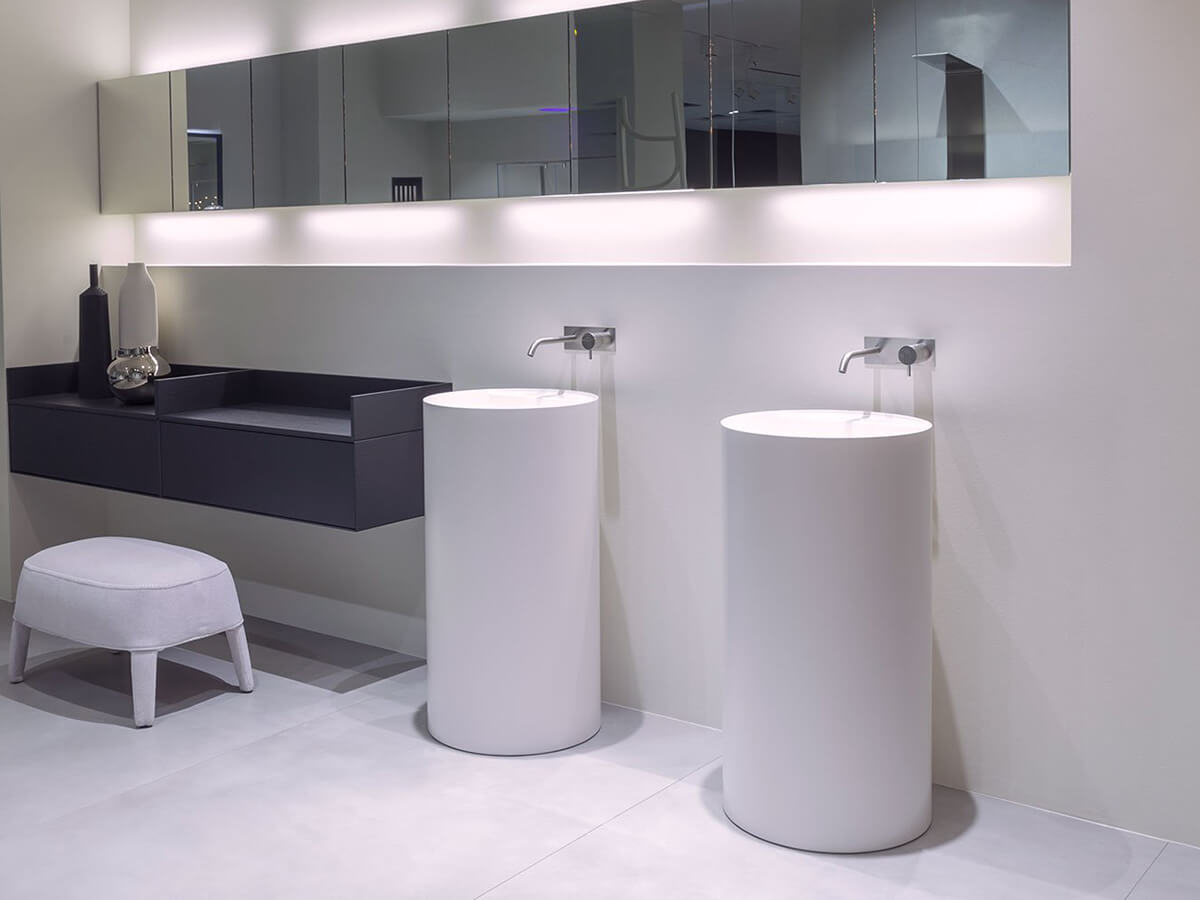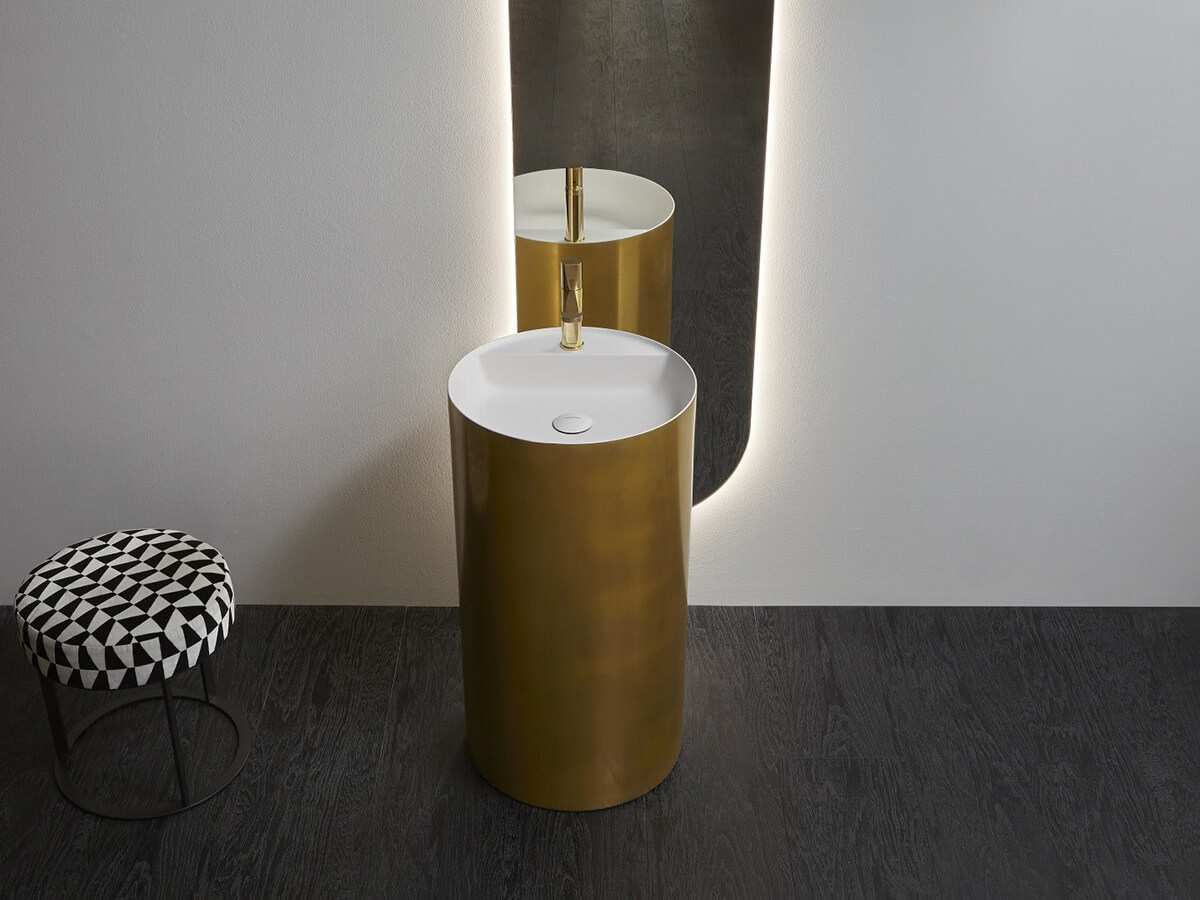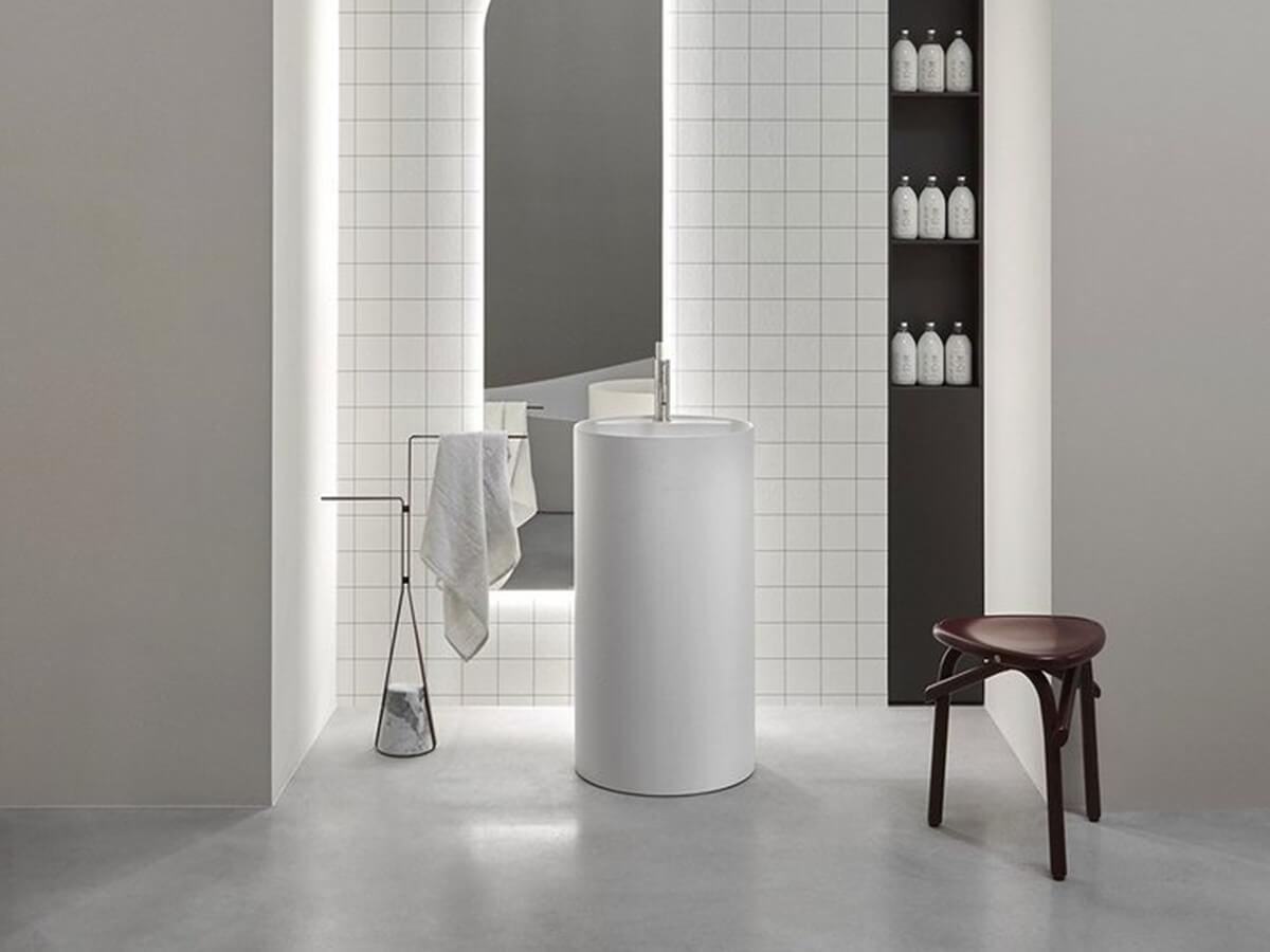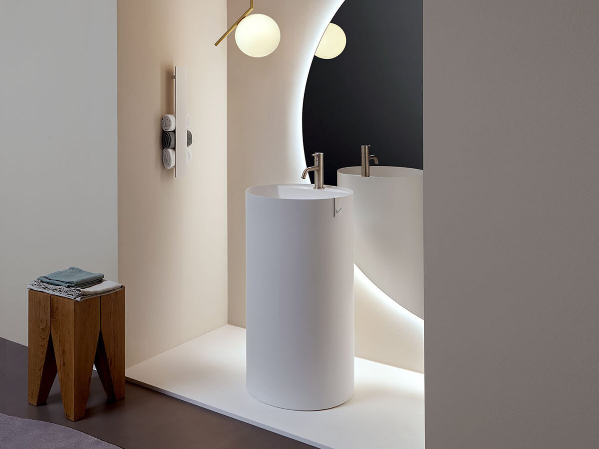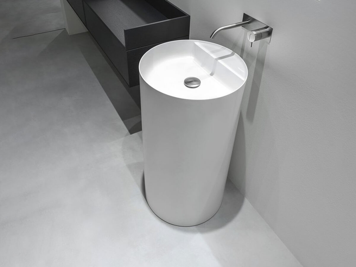 Il lavabo freestanding Simplo85 di Antoniolupi fa della semplicità la sua arma vincente: la purissima forma cilindrica, totalmente priva di angoli, dà vita a un prodotto suggestivo e versatile, adatto per ogni genere di bagno. Nella tradizionale versione in Flumood total white, asciutta e versatile, si sposa alla perfezione con gli ambienti più diversi, mentre con gli esterni in Flumood o Colormood colorato può dare vita a composizioni più vezzose ed eclettiche. La vasca lavamani di Simplo85 non è perfettamente stondata ma presenta un pianetto d’appoggio laterale sul quale può essere posizionato il miscelatore, disponibile comunque anche nella classica versione da terra.