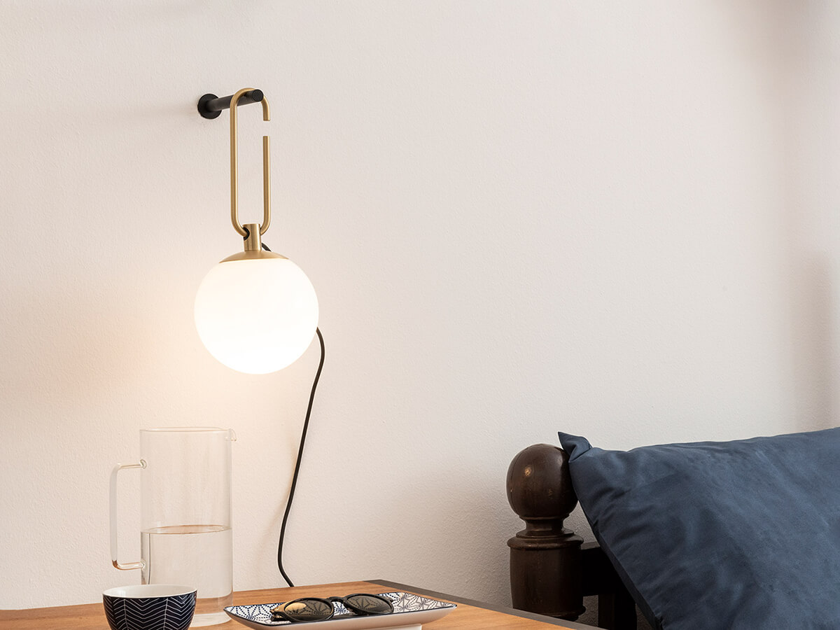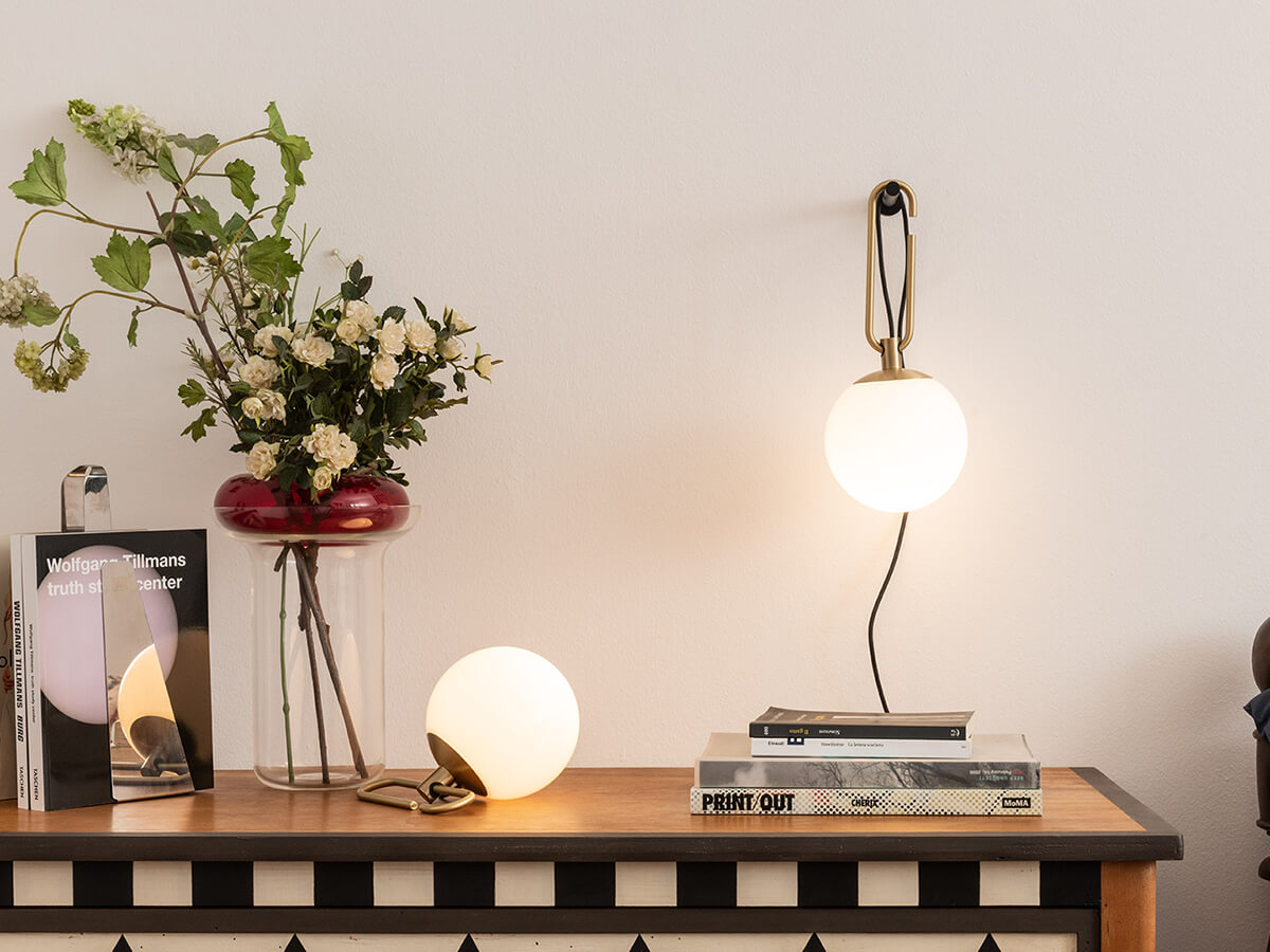 Una lampada dal design semplice e di estrema eleganza, capace di catturare l’attenzione per la forte versatilità che sembra averla ispirata. La struttura si compone di una sfera in vetro soffiato bianca agganciata a un anello in ottone spazzolato che le permette di assumere diverse posizioni scorrendo sull’asta fissata alla parete. Nella sua versione da parete, NH spicca per gusto e cura di ogni dettaglio che ben la collocano in situazioni eterogenee di spazi living, notte e uffici, senza però trascurare situazioni più pubbliche. Originariamente nata dalla versione da tavolo, NH ha in seguito incrementato le proprie conformazioni per meglio adattarsi alle esigenze della casa moderna.