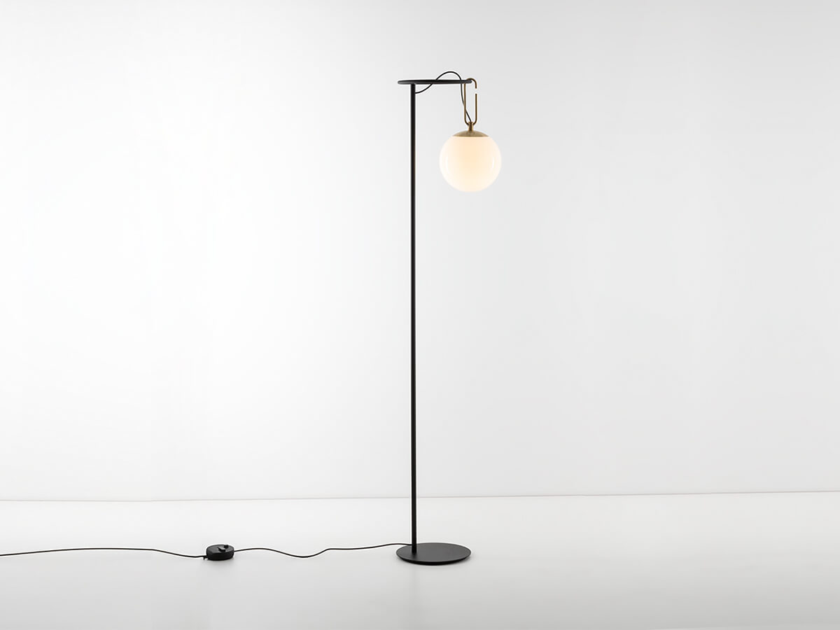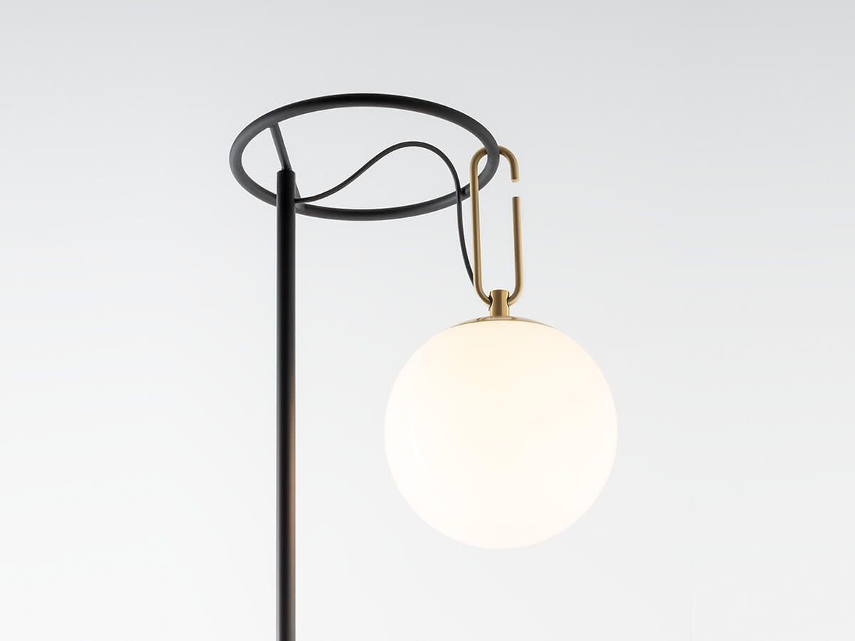Una lampada dal design semplice e di estrema eleganza, capace di catturare l’attenzione per la forte versatilità che sembra averla ispirata. La struttura si compone di una sfera in vetro soffiato bianca agganciata a un anello in ottone spazzolato che le permette di assumere diverse posizioni a seconda di come si decida di collocare il supporto. Nella sua versione da terra, NH spicca per gusto e cura di ogni dettaglio che ben la collocano in situazioni eterogenee di spazi living, notte e uffici, senza però trascurare situazioni più pubbliche. Originariamente nata dalla versione da tavolo, NH ha in seguito incrementato le proprie conformazioni per meglio adattarsi alle esigenze della casa moderna.