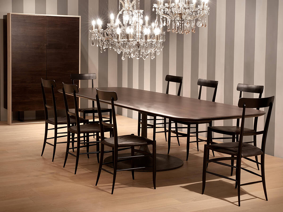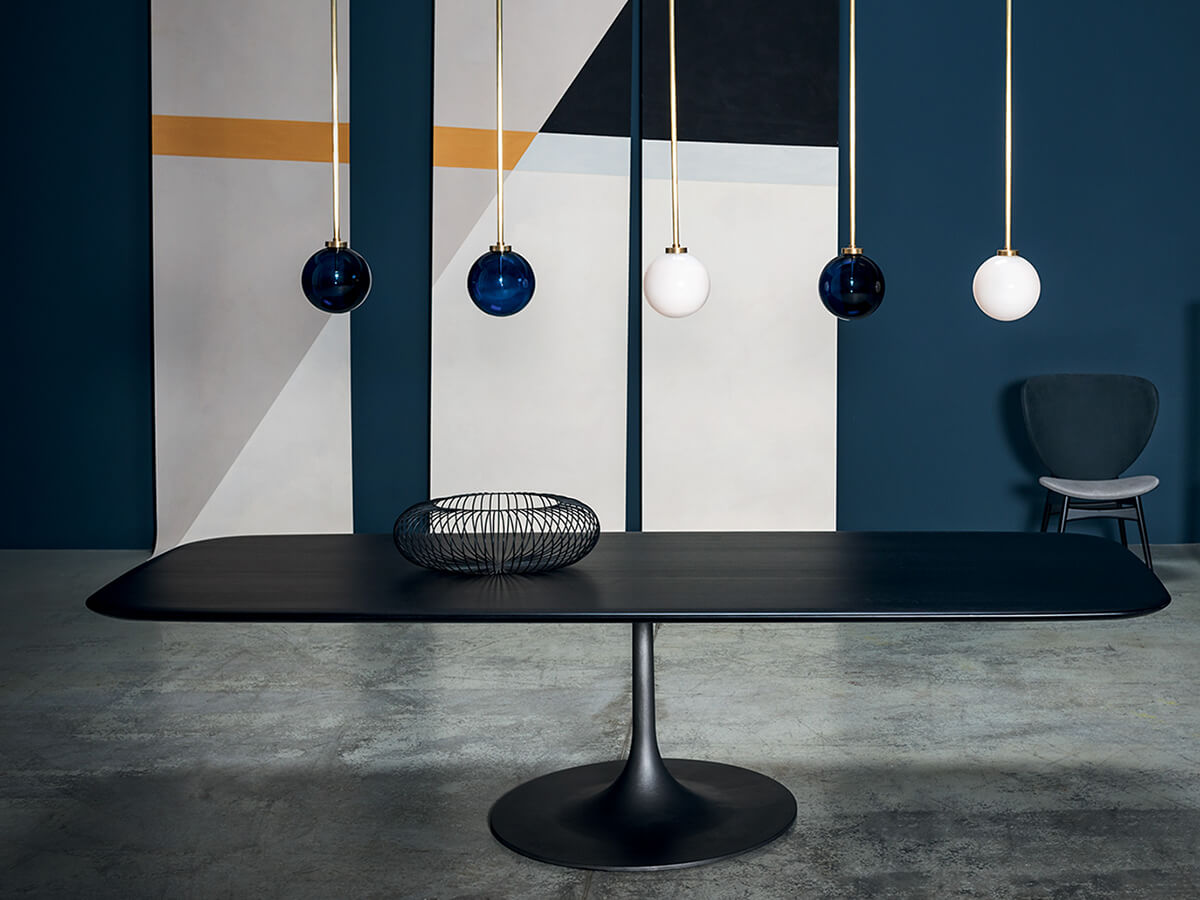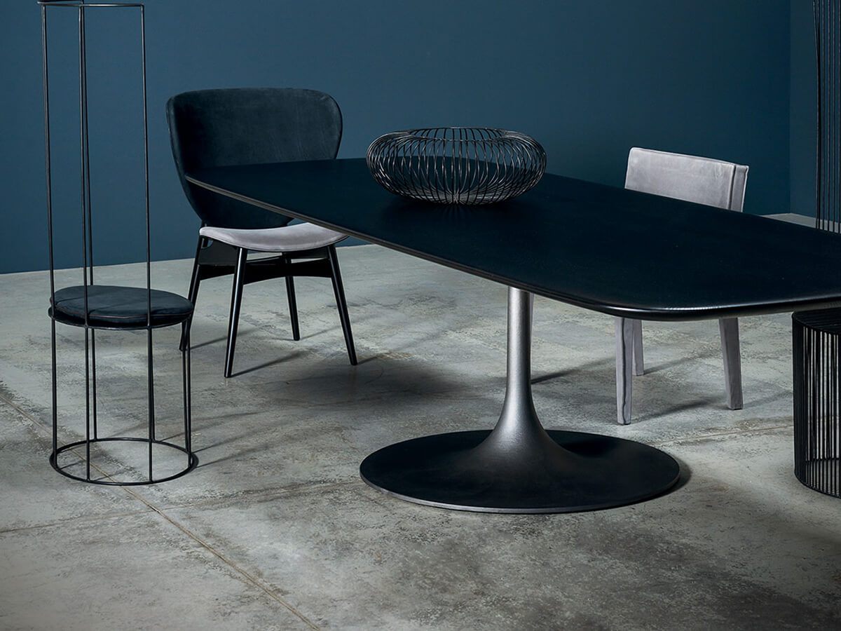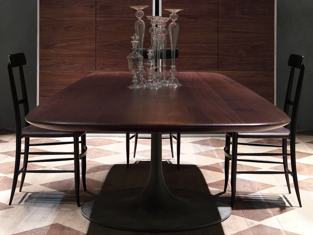 La linea Bourgeois prevede numerose proposte per l’arredo della casa, spaziando dalla scrivania alle librerie, senza però tralasciare uno degli elementi fondamentali dello spazio living: il tavolo. Il design di Matteo Thun e Antonio Rodriguez lo definiscono prevedendo un unico piede di sostegno, solido e ben modellato così da sostenere il piano sovrastante. Questo elegante appoggio è disponibile in diverse finiture a seconda del gusto o della necessità stilistica. Fra le varianti citiamo noce canaletto e frassino tinto grigio antracite, ideali per conferire all’intera struttura un tocco di eleganza e serietà difficilmente imitabili. *Caratteristiche tecniche: base in fusione di ghisa sabbiata