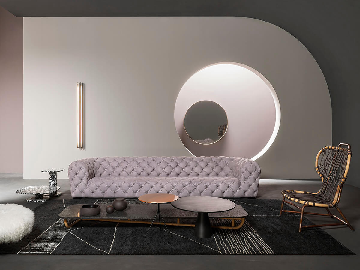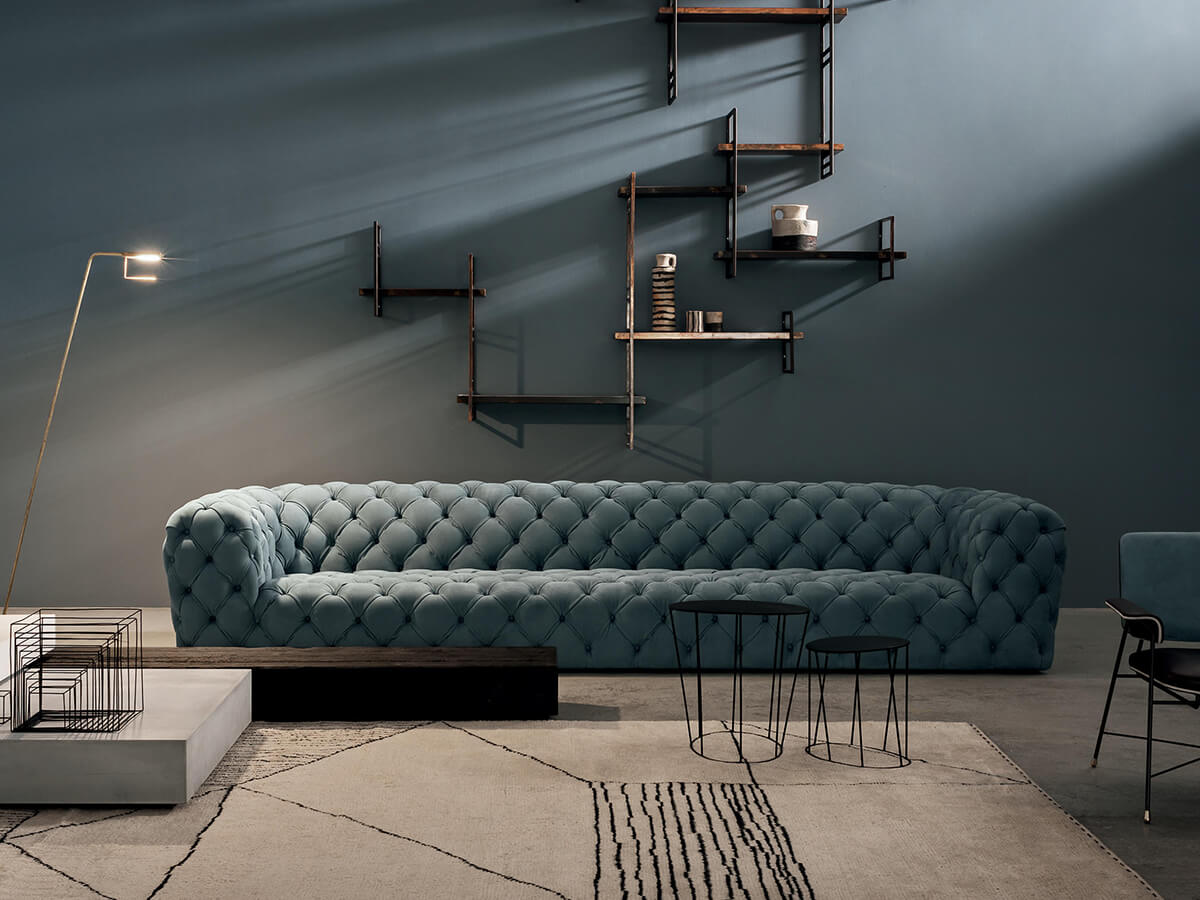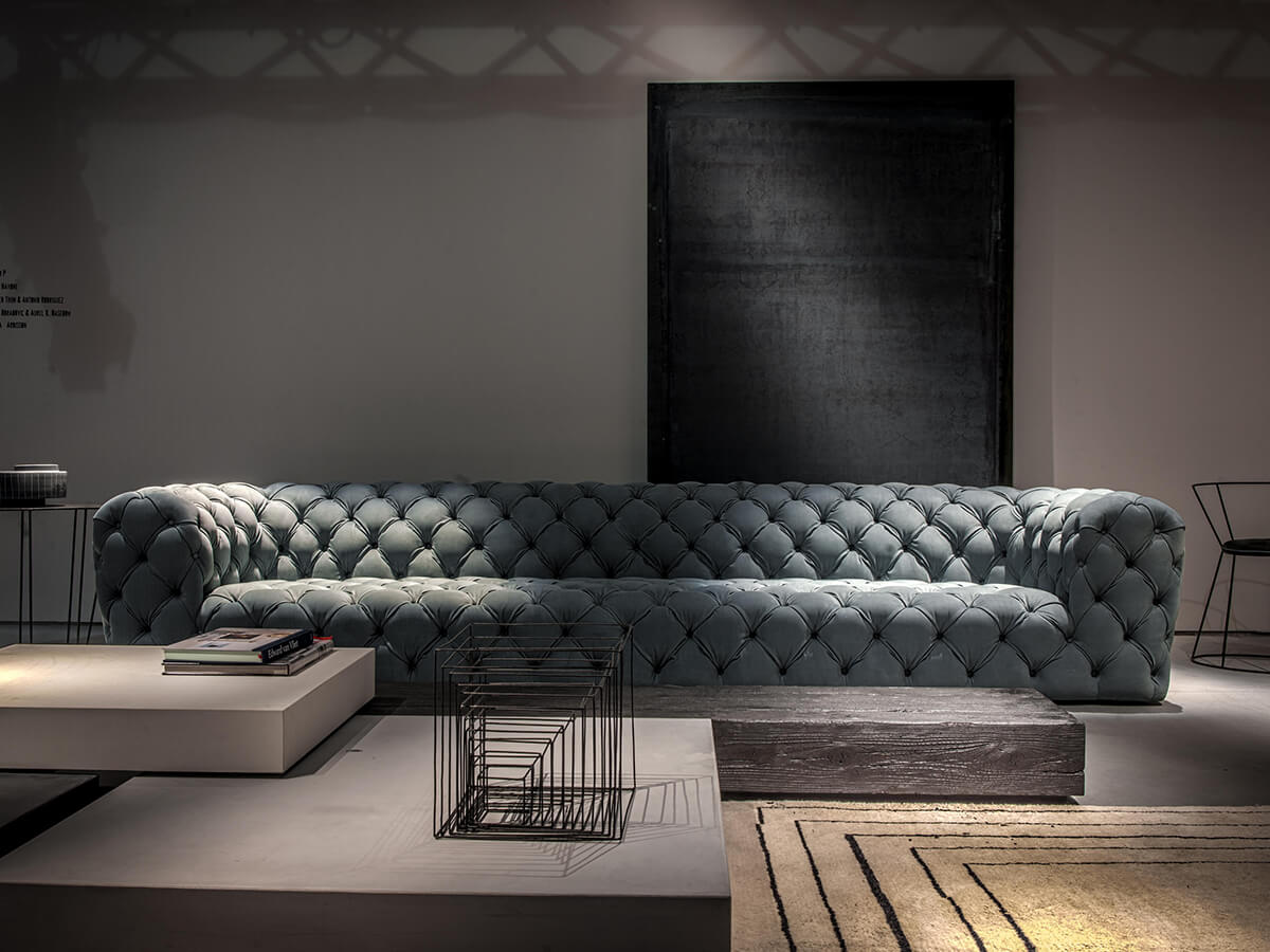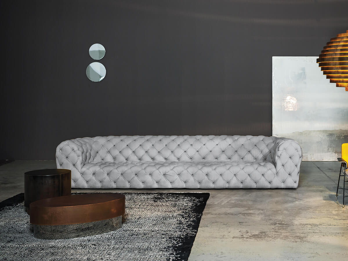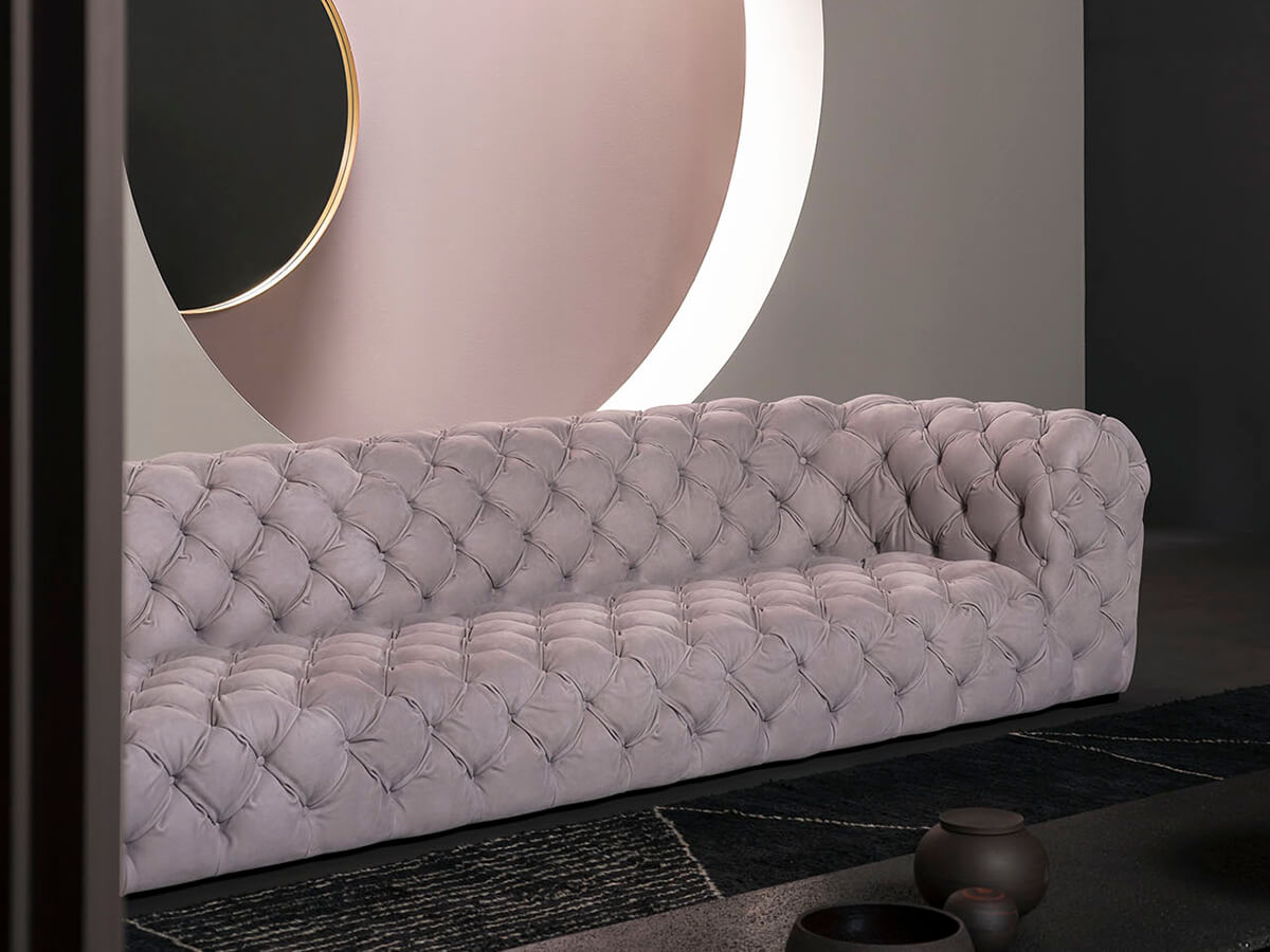 Chester Moon è icona di eleganza e pregevolezza artigianale dominate dallo stile capitonné oltre che dalle forme sobrie e minimaliste, ideali per adattarsi a qualunque stile ed esaltare al massimo la pregevolezza dei materiali utilizzati. La struttura del divano è in multistrato di abete, mentre il telaio del sedile è in abete. Una vastissima gamma di tessuti e pelli sono disponibili per il rivestimento curato nel dettaglio così da favorire non solo la pregevolezza estetica ma anche la qualità sensoriale per coloro che utilizzano l’imbottito.