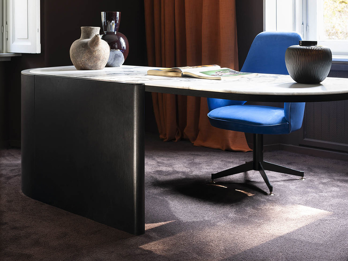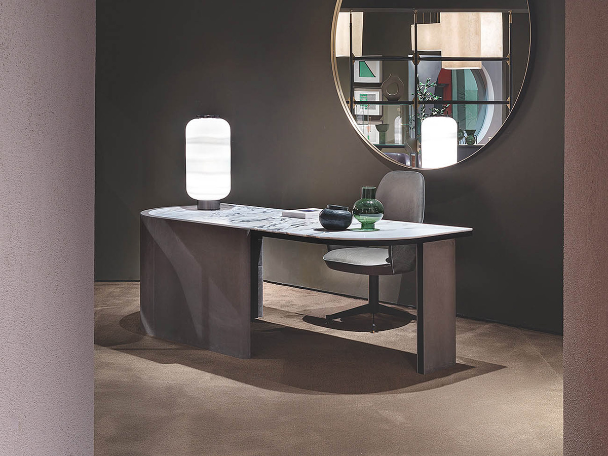 Un’idea d’arredo che ha saputo creare gusto ed eleganza sfruttando linee semplici e geometrie iconiche senza eccedere o aggiungere nulla che non fosse strettamente necessario. Joni è una scrivania creata da Baxter in collaborazione con Christophe Delcourt con struttura in multistrato impiallacciato in rovere spazzolato tinto, gambe e frontali rivestiti in pelle e cassetto segreto con chiave. I piedini sono regolabili per meglio adattarsi a esigenze di altezza e spazio. Joni è una scrivania discreta dove linee curve si alternano a materiali pregiati come legno e pelle che donano un ritmo unico all’intera figura nel suo complesso. Nella medesima collezione è possibile contare anche una libreria e un mobile contenitore in diverse misure.
