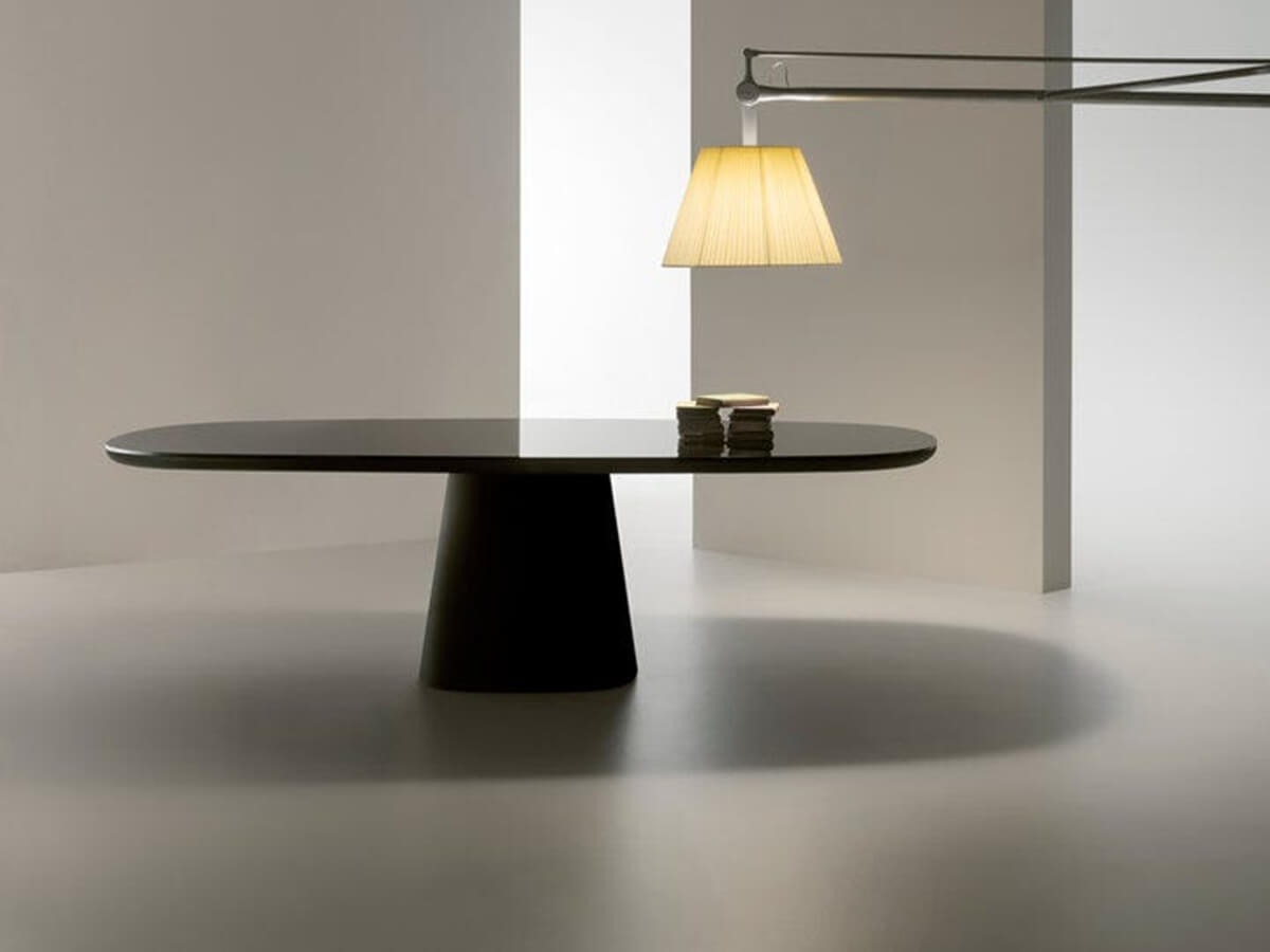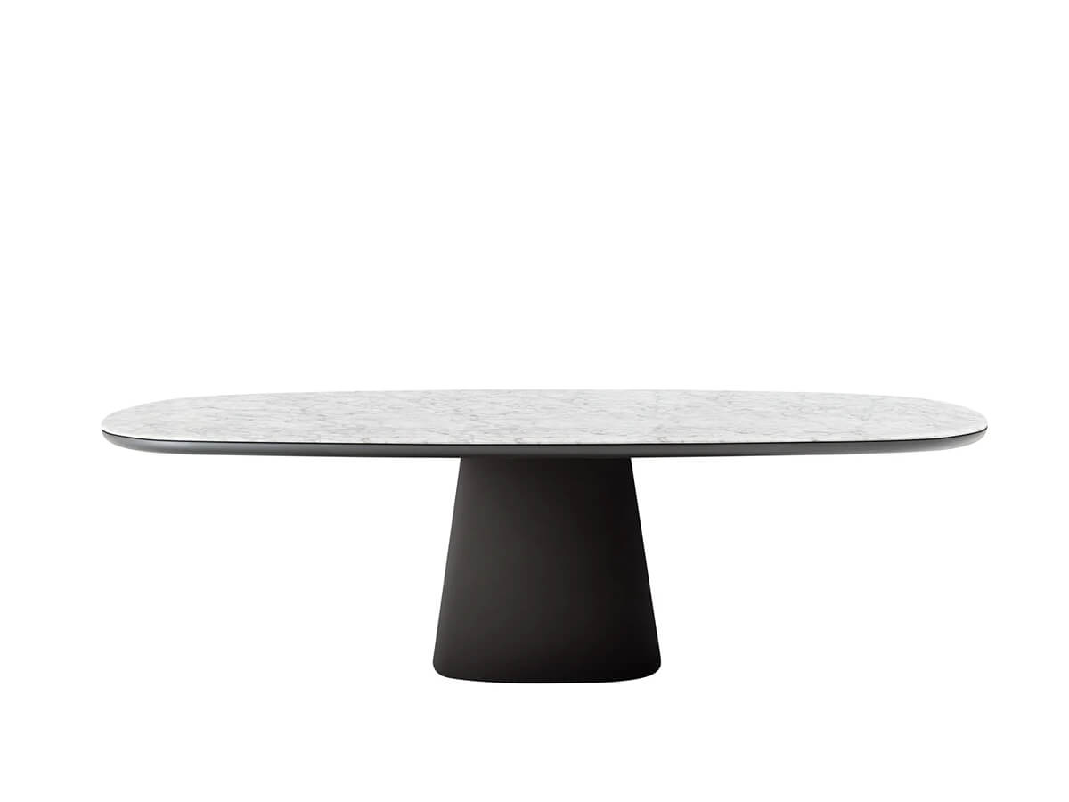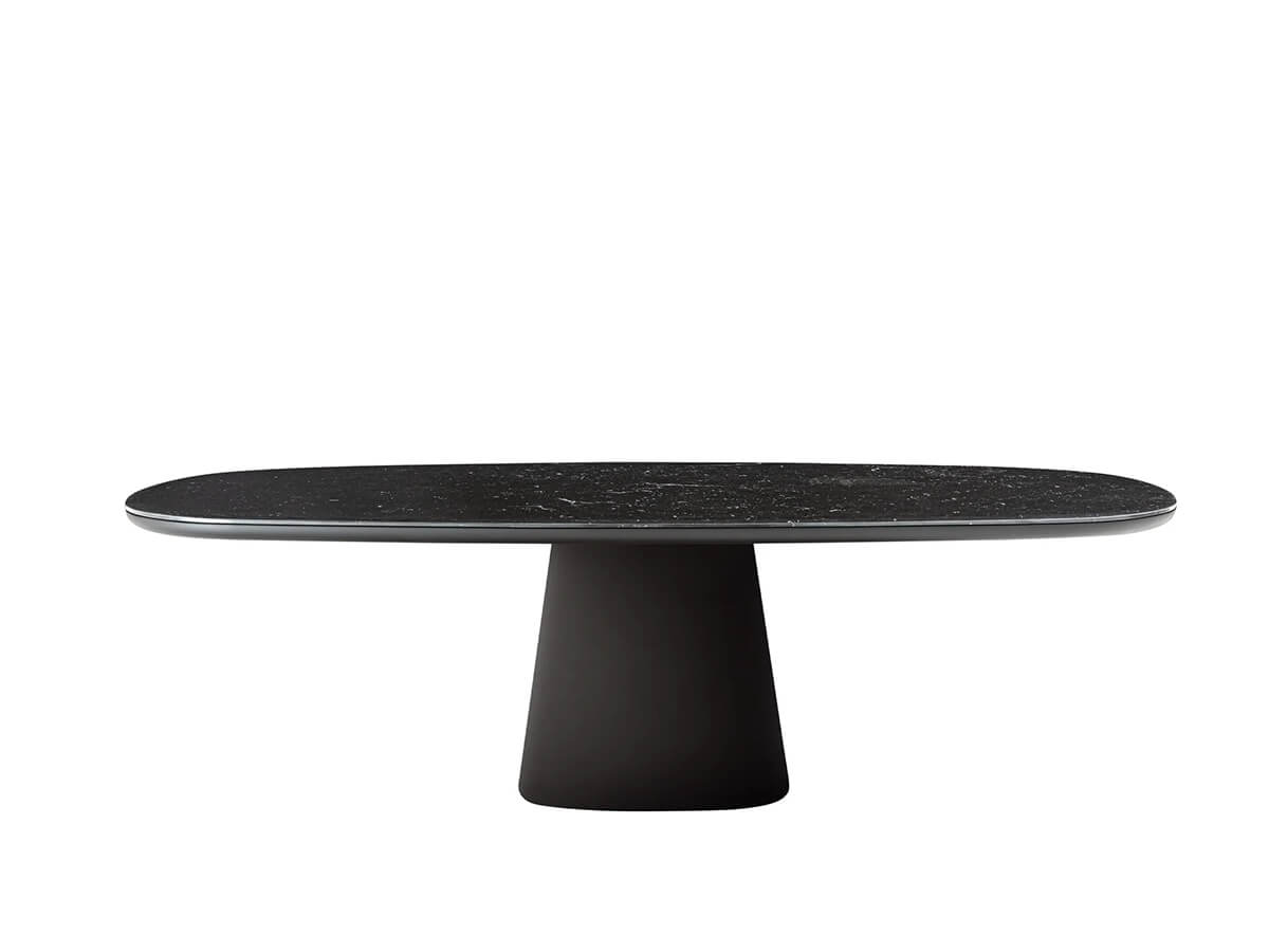 Forme ellittiche, angoli smussati, finiture glamour e colorate: così il tavolo Allure O’, progettato da Monica Armani per B&B Italia, diventa protagonista della scena conviviale, in un mix di atmosfere anni ‘60 e stile contemporaneo. È un tavolo con piano quadrato o rettangolare, disponibile in due dimensioni diverse, con gli angoli smussati e la base composta da un tronco piramidale che dà carattere e stabilità strutturale. Il top può essere laccato lucido o opaco in numerosi colori oppure con rivestimento in legno di rovere chiaro o nero. Per una versione più sofisticata si può optare per il marmo bianco o nero o per il classico vetro nero lucido. Base e top possono essere realizzati in combinazioni di colori diversi per creare piacevoli contrasti.