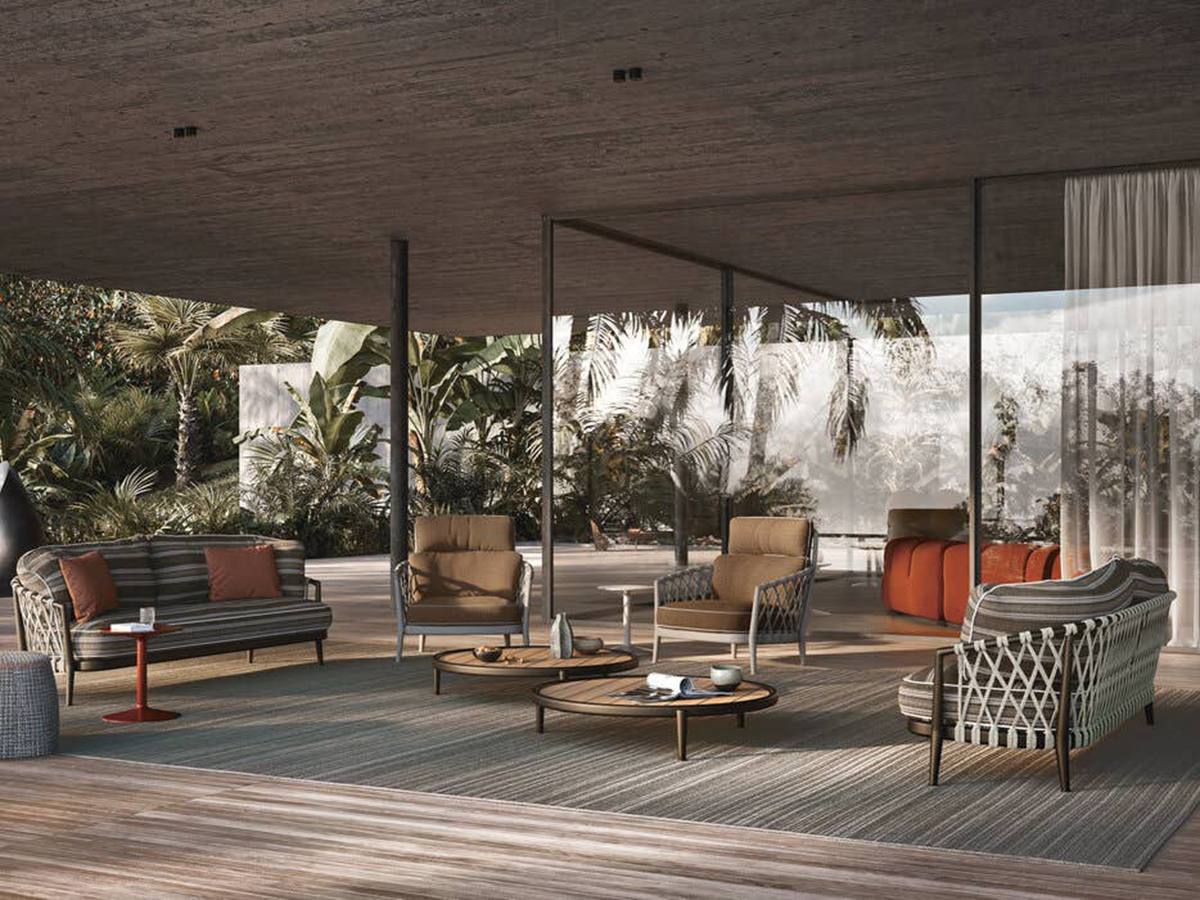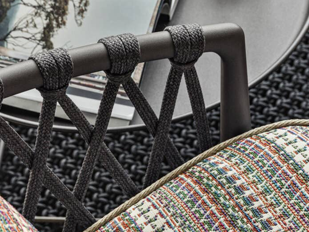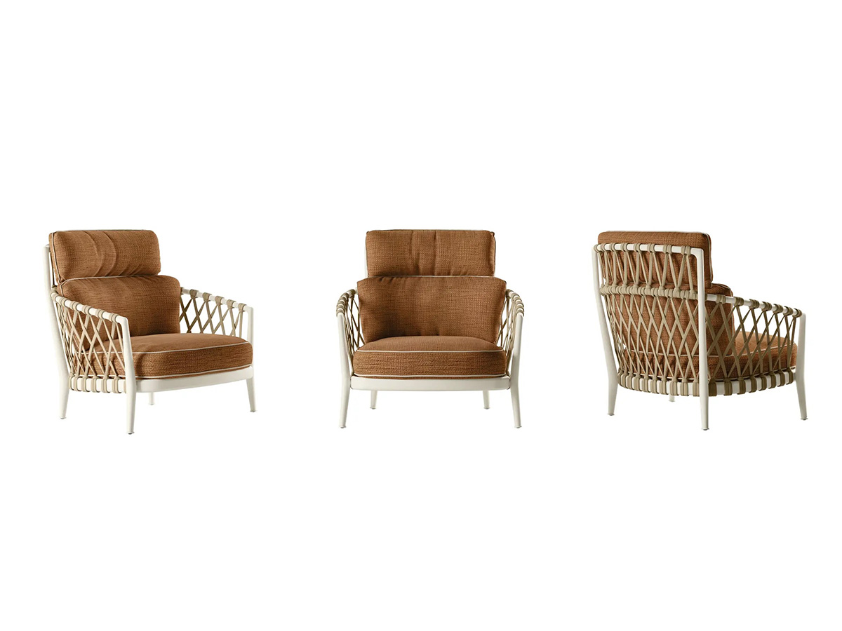 La collezione Erica approda nel mondo dell’outdoor, dando sfoggio di una gamma completa di divani, poltrone, poltroncine e sedie, studiati con un mix di tecnologia e design d’alta gamma. L’impressione che ne deriva è di trovarsi di fronte a elementi d’arredo nuovi e rétro al contempo, capaci di impressionare per leggerezza estetica e disegno d’avanguardia che ben li colloca tanto negli spazi più intimi della casa quanto in zone più ampie e pubbliche. Gli intrecci di nastri in tessuto sintetico dello schienale si fondono a un’anima interna ad alta tenacità studiata per l’utilizzo outdoor; la struttura in alluminio verniciato con intreccio in fibra di polipropilene dà vita a sedute comode ed estremamente ergonomiche, adatta a ospitare il corpo.