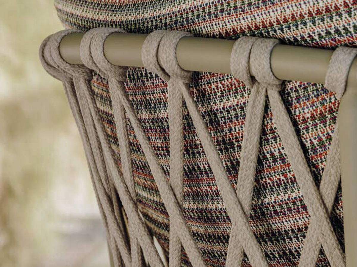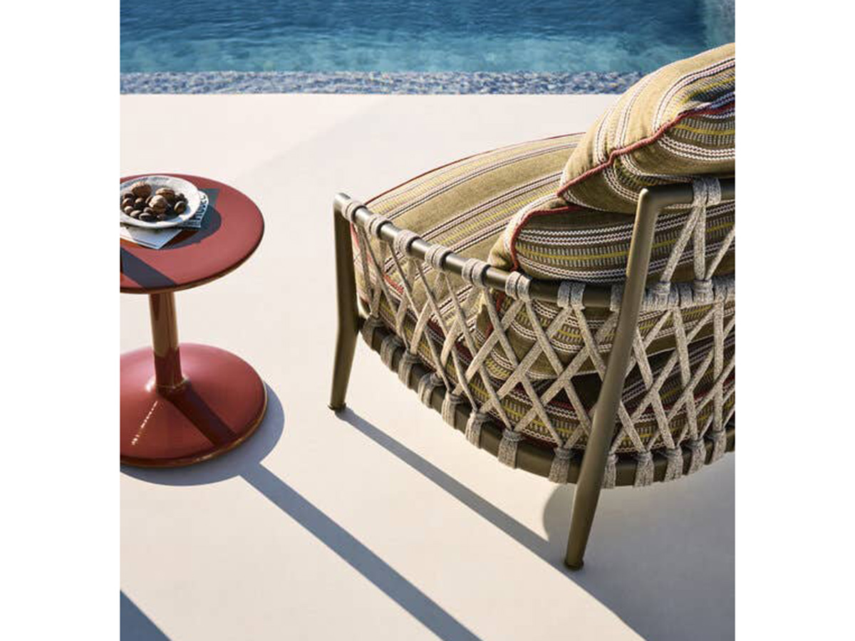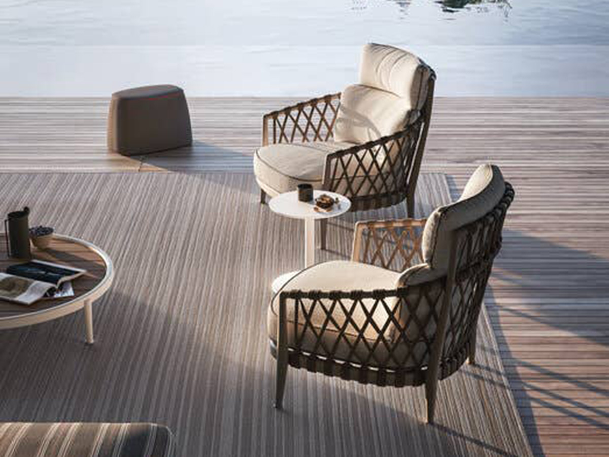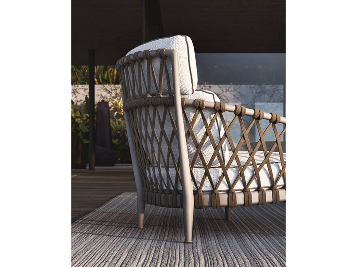La collezione Erica approda nel mondo dell’outdoor, dando sfoggio di una gamma completa di divani, poltrone, poltroncine e sedie, studiati con un mix di tecnologia e design d’alta gamma. L’impressione che ne deriva è di trovarsi di fronte a elementi d’arredo nuovi e rétro al contempo, capaci di impressionare per leggerezza estetica e disegno d’avanguardia che ben li colloca tanto negli spazi più intimi della casa quanto in zone più ampie e pubbliche. Gli intrecci di nastri in tessuto sintetico dello schienale si fondono a un’anima interna ad alta tenacità studiata per l’utilizzo outdoor; la struttura in alluminio verniciato con intreccio in fibra di polipropilene dà vita a sedute comode ed estremamente ergonomiche, adatta a ospitare il corpo.