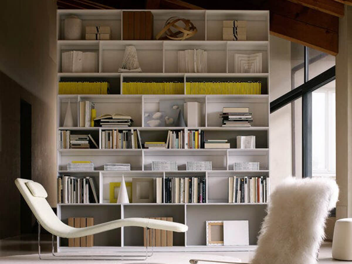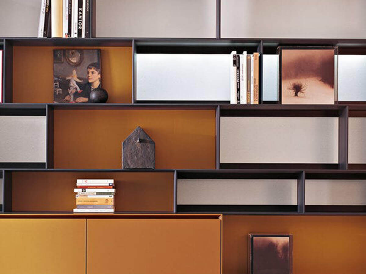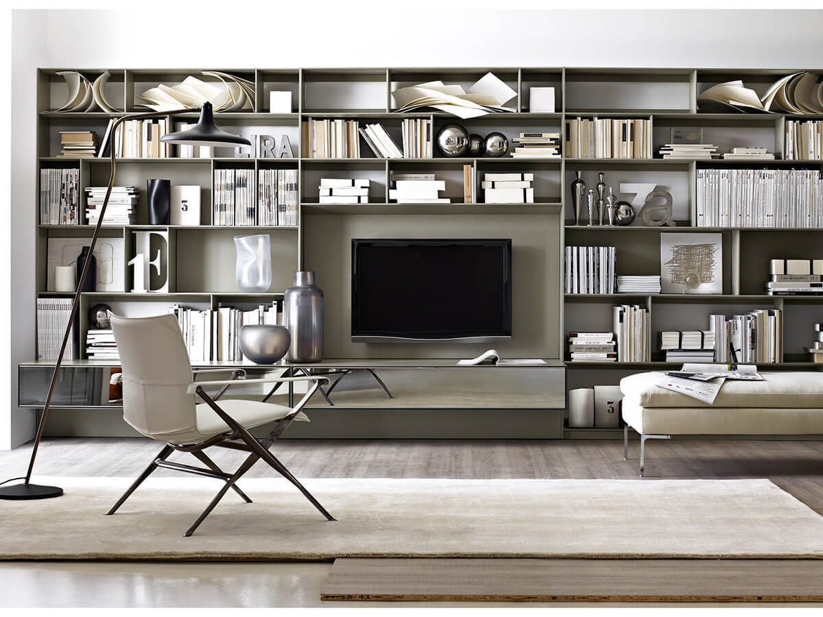 La libreria Flat.C di B&B Italia è un sistema a spalla portante pratico e raffinato, caratterizzato da profondità ridotte e dai sottilissimi spessori di piani, oltre che da una totale assenza di giunti a vista che contribuisce ad un’impressione estetica di totale pulizia formale. La possibilità di inserimento di ripiani leggermente aggettanti permette poi di dinamizzare e caratterizzare le composizioni.Flat.C è basato su una griglia modulare di ripiani ed elementi e può assumere di volta in volta configurazioni sempre diverse. Oltre alle capienti librerie dal tono minimalista qui proposte come esempio, risulta perfetto come protagonista del soggiorno con funzione di parete tv.