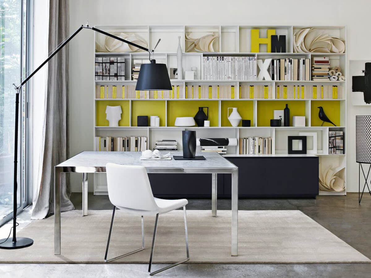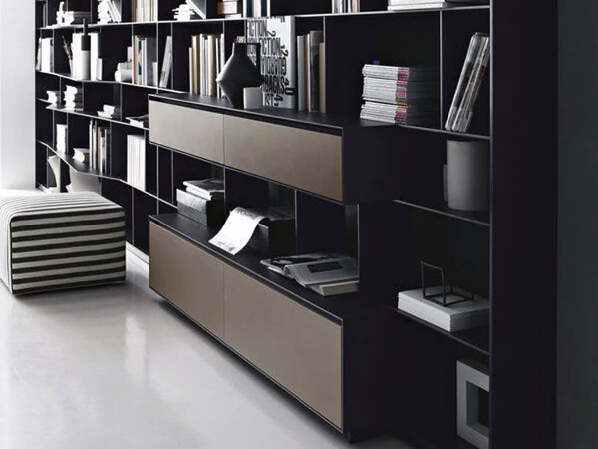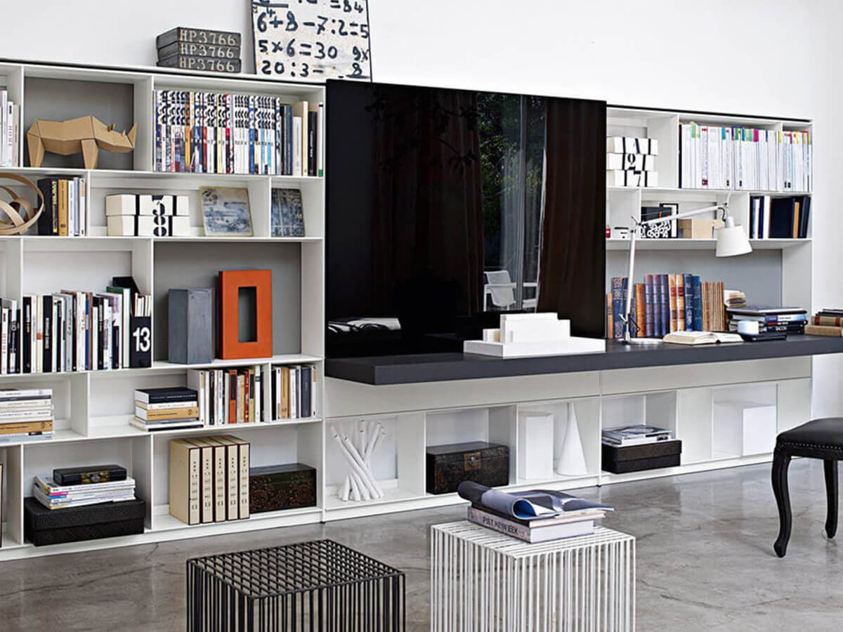 La libreria Flat.C di B&B Italia è un sistema a spalla portante pratico e raffinato, caratterizzato da profondità ridotte e dai sottilissimi spessori di piani, oltre che da una totale assenza di giunti a vista che contribuisce ad un’impressione estetica di totale pulizia formale. La possibilità di inserimento di ripiani leggermente aggettanti permette poi di dinamizzare e caratterizzare le composizioni.Flat.C è basato su una griglia modulare di ripiani ed elementi e può assumere di volta in volta configurazioni sempre diverse. Oltre alle capienti librerie dal tono minimalista qui proposte come esempio, risulta perfetto come protagonista del soggiorno con funzione di parete tv.