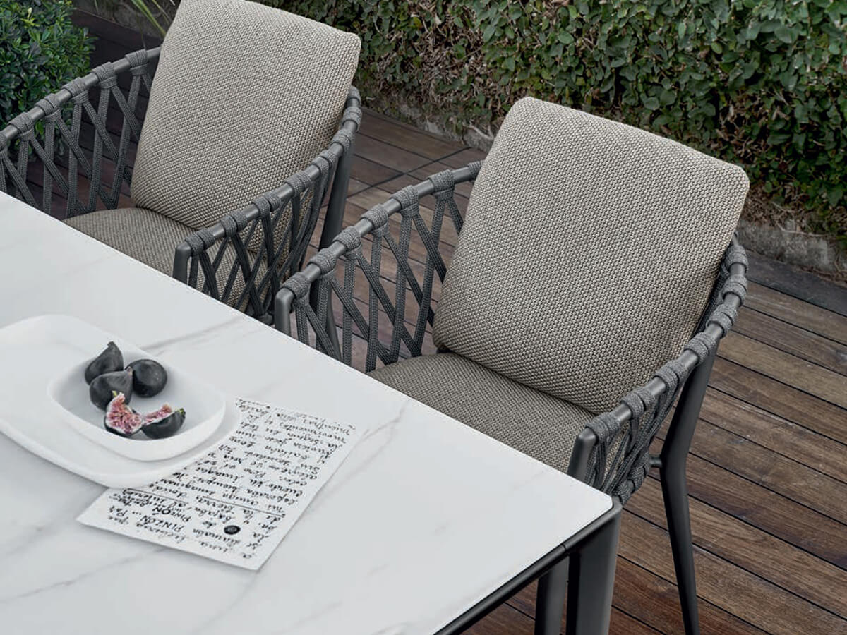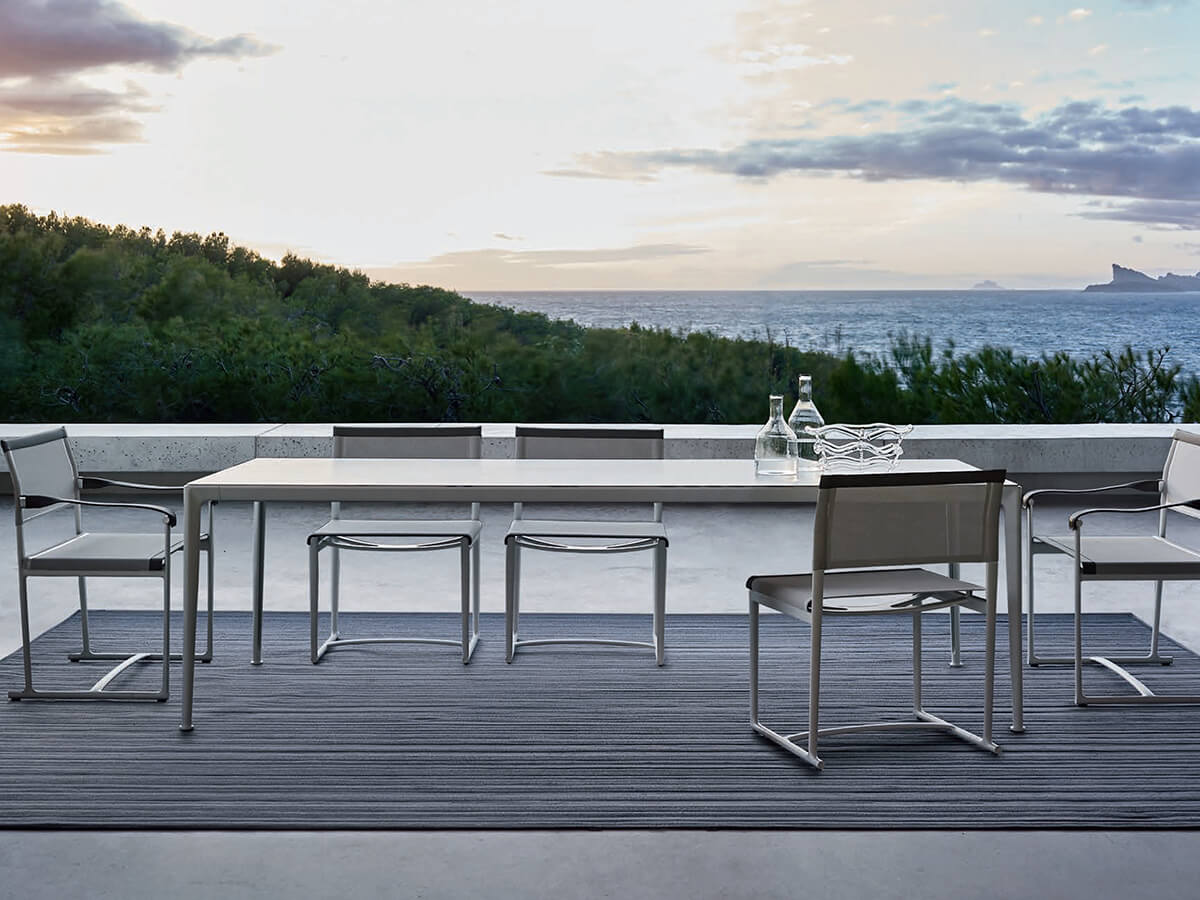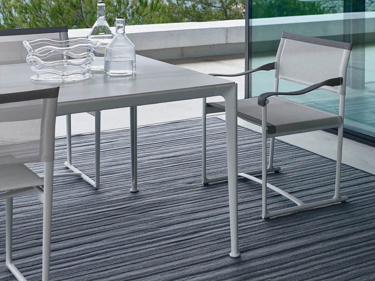 La collezione Mirto Outdoor di Antonio Citterio comprende numerose proposte per l’esterno volte a soddisfare l’esigenza di un design elegante unito a qualità artigianale d’alta gamma. La resistenza unita alla versatilità sono i punti di pregio di ogni proposta che comprende sedie, poltrone, tavolini, consolle e lettini. Il tavolo Mirto nasce da una struttura in pressofusione unita a estrusi d’alluminio con verniciatura poliuretanica. Il piano in lamiera d’alluminio, ampio e ben modulato per le necessità di pranzare all’aperto, può presentare fra le numerose possibilità una verniciatura poliuretanica, gres porcellanato o doghe in legno. La cura di B&B Italia nel dar vita a questa collezione si ritrova nella sua durabilità e resistenza al logorio degli agenti atmosferici.*Caratteristiche tecniche: il piano in gres è in finitura porcellanato bianco Calacatta