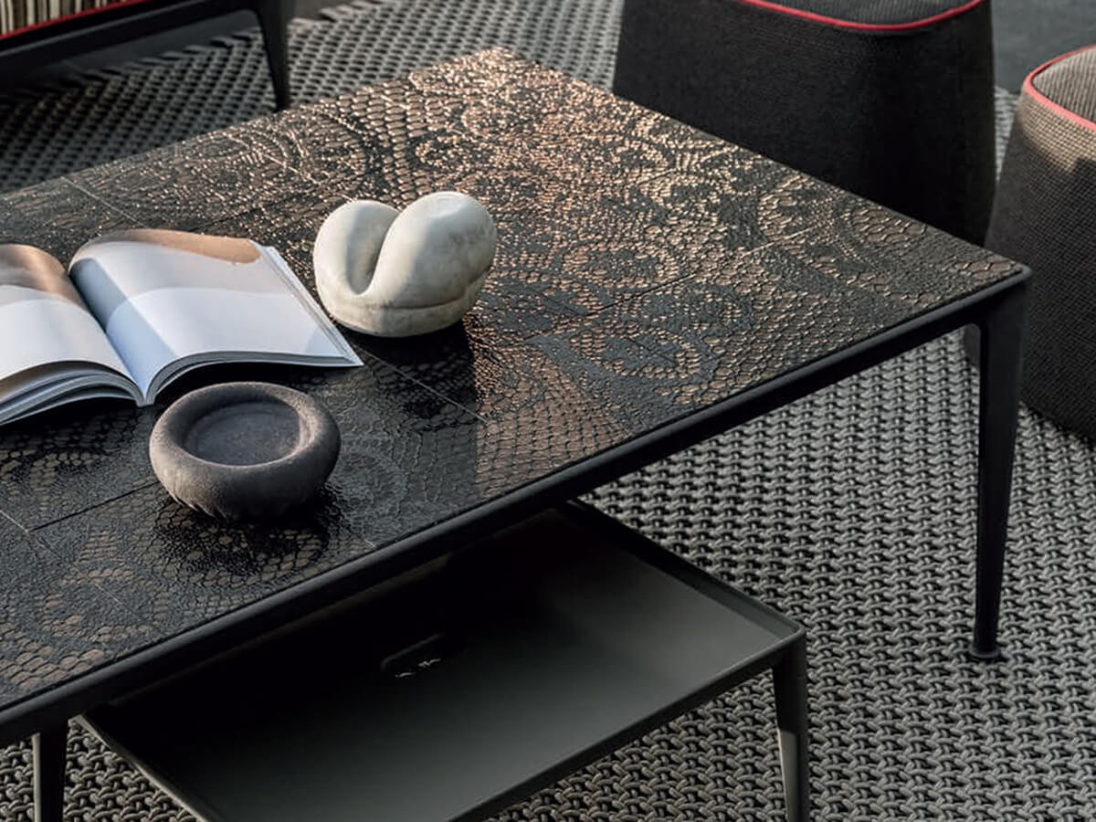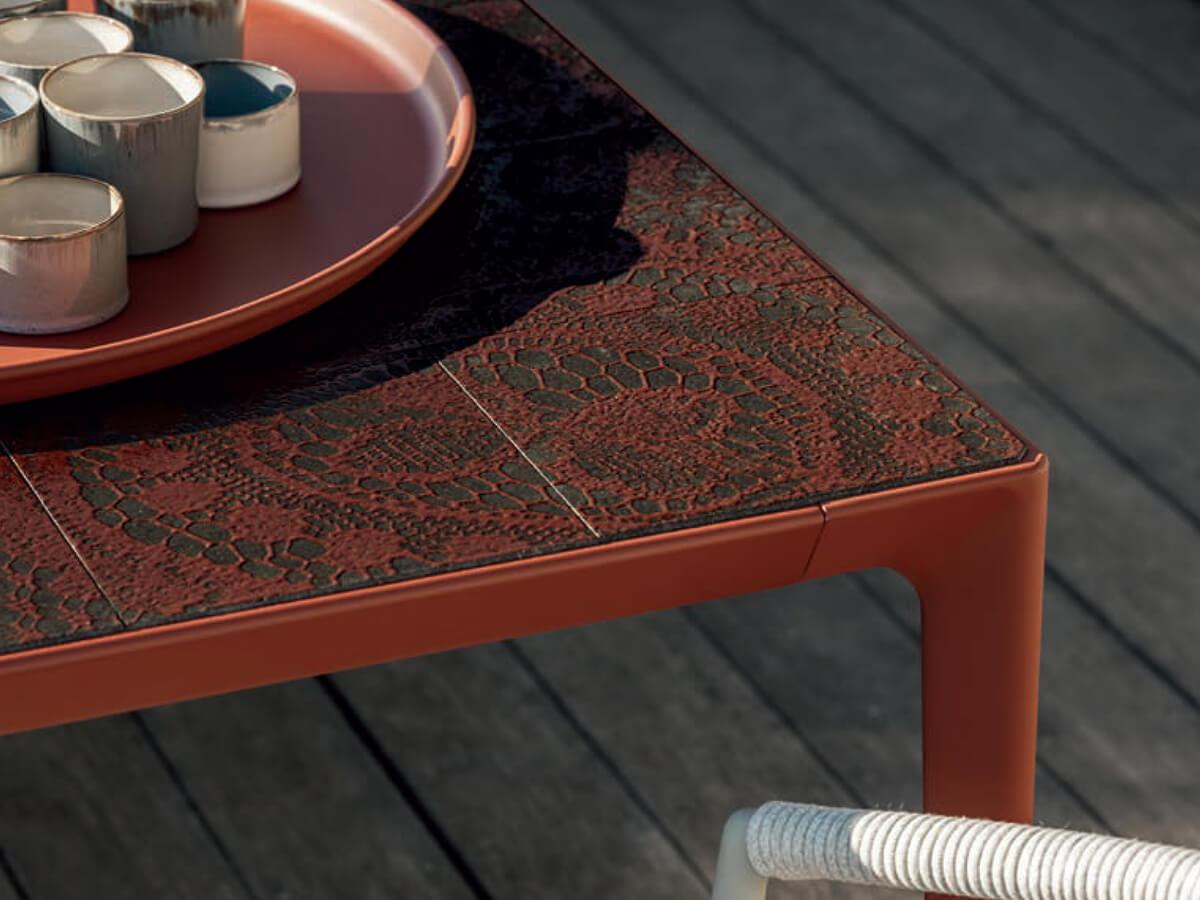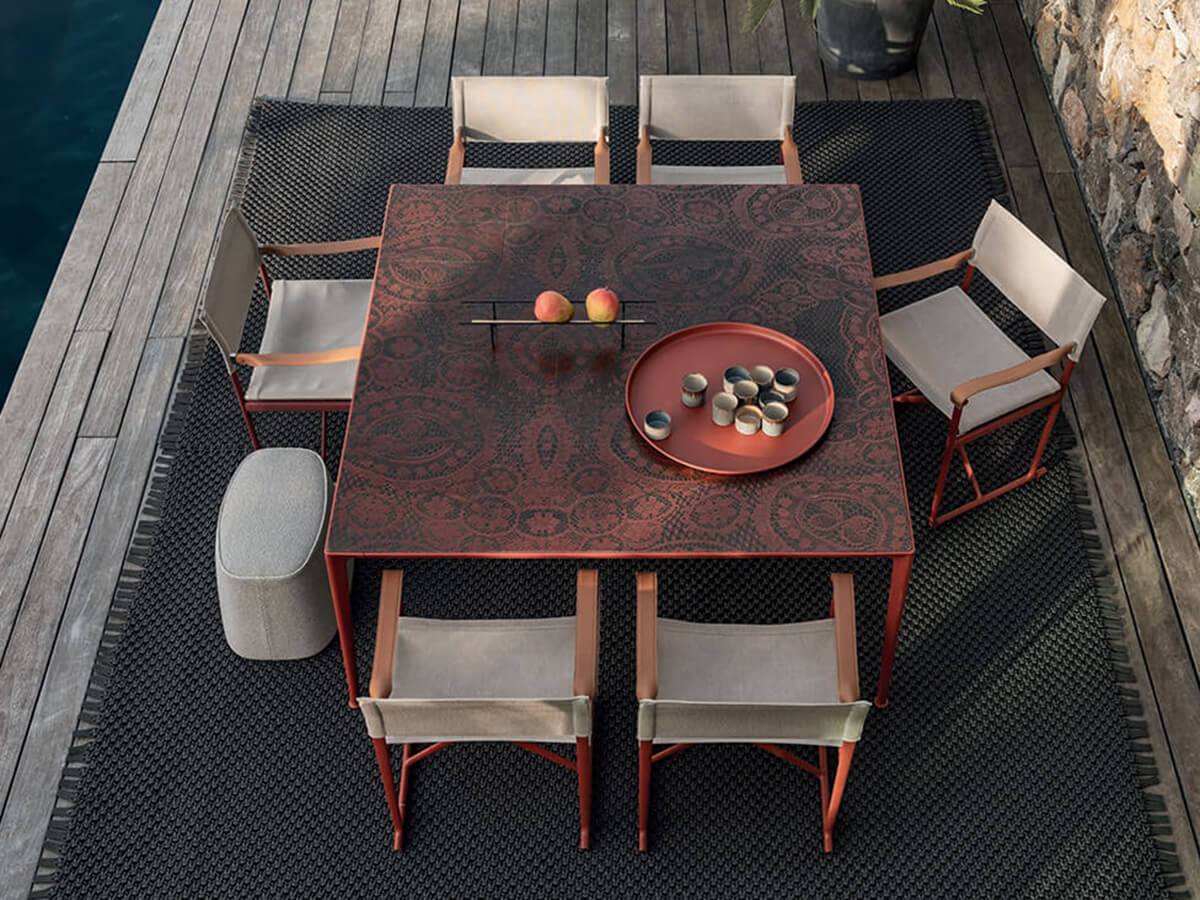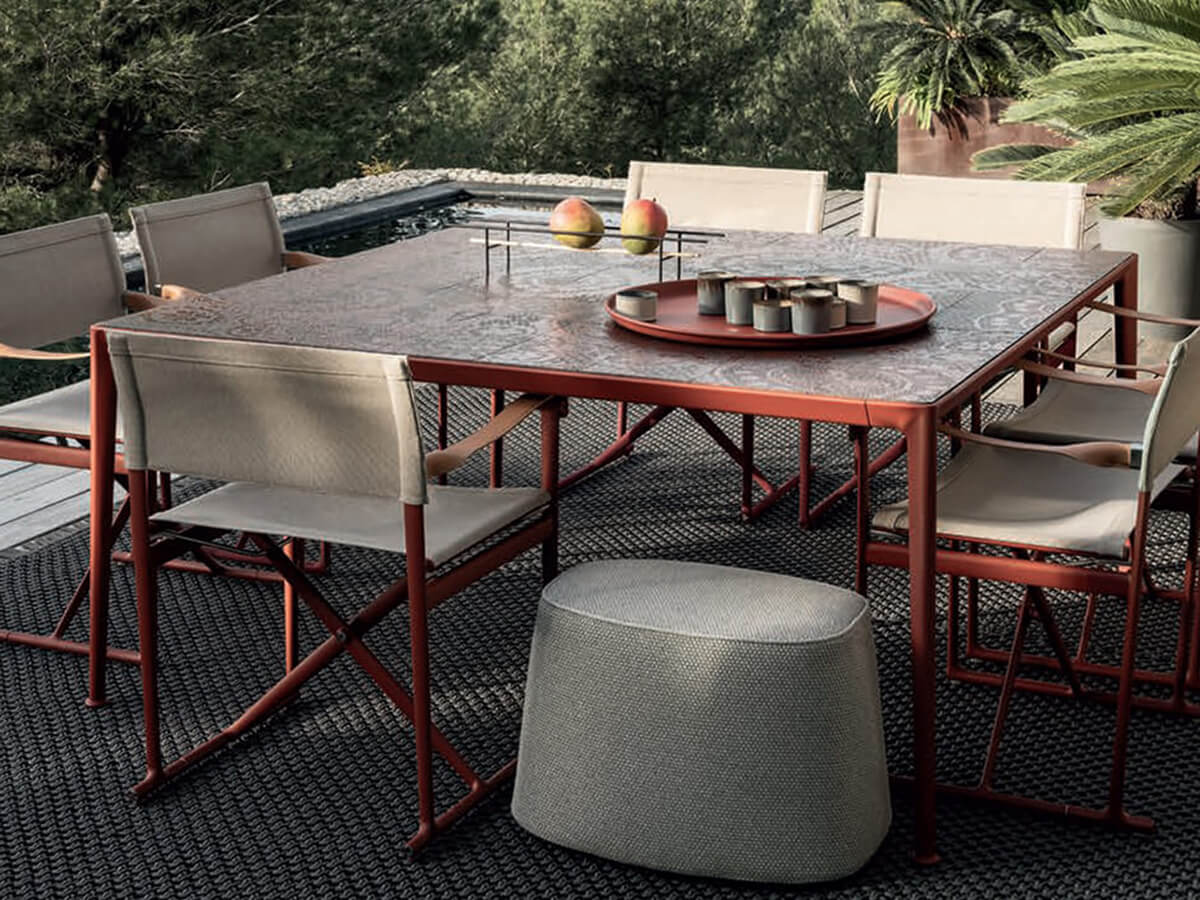 La collezione Mirto Outdoor di Antonio Citterio comprende numerose proposte per l’esterno volte a soddisfare l’esigenza di un design elegante unito a qualità artigianale d’alta gamma. La resistenza unita alla versatilità sono i punti di pregio di ogni proposta che comprende sedie, poltrone, tavolini, consolle e lettini. Il tavolo Mirto nasce da una struttura in pressofusione unita a estrusi d’alluminio con verniciatura poliuretanica. Il piano in lamiera d’alluminio, ampio e ben modulato per le necessità di pranzare all’aperto, può presentare fra le numerose possibilità una verniciatura poliuretanica, gres porcellanato o doghe in legno. La cura di B&B Italia nel dar vita a questa collezione si ritrova nella sua durabilità e resistenza al logorio degli agenti atmosferici.*Caratteristiche tecniche: il piano in gres è in finitura porcellanato bianco Calacatta