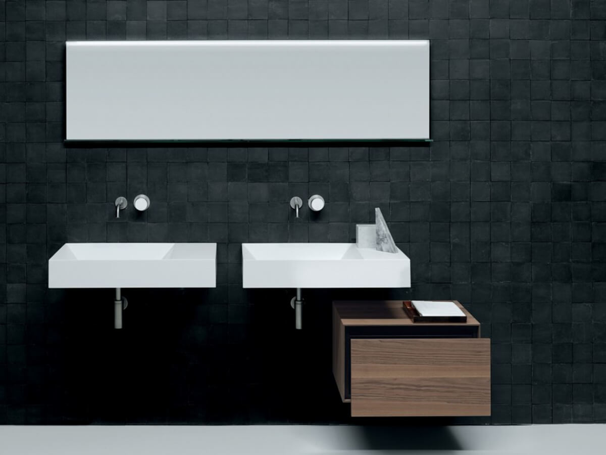Il lavabo sospeso A45 di Boffi, firmato dal designer bulgaro Victor Vasilev, colpisce facilmente l’attenzione con le sue eleganti forme nettamente squadrate. Le pareti interne del bacino presentano uno smusso di 45° che dinamizza il suo profilo rigorosamente rettangolare, mentre il piano è solo leggermente inclinato per permettere lo scorrimento dell’acqua, dando così un senso di solida geometricità. Lo scarico è disposto su un lato ed è nascosto da un pianetto in noce o in Cristalplant. A45 è disponibile in Cristalplant oppure in marmo bianco di Carrara (versione A 45 Stone). La variante A45 Compact presenta invece una larghezza ridotta.