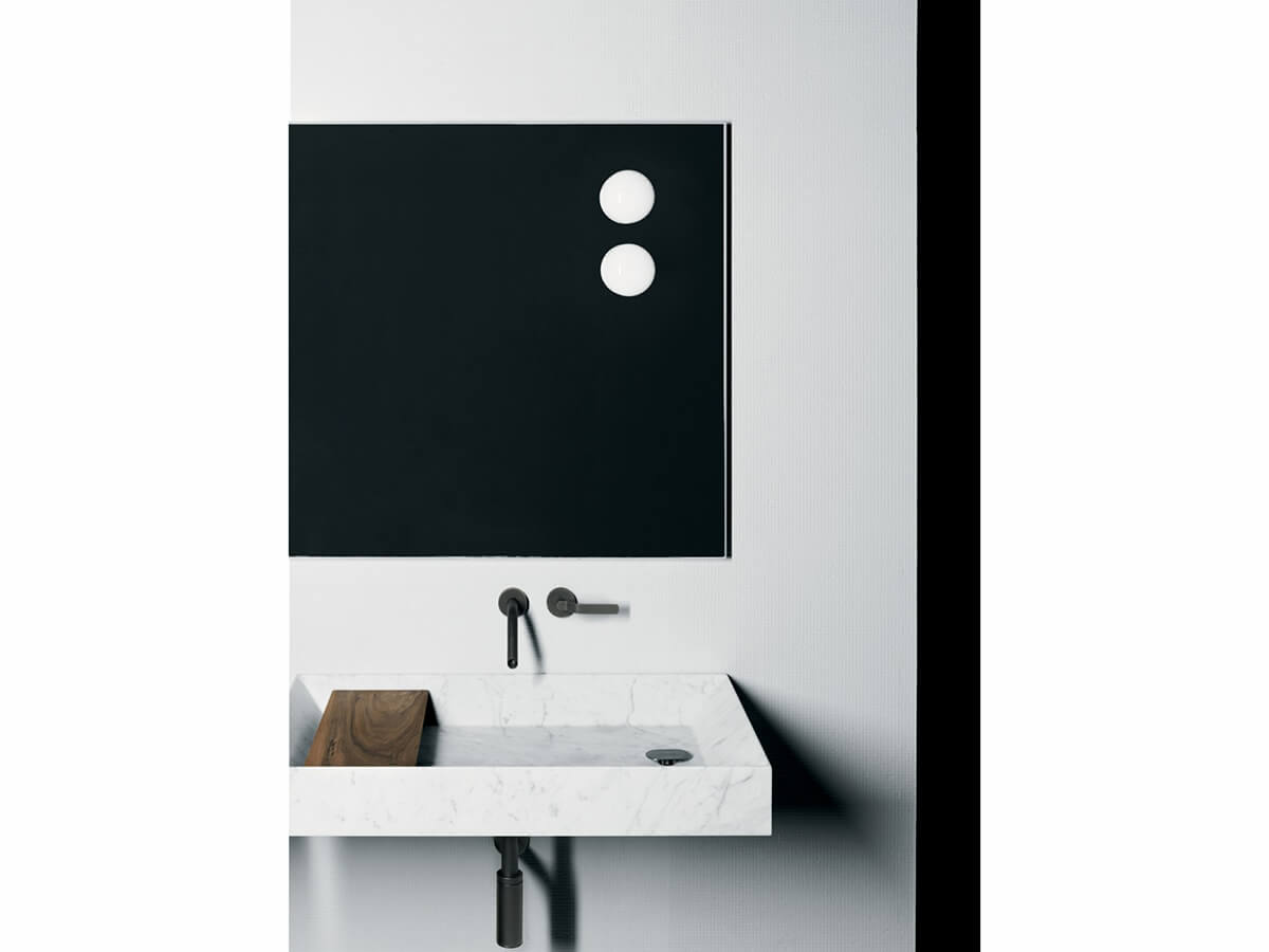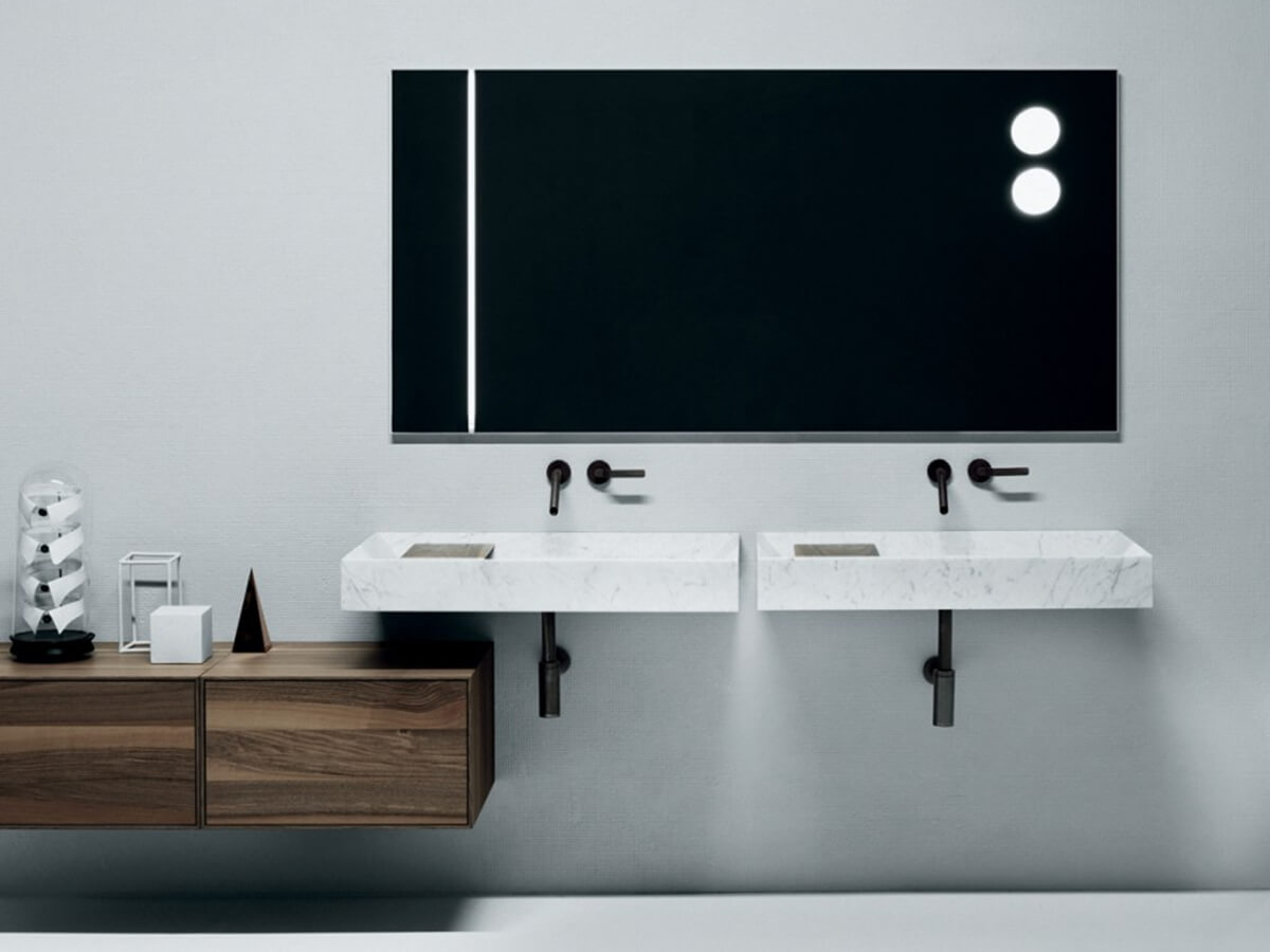 Il lavabo sospeso A45 di Boffi, firmato dal designer bulgaro Victor Vasilev, colpisce facilmente l’attenzione con le sue eleganti forme nettamente squadrate. Le pareti interne del bacino presentano uno smusso di 45° che dinamizza il suo profilo rigorosamente rettangolare, mentre il piano è solo leggermente inclinato per permettere lo scorrimento dell’acqua, dando così un senso di solida geometricità. Lo scarico è disposto su un lato ed è nascosto da un pianetto in noce o in Cristalplant. A45 è disponibile in Cristalplant oppure in marmo bianco di Carrara (versione A 45 Stone). La variante A45 Compact presenta invece una larghezza ridotta.