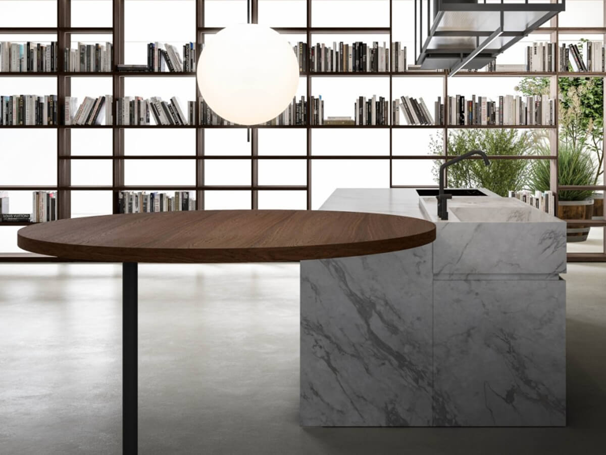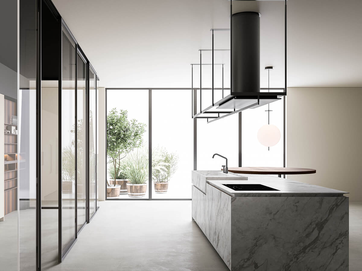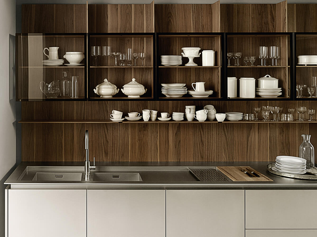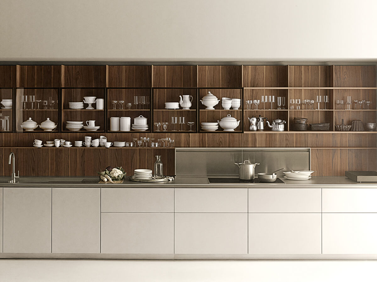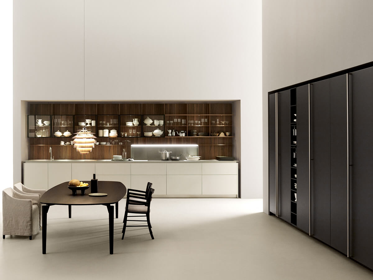 Il sistema APR60 di Boffi è perfetto per la creazione di lussuose isole cucina dalla solida presenza scultorea. La sua caratteristica principale è l’elegante e ampia svasatura del piano che gli conferisce un’impressione di sospesa leggerezza sopra una base corposa e solida, valorizzabile anche con la scelta di finiture preziose come marmo o acciaio.Un’estetica peculiare che non prevede la presenza di maniglie: l’apertura avviene attraverso la gola fra ante e piano, oppure con il sistema push-pull per le basi inferiori di tipologia “Tip-On”.Nelle composizioni a parete APR60 si caratterizza inoltre per i sottilissimi spessori delle mensole, tali da farle sembrare quasi delle linee disegnate che enfatizzano ulteriormente l’impressione di levità della composizione.
