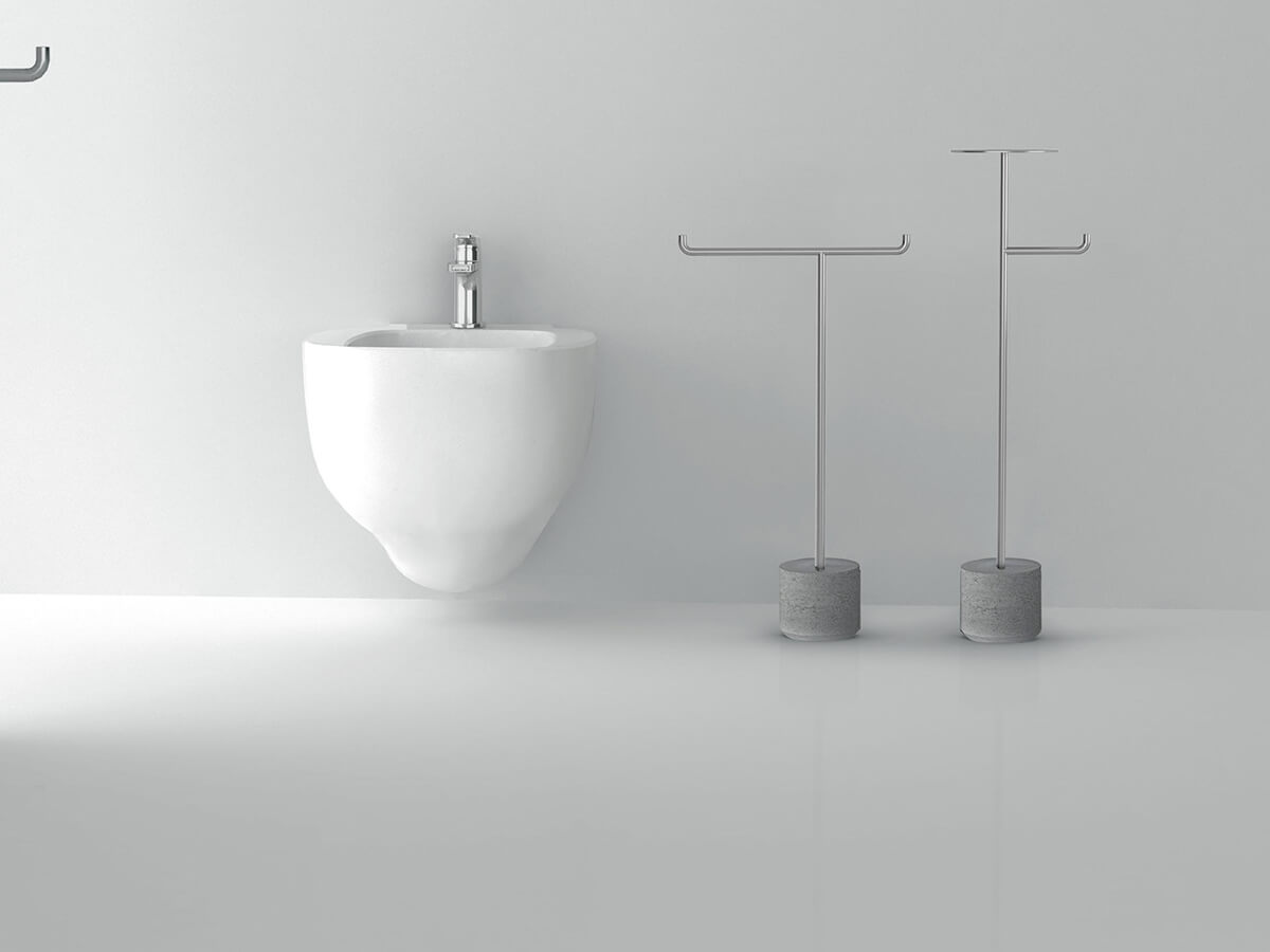 La piantana portasciugamani Iko di Boffi, firmata dal designer giapponese Kensaku Oshiro, è un accessorio per il bagno originale e formalmente impeccabile. Si compone di uno stabile basamento cilindrico in pietra Serena sopra il quale si erge un sottile fusto in tondino di acciaio inox satinato Aisi 304, sul quale poi si innesta un elemento orizzontale che culmina in ambo le estremità in un leggero rialzo verticale. Iko trae il suo nome l’ispirazione per le sue forme dal tradizionale sostegno utilizzato in Giappone per riporre il Kimono ed è disponibile in tre varianti, caratterizzate dal diverso punto di raccordo fra elemento orizzontale verticale e dalla presenza in una di esse di un pratico pianetto porta rotolo.