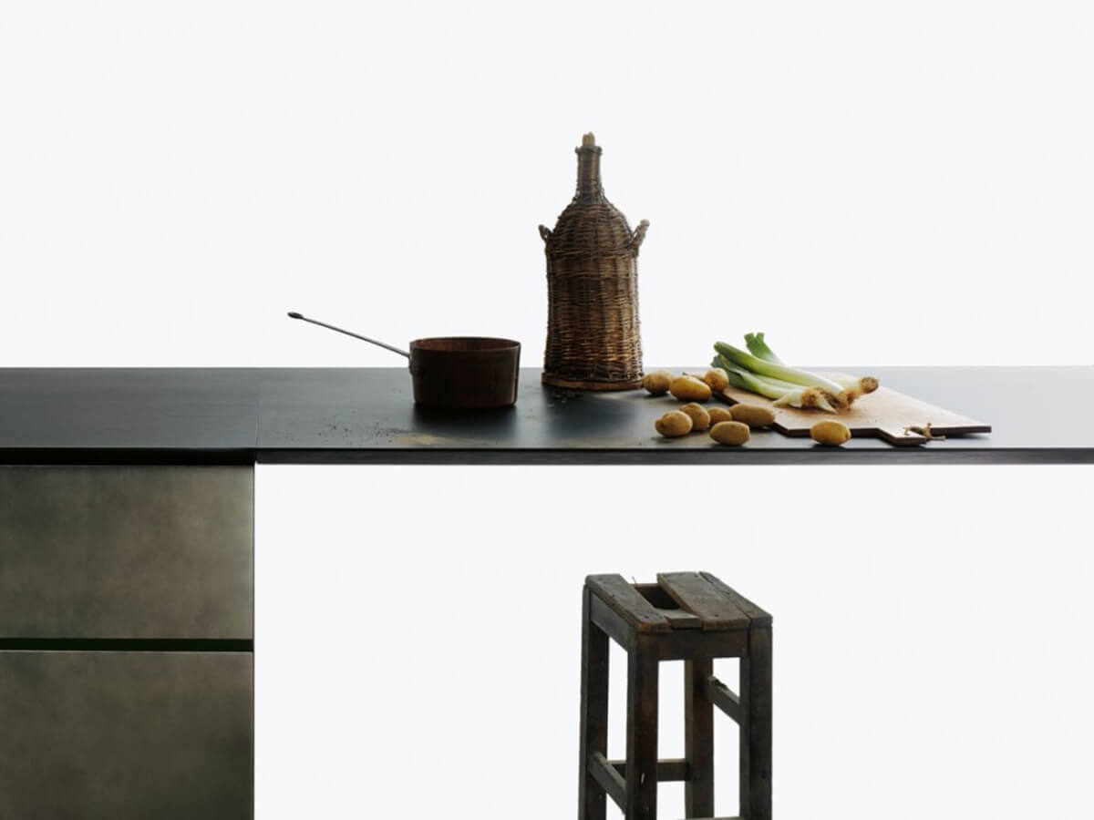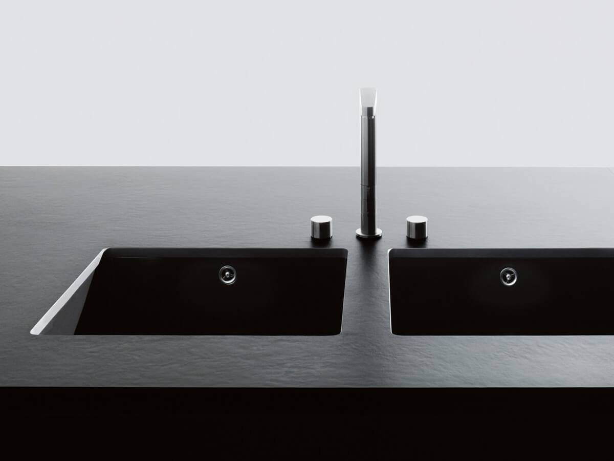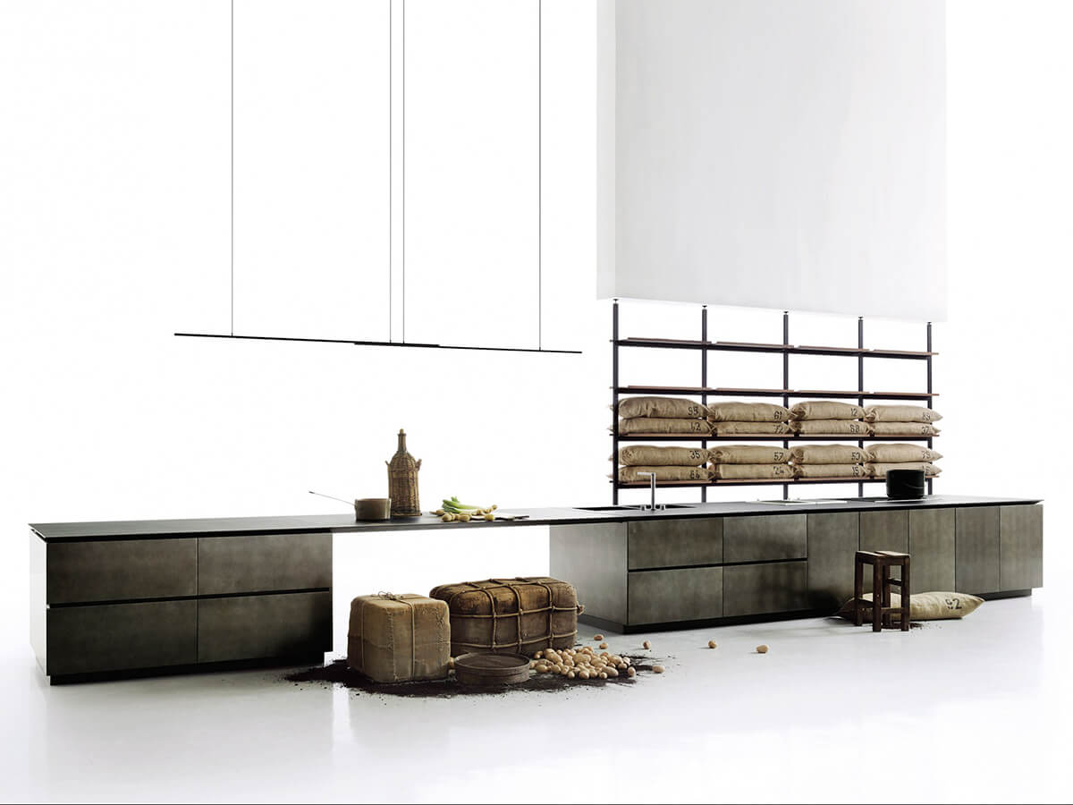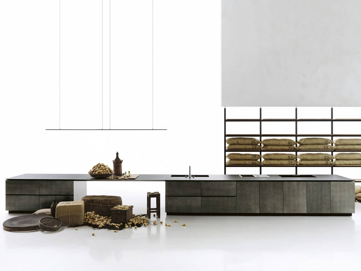 La cucina K14 di Norbert Wangen è uno dei modelli più lussuosi e spettacolari di tutto il catalogo Boffi. La ricerca del designer tedesco sul concetto di cucina compatta lo porta con K14 a livelli di preziosità e raffinatezza mai raggiunti in precedenza. A differenza delle altre cucine della serie K, l’aspetto tecnologico aveva un ruolo preponderante attraverso differenti soluzioni ingegneristiche che permettevano un pratico scorrimento del piano, in K14 il piano rimane fisso, ma continua a sorprendere e a rivelarsi protagonista. Aereo e sospeso, può debordare ampiamente oltre i confini del blocco-isola, oppure collegare due basi attraverso lunghe soluzioni a ponte, andando a creare composizioni dal grandissimo impatto spettacolare.Anche la forma del piano è accuratamente studiata: leggero e rigoroso, è lavorato con uno smusso a 30° che si rispecchia nel taglio dell’anta, permettendo una pratica apertura senza maniglie.