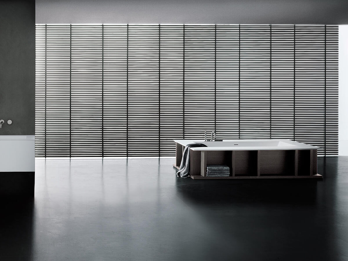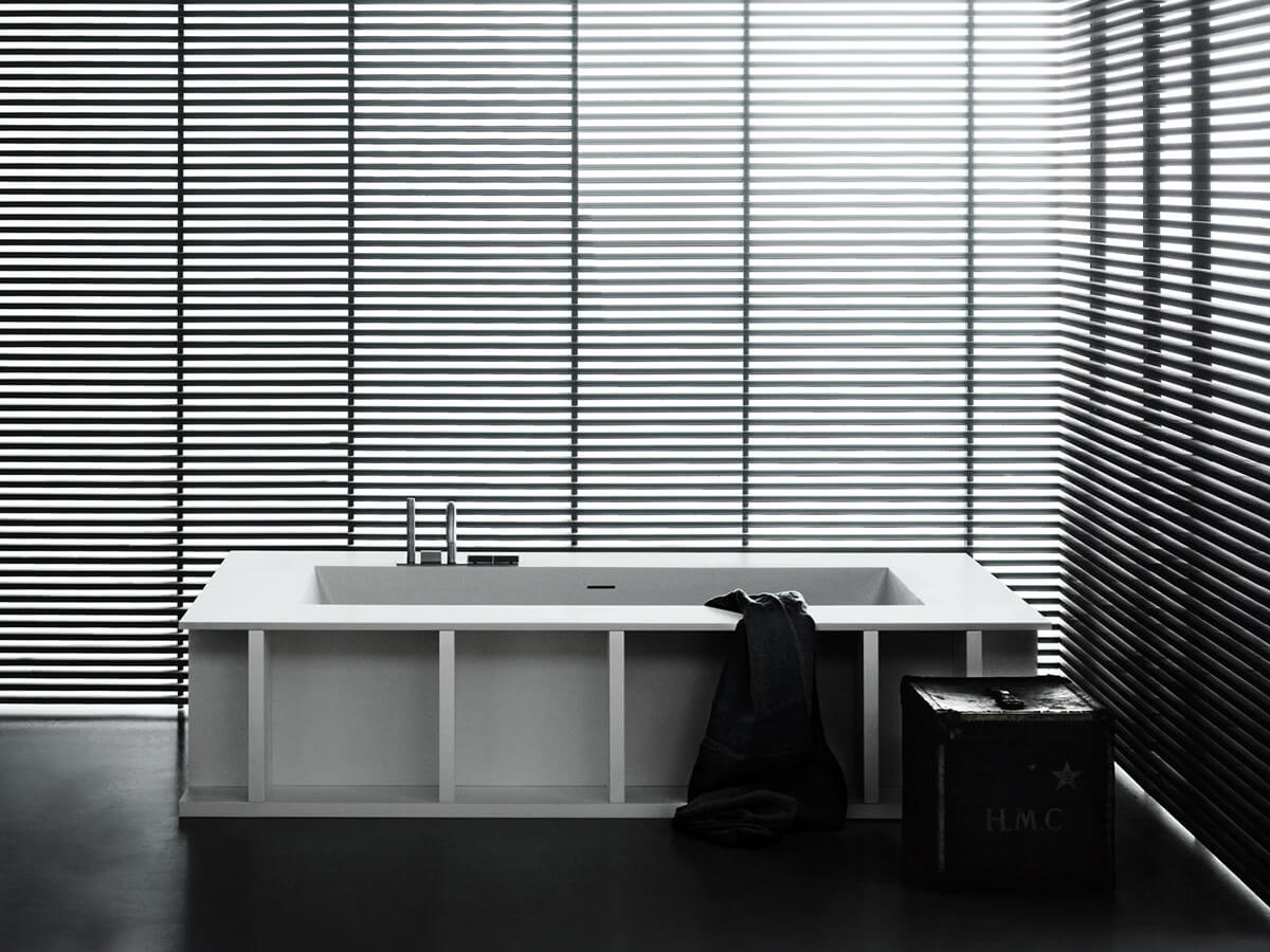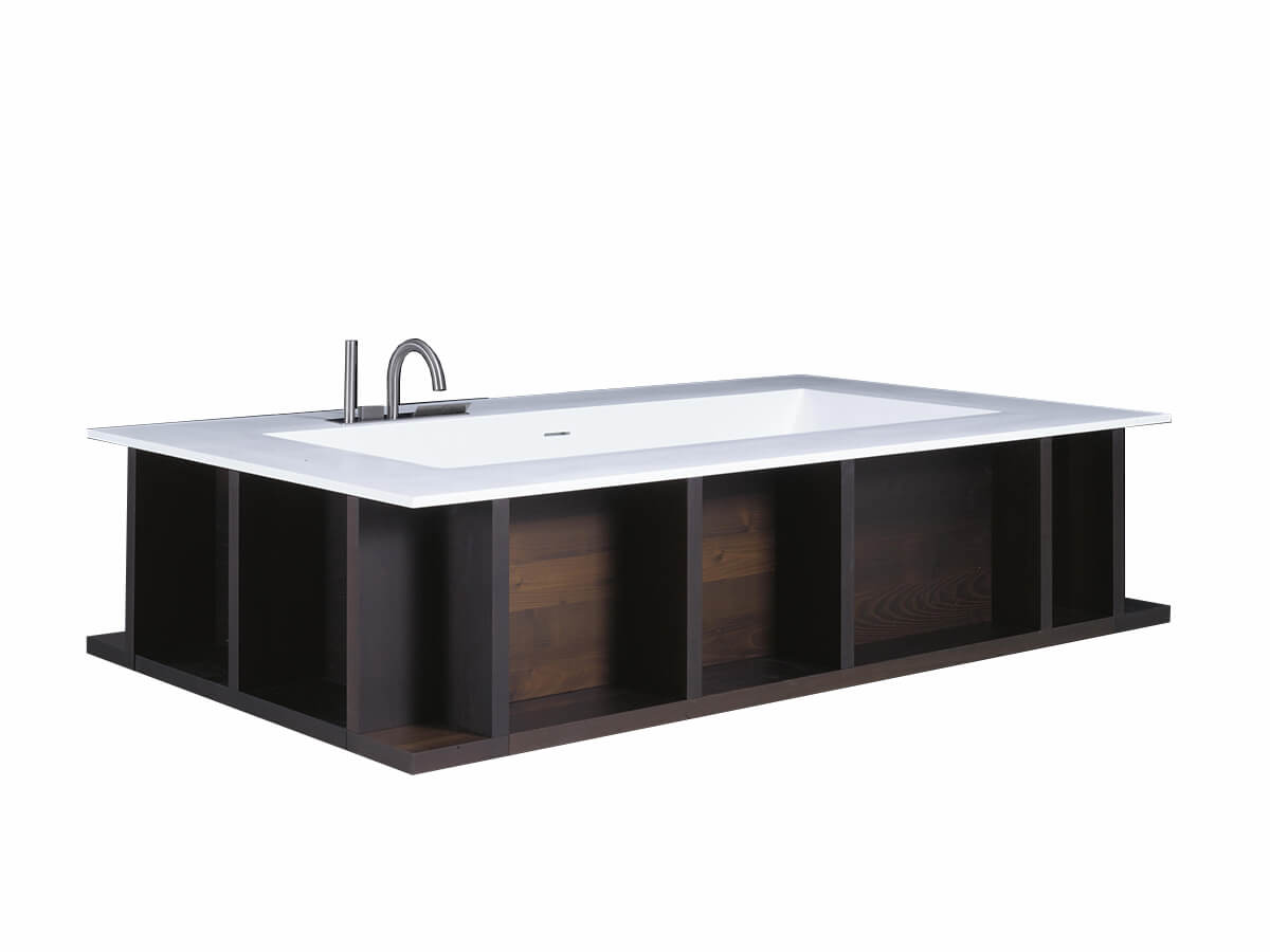 La vasca Swim-C, disegnata da Piero Lissoni in collaborazione con il CR&S Boffi, è giocata interamente sugli angoli retti di un volume rigidamente rettangolare. I suoi lati (tutti, o anche solo alcuni di essi) possono essere attrezzati con pannellature dotate di vani a giorno, permettendo quindi un uso ingegnoso dello spazio. La vasca assume così anche una funzione contenitiva, permettendo così di ricavare più spazio nell’ambiente bagno anche per altri elementi. Le linee rigidamente squadrate caratterizzano in Swim-C anche il bacino interno, circondato sui quattro lati da un ampio piano perimetrale che permette di appoggiarvi saponi e vari oggetti utili. Miscelatore e doccino trovano alloggio proprio su questo largo piano, evitando quindi l’uso di colonne esterne per l’erogazione dell’acqua.