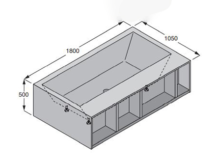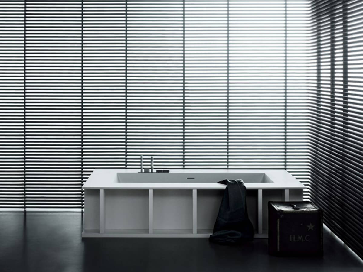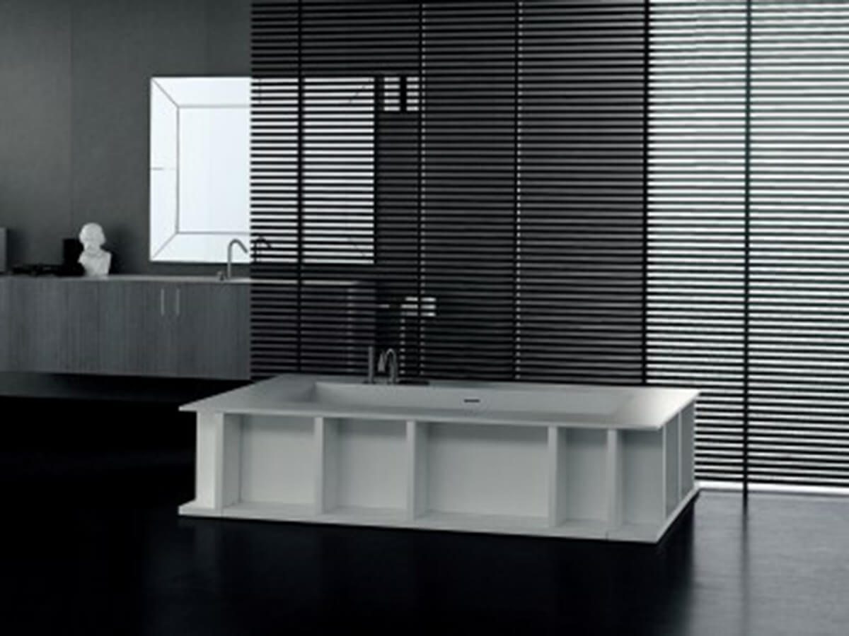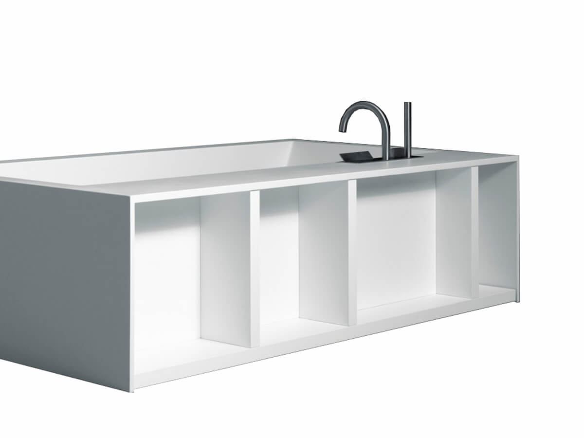 La vasca Swim-C, disegnata da Piero Lissoni in collaborazione con il CR&S Boffi, è giocata interamente sugli angoli retti di un volume rigidamente rettangolare. I suoi lati (tutti, o anche solo alcuni di essi) possono essere attrezzati con pannellature dotate di vani a giorno, permettendo quindi un uso ingegnoso dello spazio. La vasca assume così anche una funzione contenitiva, permettendo così di ricavare più spazio nell’ambiente bagno anche per altri elementi. Le linee rigidamente squadrate caratterizzano in Swim-C anche il bacino interno, circondato sui quattro lati da un ampio piano perimetrale che permette di appoggiarvi saponi e vari oggetti utili. Miscelatore e doccino trovano alloggio proprio su questo largo piano, evitando quindi l’uso di colonne esterne per l’erogazione dell’acqua.