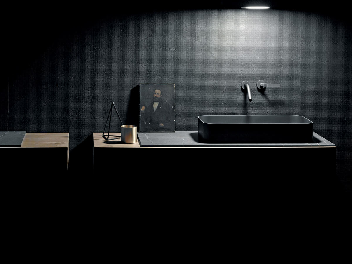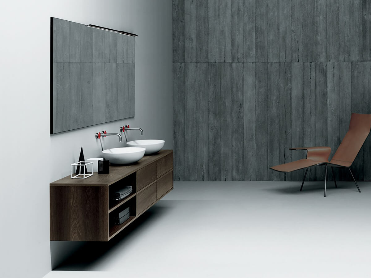 Nel bagno Wood In di Boffi un materiale tradizionale e nobile come il legno riprende vita e viene posto al centro della scena come protagonista assoluto di una serie di basi monoblocco sospese. Wood In è opera di pregevole artigianalità, enfatizzata dal dettaglio degli incastri a pettine delle assi che compongono o cassetti, tocco retrò dalle forti valenze estetiche. È possibile scegliere fra 3 legni ricercati e antichi: il rovere con nodi, il noce canaletto di provenienza americana e il raro legno fossil Oak. Wood In è disponibile inoltre in una versione semplificata in finitura Lasermat o in legno impiallacciato, rinunciando però al fascino degli incastri a pettine. Le composizioni realizzabili con la serie Wood In sono attrezzate sia con cassetti che con vani a giorno e sono completate dall’aggiunta di un lavabo soprapiano.