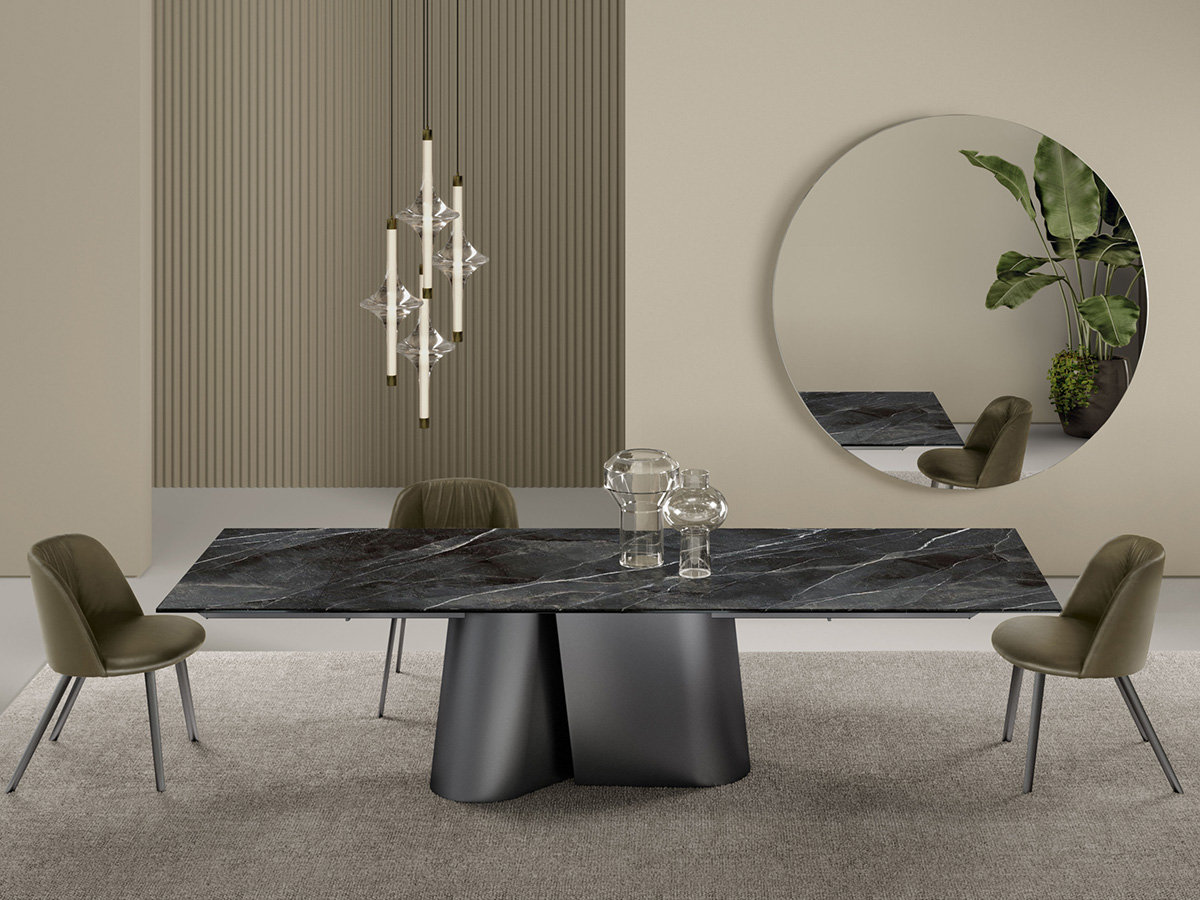 Kimono è un tavolo pensato e progettato per l’ambiente living, un elemento ideale per pranzi e cene, ma anche riunioni o più semplicemente attimi da passare in compagnia. Per la sua funzione, Bontempi l’ha pensato in diverse dimensioni e finiture, creando ogni volta la scelta ottimale. Kimono può presentarsi sia in versione rettangolare che a botte, entrambi opzionabili in formato fisso o allungabile. La struttura è in acciaio laccato, solida a sufficienza da ospitare i piani sovrastanti, disponibili in diversi materiali. Bontempi presenta Kimono con piani in legno, cristallo, SuperMarmo e SuperCeramica, finiture indispensabili per adattarsi a contesti ed esigenze particolarmente diversi fra loro.