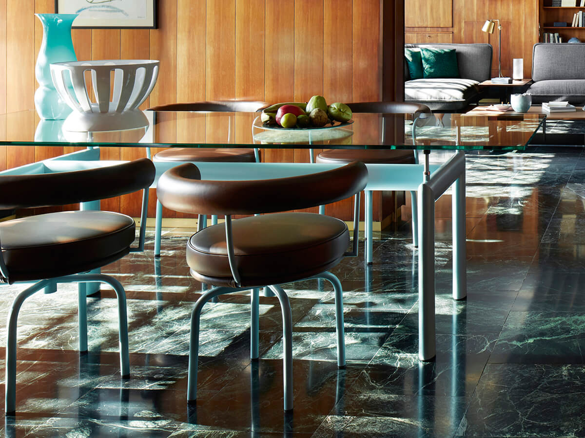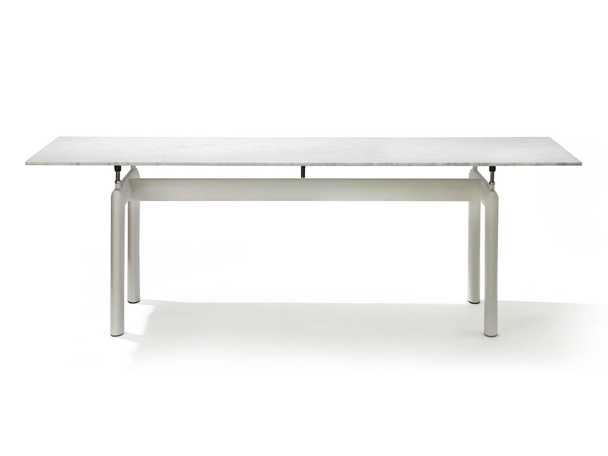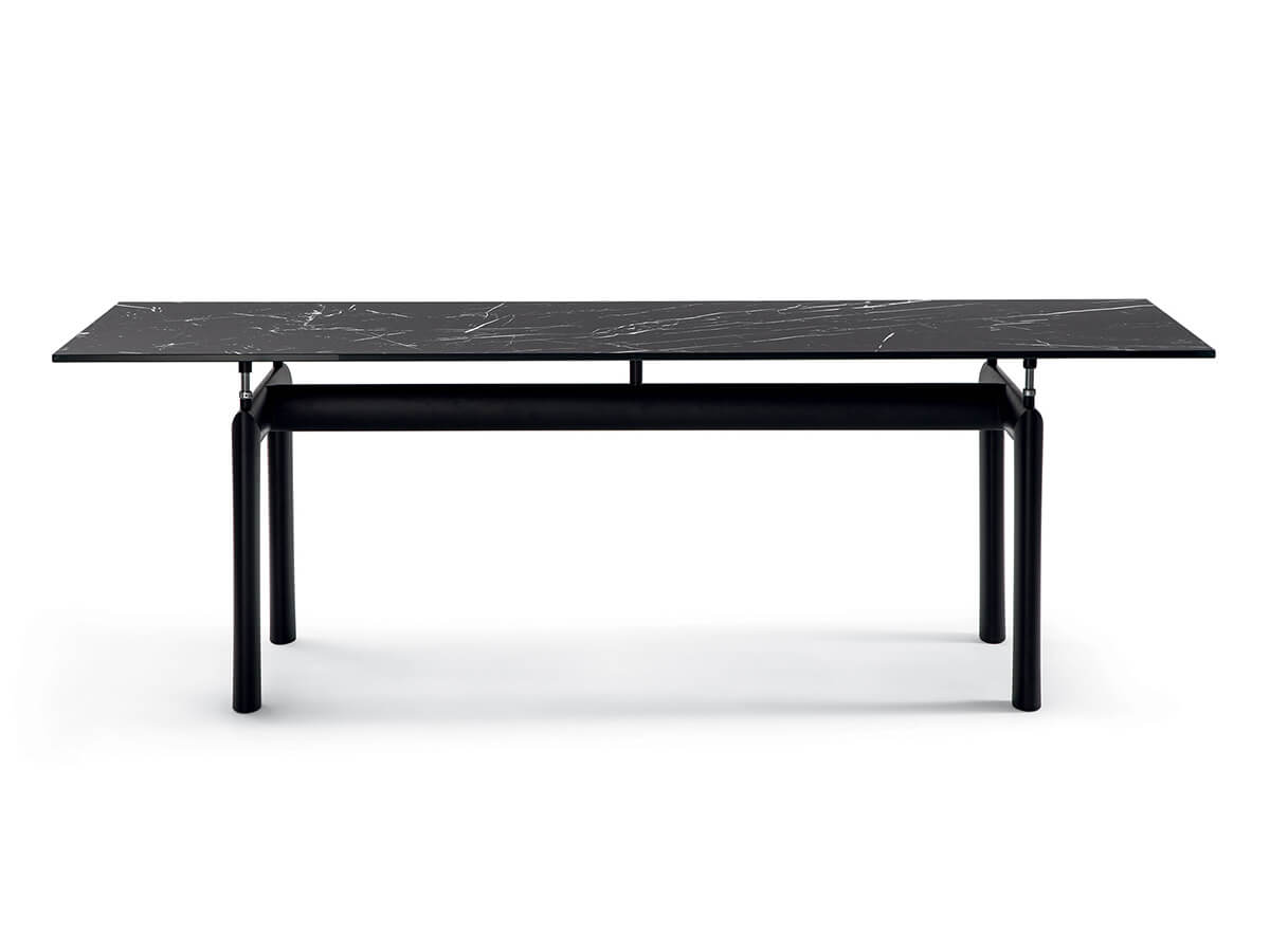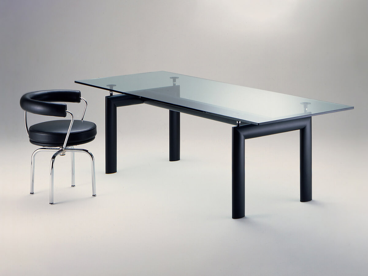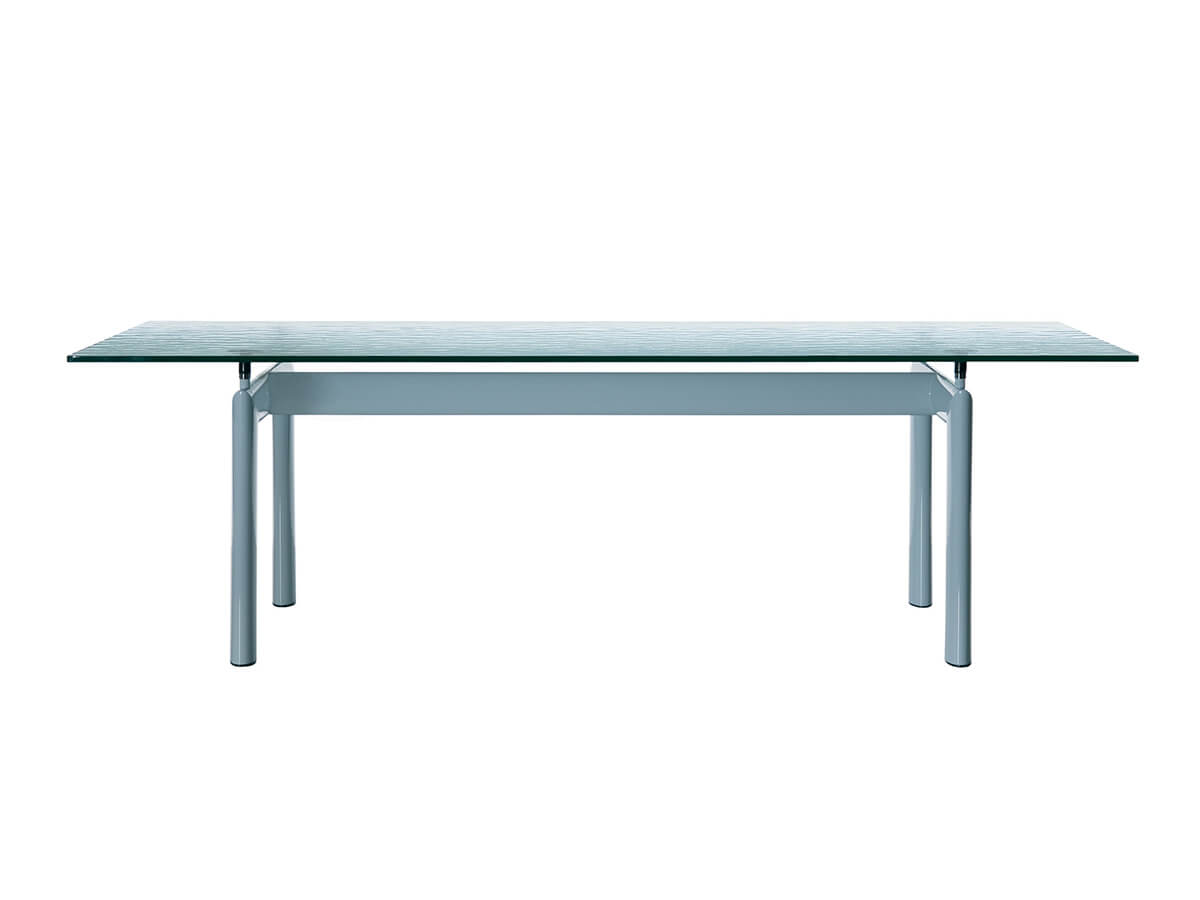 Il Tavolo 6 Table Tube d’Avion fa parte della collezione I Maestri, e deve la sua nascita al trio di designer formato da Le Corbusier, Pierre Jeannaret e Charlotte Perriand. L’idea alla base di questo modello presentato nel 1929 al Salon D’Automne risiede nella distinzione tra elemento portante ed elemento portato, ossia tra le parti che compongono il basamento e il piano. L’autonomia delle due parti si evidenzia nei quattro sostegni intermedi che fungono tanto da regolatori quanto da distanziatori fra il supporto e le linee del piano. Nota di pregio: il basamento fu disegnato nel 1928 facendo riferimento ai profili ovoidali utilizzati nel settore aereonautico per separare le ali dei biplani.