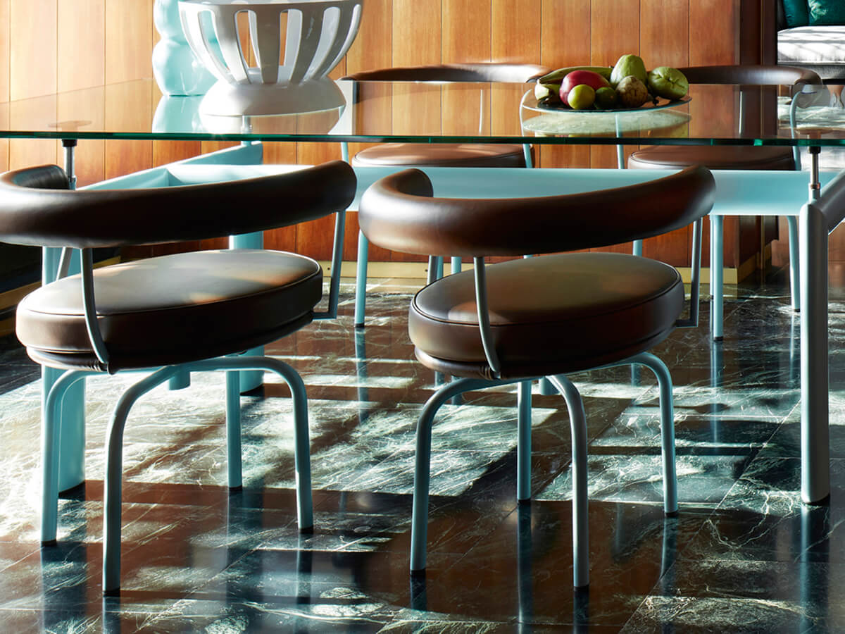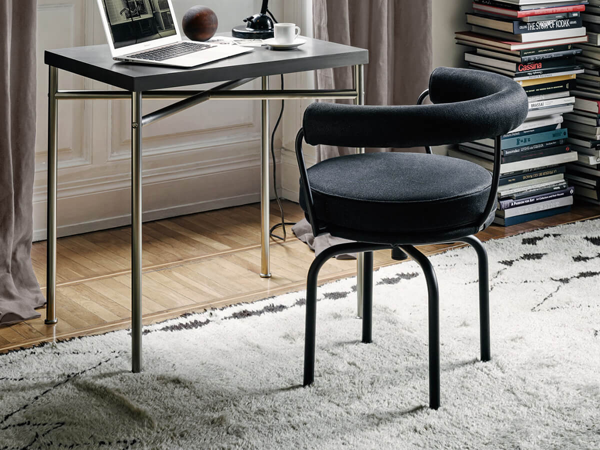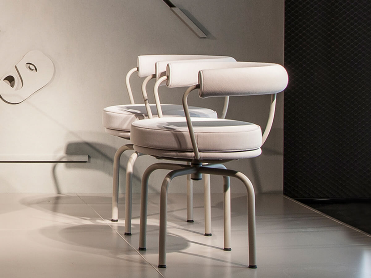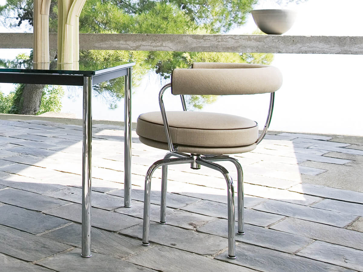 La poltroncina 7 Fauteuil Tournant nasce nel 1927 a opera di Charlotte Perriand per il suo appartamento parigino di Place Saint-Sulpice. Presentata inizialmente al Salon des Artistes Décorateurs nel 1928, è stata in seguito integrata all’interno della collezione co-creata da Charlotte Perriand, Le Corbusier e Pierre Jeannaret. Si tratta di una poltroncina girevole in acciaio cromato trivalente con schienale e cuscino-sedile imbottiti in poliuretano espanso schiumato privo di CFC e ovatta poliestere. La poltroncina 7 Fauteuil Tournant fu concepita all’interno di una concezione dell’abitare nuova e moderna, capace ancora oggi di integrarsi perfettamente con gli ambienti grazie al suo design unico e ricercato. Di recente il modello è stato oggetto di un importante aggiornamento strutturale voluto da Cassina per ottenere le certificazioni Catas.