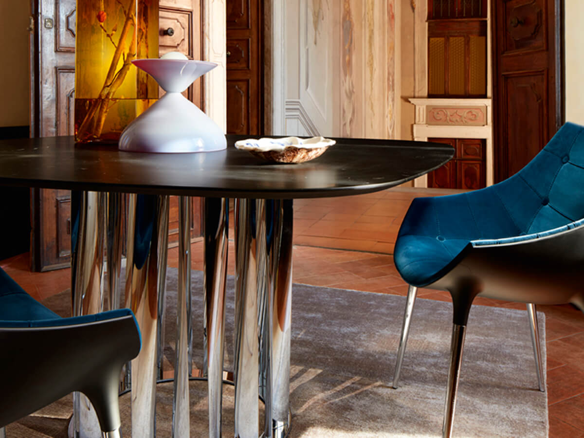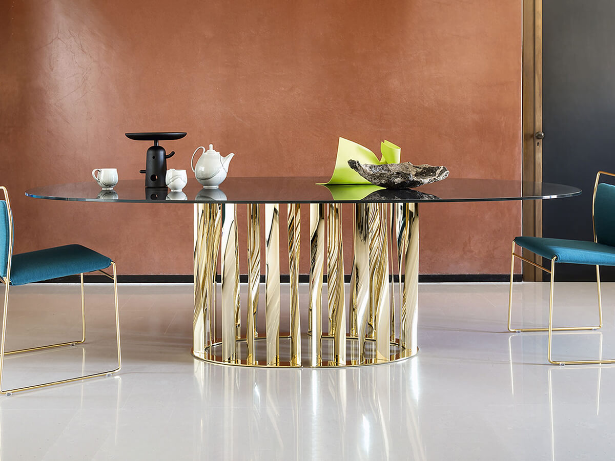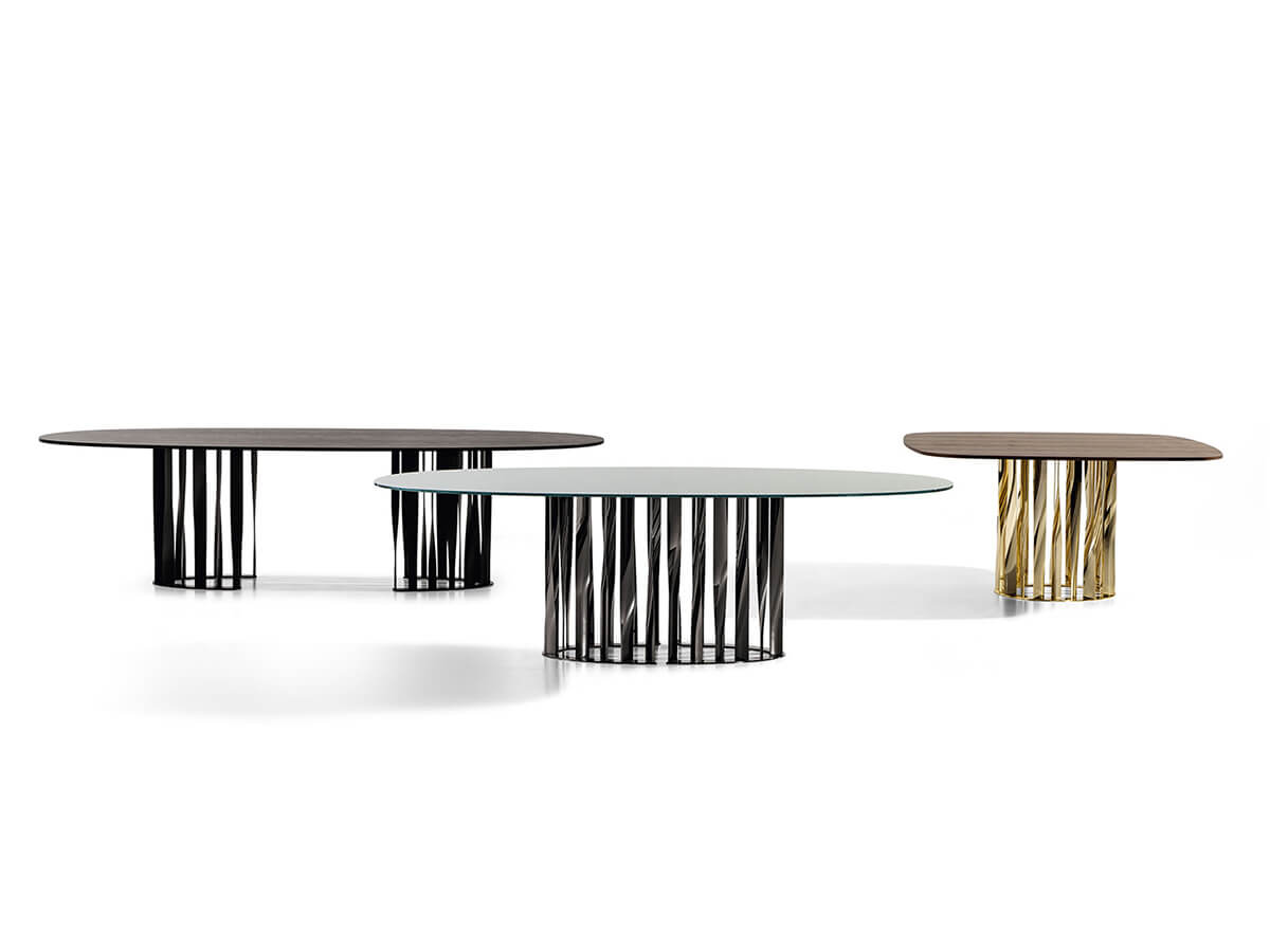 Il tavolo Boboli nasce dal genio creativo di Rodolfo Dordoni, distinguendosi fin da subito per le geometrie architettonicamente ordinate e sorrette da elementi elicoidali strutturati per rendere omaggio ai classici giardini all’italiana. L’effetto scultoreo delle doghe di alluminio ritorto conferisce a quest’opera un grande fascino stilistico, capace di coniugare rigore e fantasia per sfidare i limiti e la natura della materia. L’attuale configurazione adottata da Cassina è il frutto di numerosi rimaneggiamenti e accorgimenti del modello originale, necessari a migliorare la stabilità della struttura e la resistenza alla torsione, con conseguente avvitamento del piano alla base. Una scelta più che diversificata di finiture sia per il piano che per le gambe conferiscono al tavolo Boboli una versatilità ben orchestrata, perfetta per soddisfare le richieste più eterogenee.