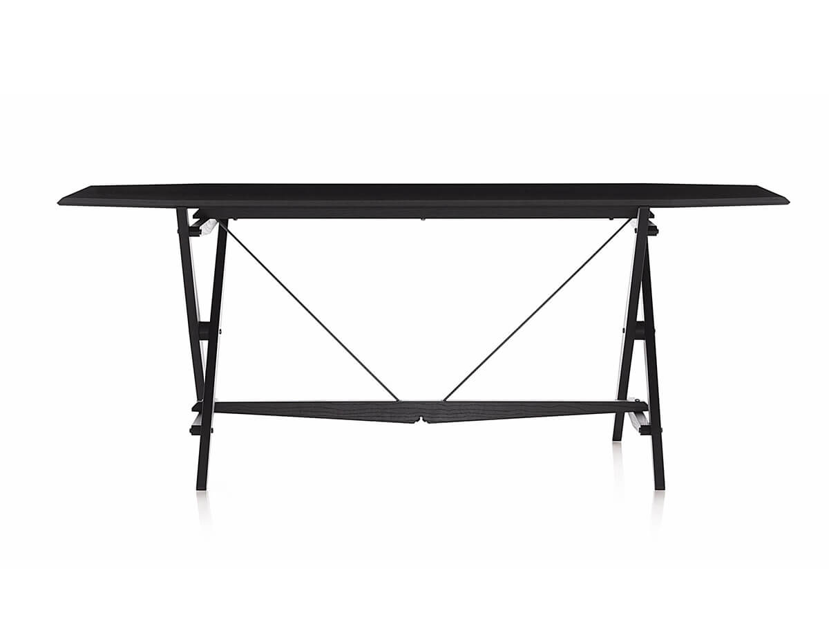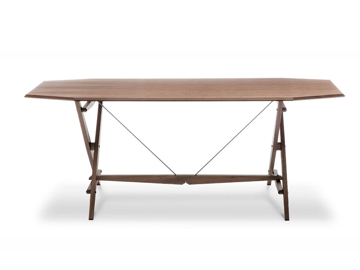 Franco Albini disegna nel 1950 questo tavolo dalle forme minimal e dall’aspetto estremamente leggero, capace di evidenziare la ricerca da lui compiuta nella ricerca di un design privo di sbavature, esagerazioni ed eccessi. La struttura si basa su tensioni contrapposte, realizzate mediante la riduzione al minimo di ogni elemento e assemblate con due tiranti tenditori in ottone brunito che fungono anche da controventature. Il delicato processo di assemblaggio a opera di Cassina riassume un’eccellenza che da anni caratterizza tutte le opere MedaMade, offrendo un’interpretazione formale di grande raffinatezza. Ogni dettaglio di Cavalletto è studiato e curato a regola d’arte, nato per impreziosire ancor più un modello di eccezionale bellezza.