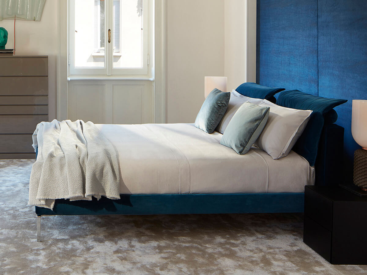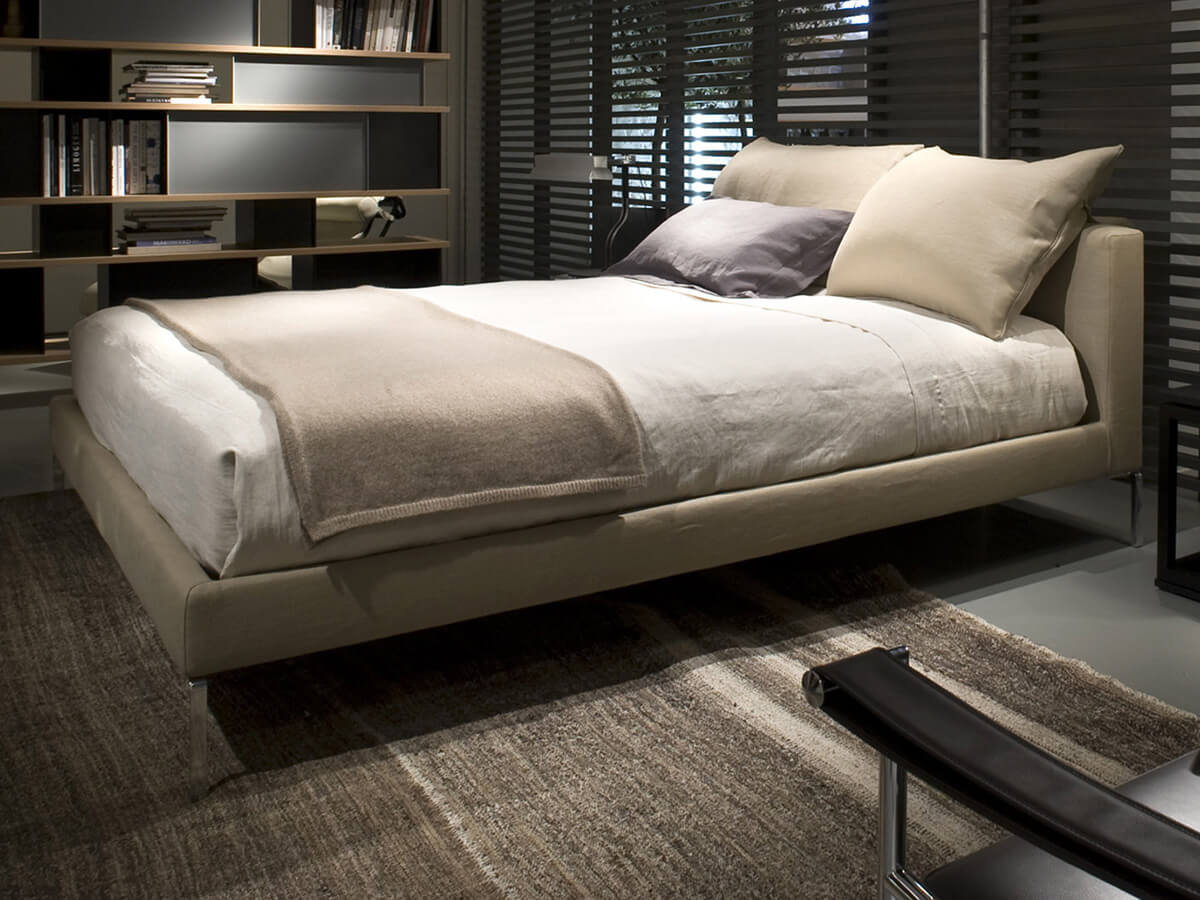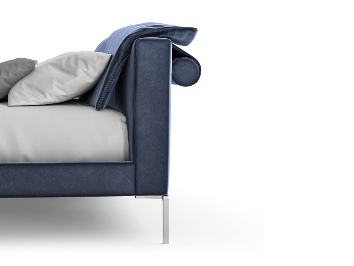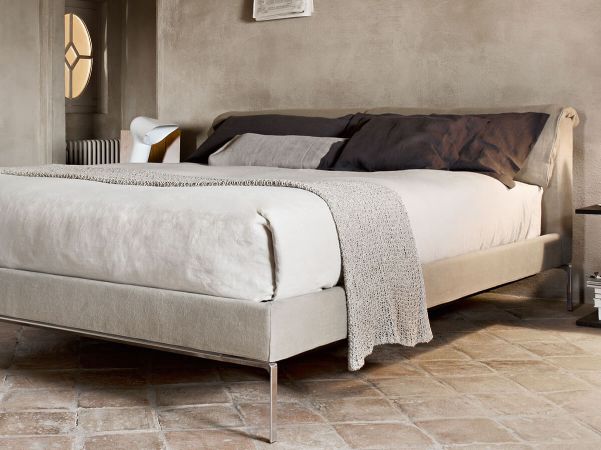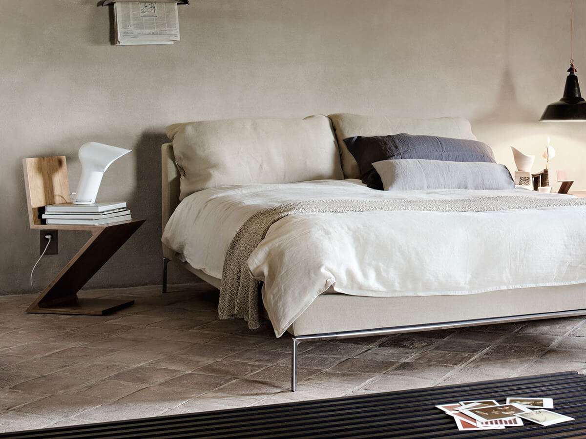 Dal genio di Piero Lissoni nasce il letto Moov, esempio vivente di come comfort e stile non smettano mai di trovare le proprie declinazioni in ogni ambiente della casa, dal soggiorno alla zona notte. Come altre opere del designer, questo modello si caratterizza per la scelta di associare elementi imbottiti di estremo confort e volume a strutture estremamente più essenziali e ridotte, dove viceversa si predilige il minimo impatto visivo tanto alla vista, quanto nel complesso delle forme d’insieme. Caratterizzante di Moov sono il giroletto e la testiera imbottiti, con rivestimento tessile sfoderabile oppure fisso in pelle. Sollevata da terra, la struttura acquista qui una linea ancor più minimal. A corredo della testiera, Lissoni ha previsto alcune cuscinature porta-guanciali, trattenute da un rullo cucito nella parte posteriore così da conferire equilibrio e armonia a ogni parte.