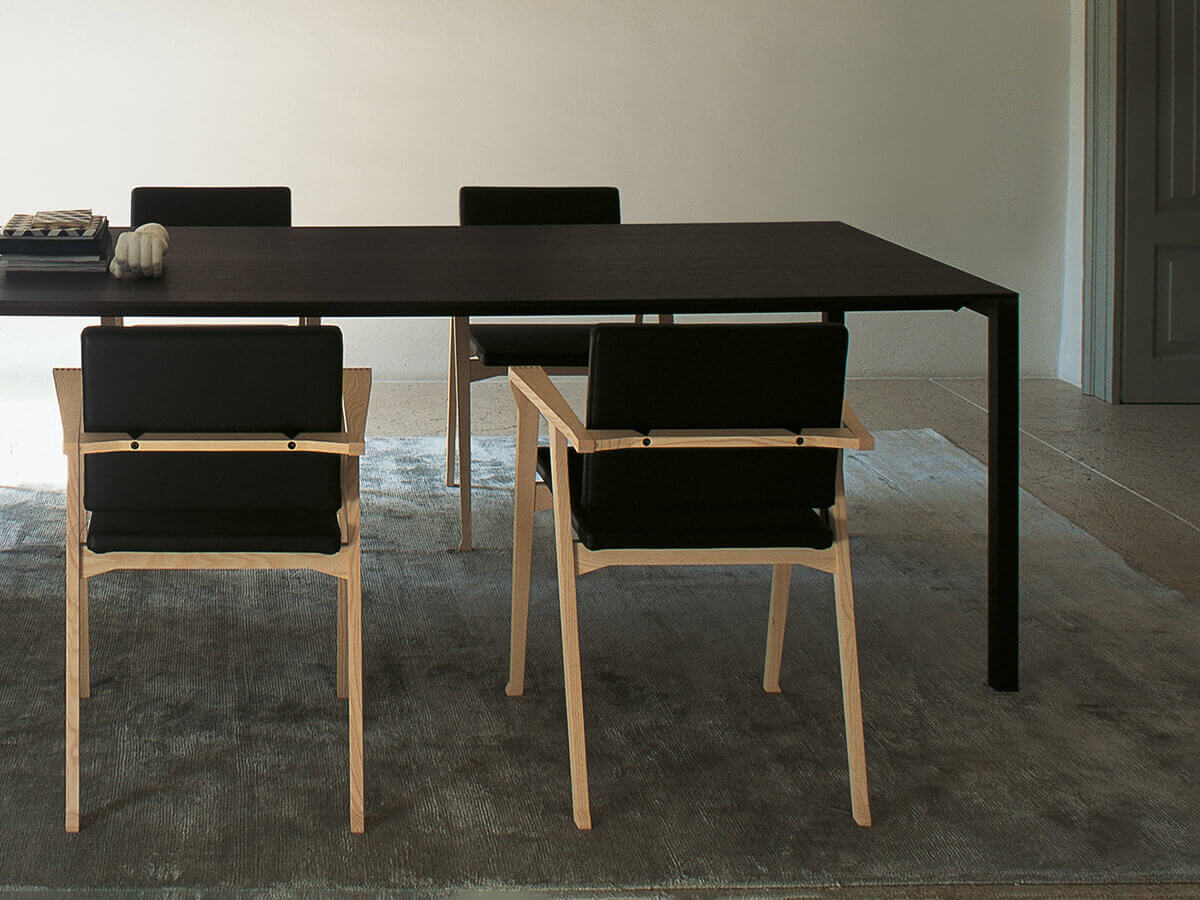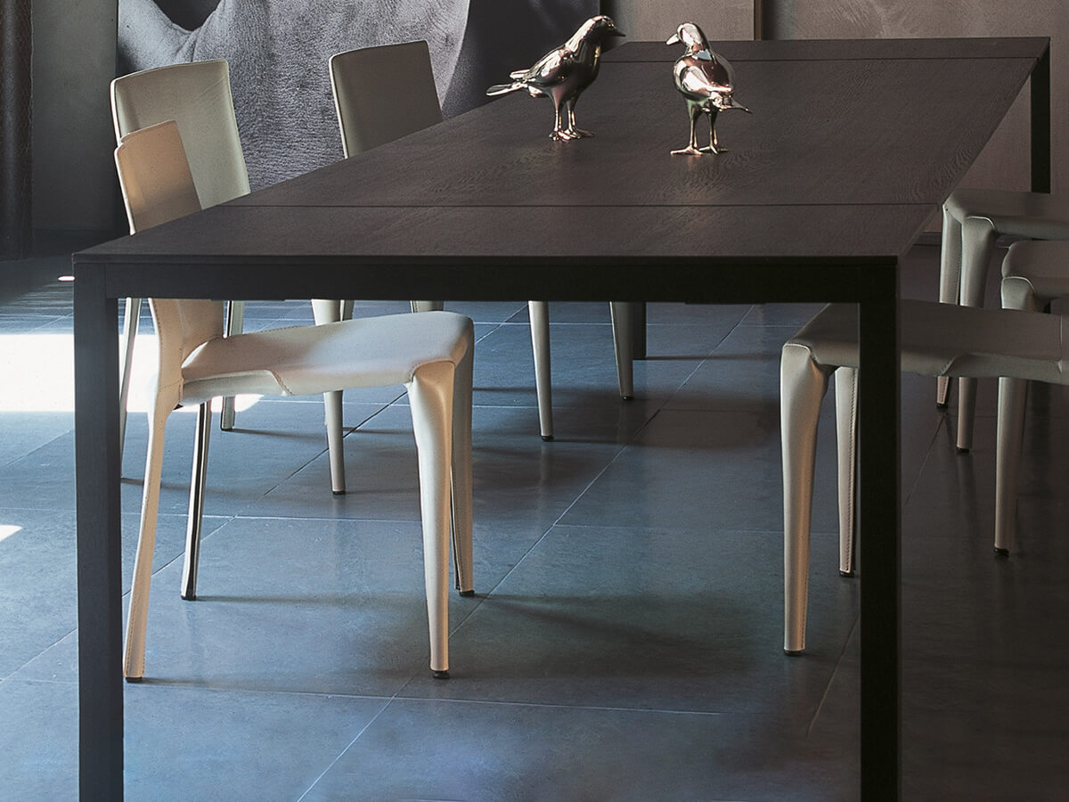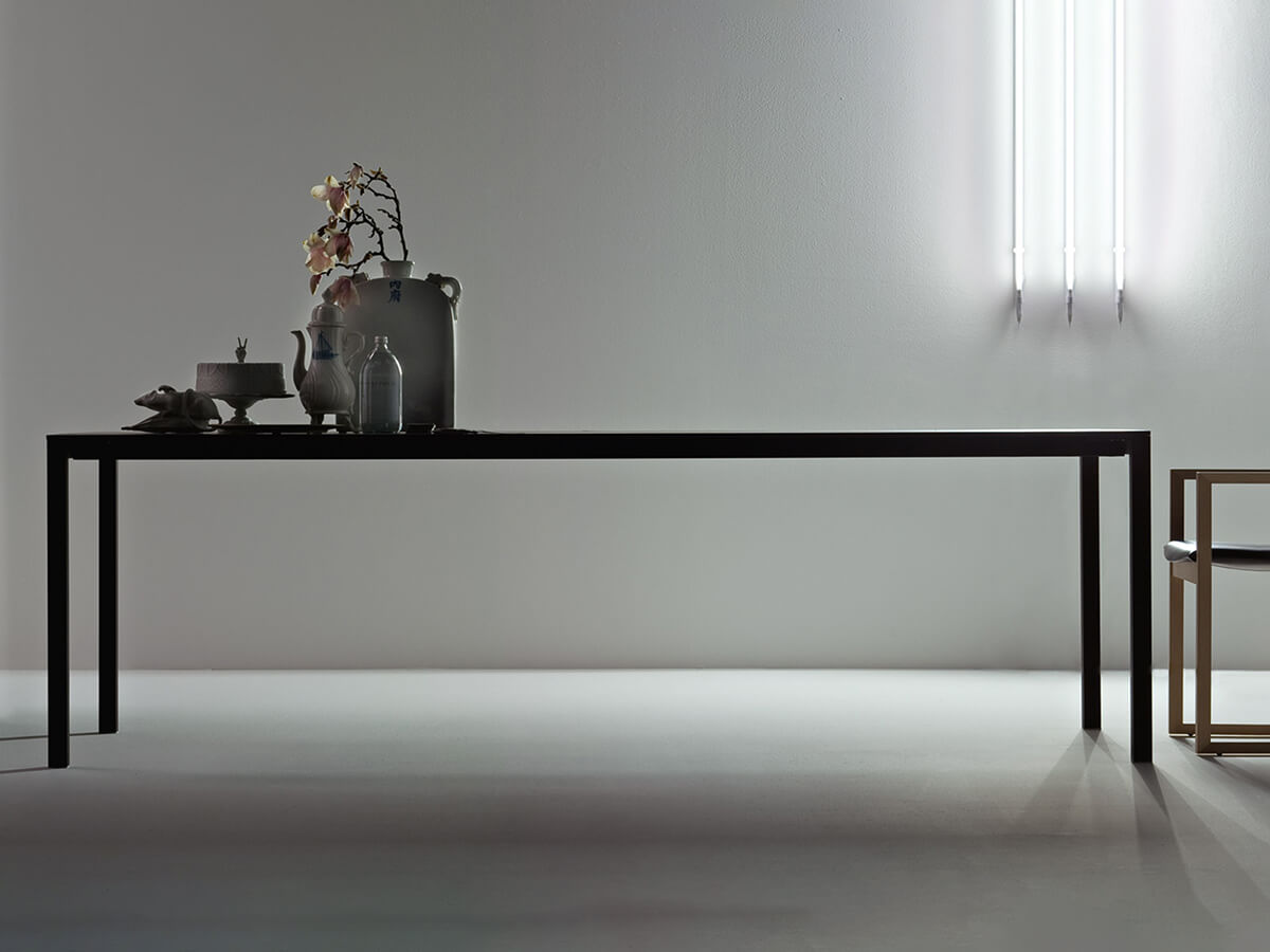 Piero Lissoni disegna il tavolo Naan sviluppando contemporaneamente due tendenze contrapposte basate su leggerezza visiva e solidità strutturale dell’oggetto. Lo spessore del piano rettangolare di soli 10 mm e realizzato in diverse finiture, ne accentua l’estremo rigore formale privo di sbavature e inutili frivolezze stilistiche. In questo modello è forte la tradizione artigianale e l’approccio industriale di Cassina, uniti nel conferire un pregio indiscutibile a quest’opera dove più che mai si percepisce l’accuratezza di ogni dettaglio. Inserito all’interno della collezione “I Contemporanei”, Naan si presta a molte interpretazioni d’arredo, ulteriormente arricchite dalla disponibilità di piani allungabili.