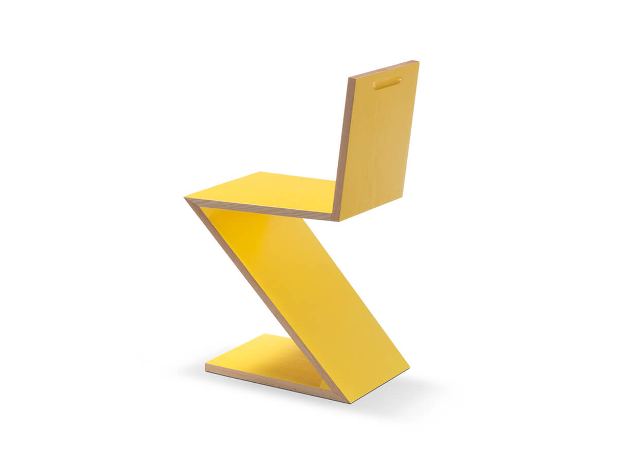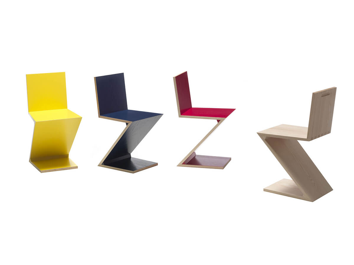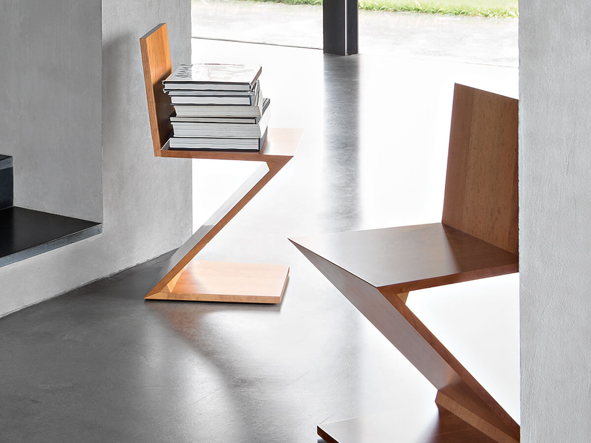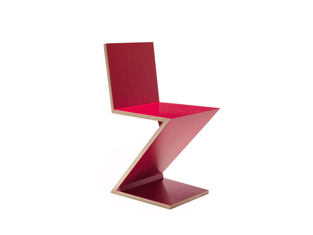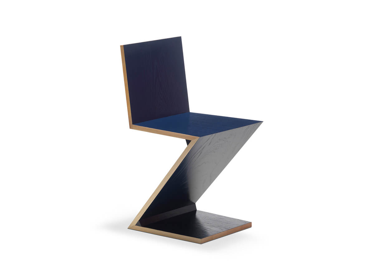 Uno dei molti pezzi icona di Cassina, comunemente nota per la semplicità delle forme e riconoscibilità del modello. La Zig Zag di Rietveld rappresenta uno dei primissimi esempi di seduta “a sbalzo”, creata unendo quattro piani in sequenza ritmica così da sviluppare un’apparente instabilità. Il progetto sostituisce gli elementi comuni della sedia – gambe, seduta e schienale – con un unico foglio continuo in legno a forma di zeta rovesciata. Gli incastri a coda di rondine dell’azienda Cassina valorizzano questa scelta progettuale, donando a Zig Zag un’unicità estetica ben visibile nelle versioni in legno naturale, ma ancor più apprezzabile nelle numerose varianti colorate che l’azienda rende disponibili. Disegnata nel 1934, l’opera di Rietveld detta ancora oggi i canoni del design moderno, in quanto esempio di essenzialismo formale e purezza estetica senza eguali.