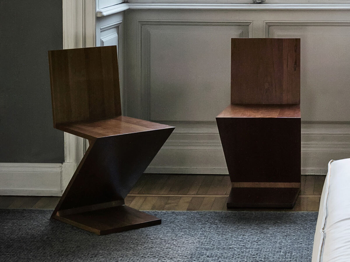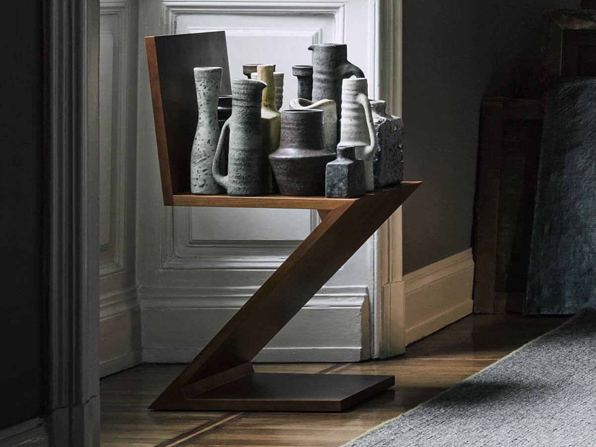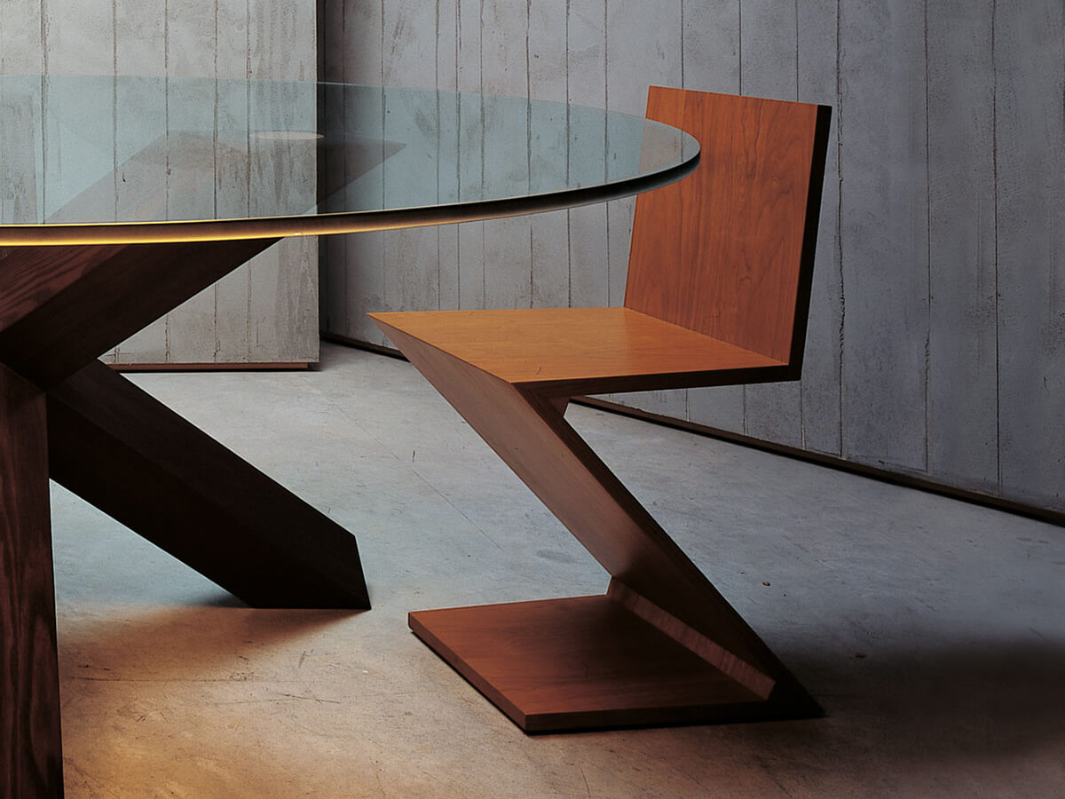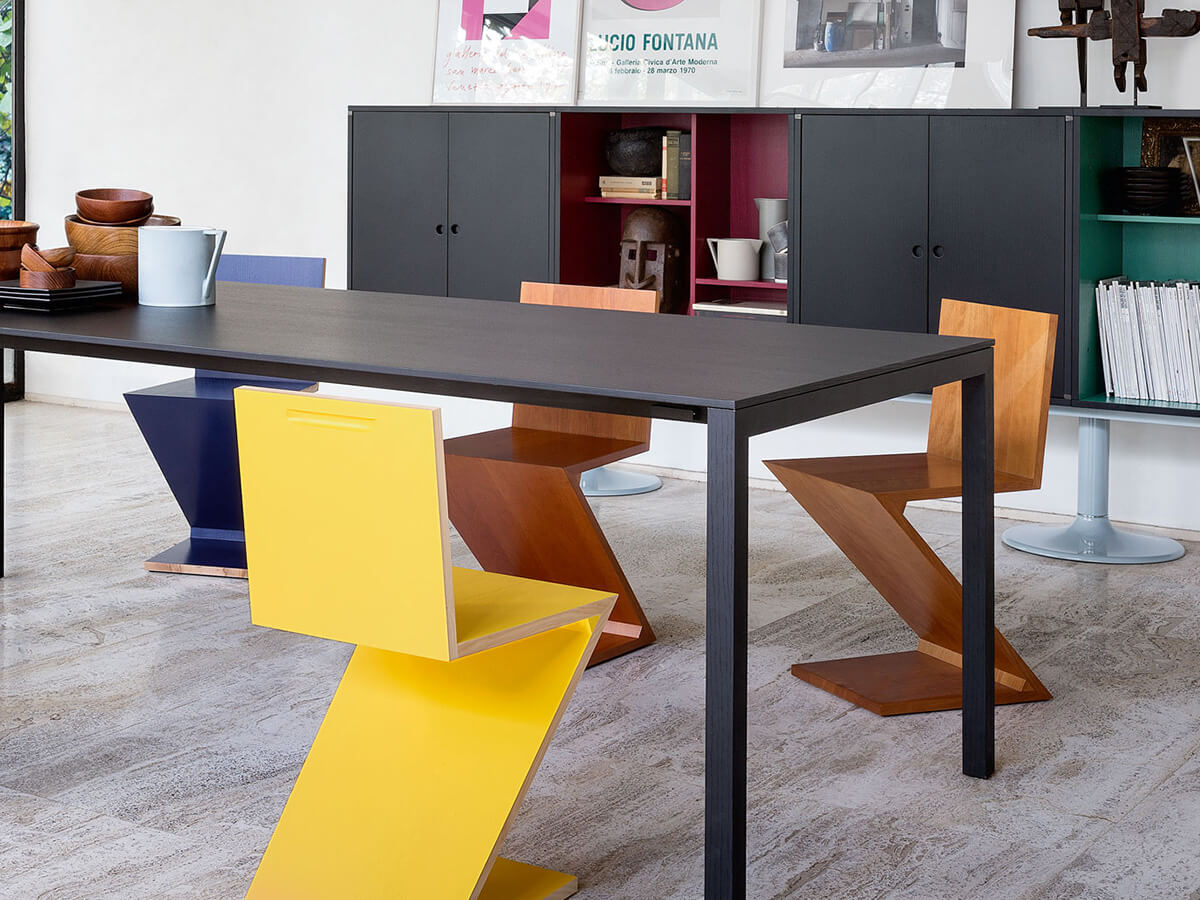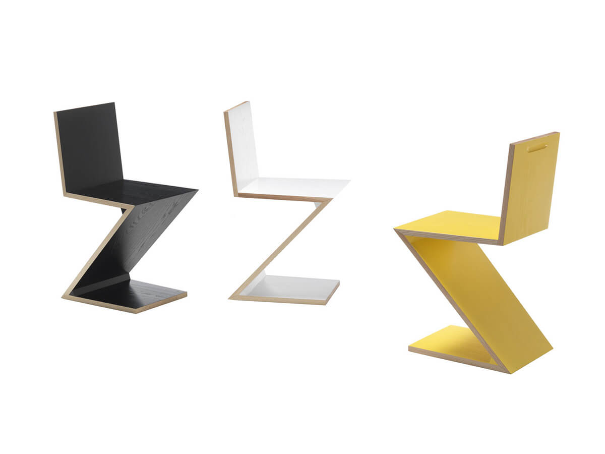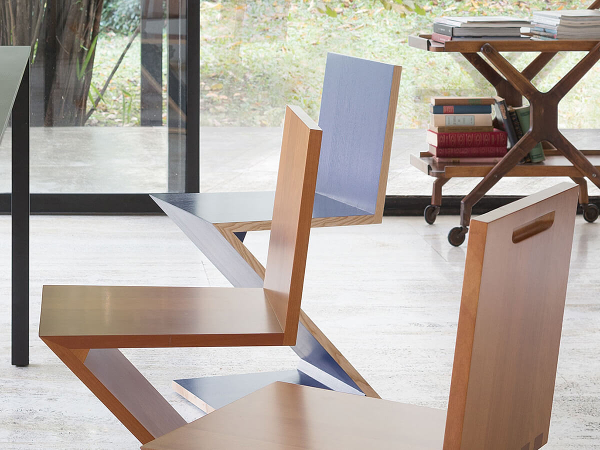 Uno dei molti pezzi icona di Cassina, comunemente nota per la semplicità delle forme e riconoscibilità del modello. La Zig Zag di Rietveld rappresenta uno dei primissimi esempi di seduta “a sbalzo”, creata unendo quattro piani in sequenza ritmica così da sviluppare un’apparente instabilità. Il progetto sostituisce gli elementi comuni della sedia – gambe, seduta e schienale – con un unico foglio continuo in legno a forma di zeta rovesciata. Gli incastri a coda di rondine dell’azienda Cassina valorizzano questa scelta progettuale, donando a Zig Zag un’unicità estetica ben visibile nelle versioni in legno naturale, ma ancor più apprezzabile nelle numerose varianti colorate che l’azienda rende disponibili. Disegnata nel 1934, l’opera di Rietveld detta ancora oggi i canoni del design moderno, in quanto esempio di essenzialismo formale e purezza estetica senza eguali.