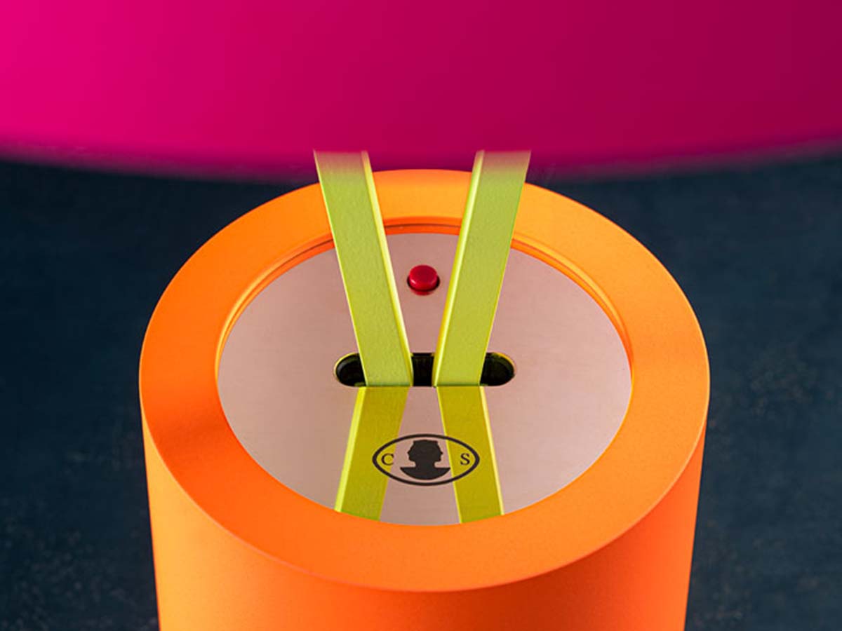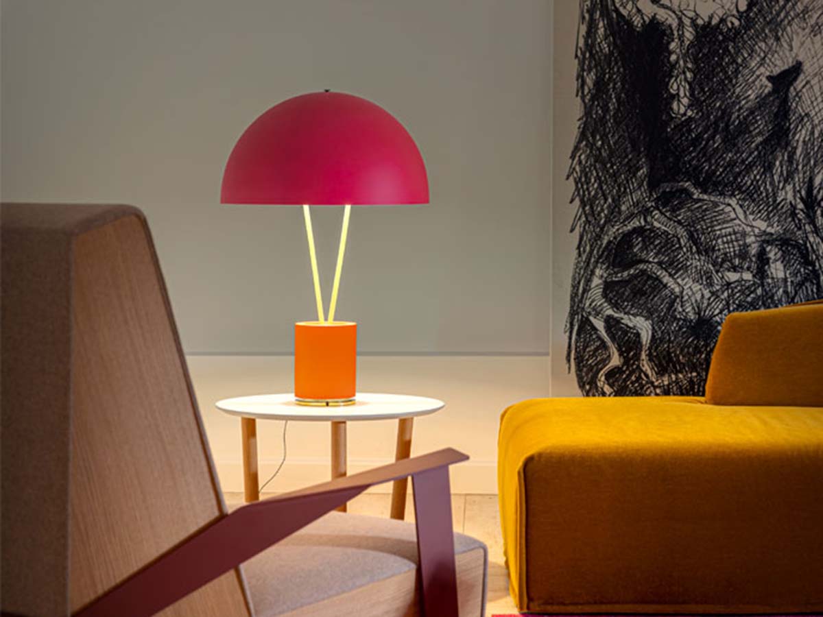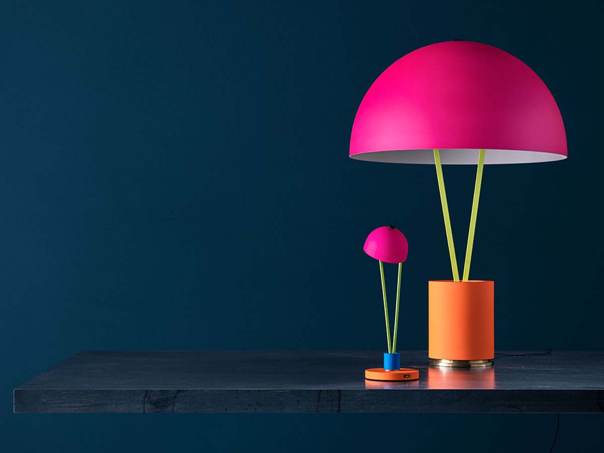 Catellani&Smith riscopre i colori e il gusto di un arredo estroverso con la linea di lampade da tavolo Ale Big, inno alla tridimensionalità e soprattutto alle tinte forti, decise, totalizzanti. In questo interessante elemento d’arredo luminoso risplendono vividi i blu, rossi e gialli ma anche le numerose sfumature fluo del rosa, dell’arancio e di molto altro ancora, un alternarsi di colorazioni che vogliono volutamente catturare l’occhio spingendolo ad ammirare un design che non teme convenzioni e limitazioni. Ale Big si compone di un corpo di sostegno cui due grandi braccia si congiungono per ospitare l’imponente diffusore a semisfera dal quale si propaga una luce morbida e modulata. La semisfera diventa elemento distintivo di questa lampada declinata a sua volta in numerosi modelli caratterizzati dal dettaglio ironico di una mosca poggiata sulla calotta.