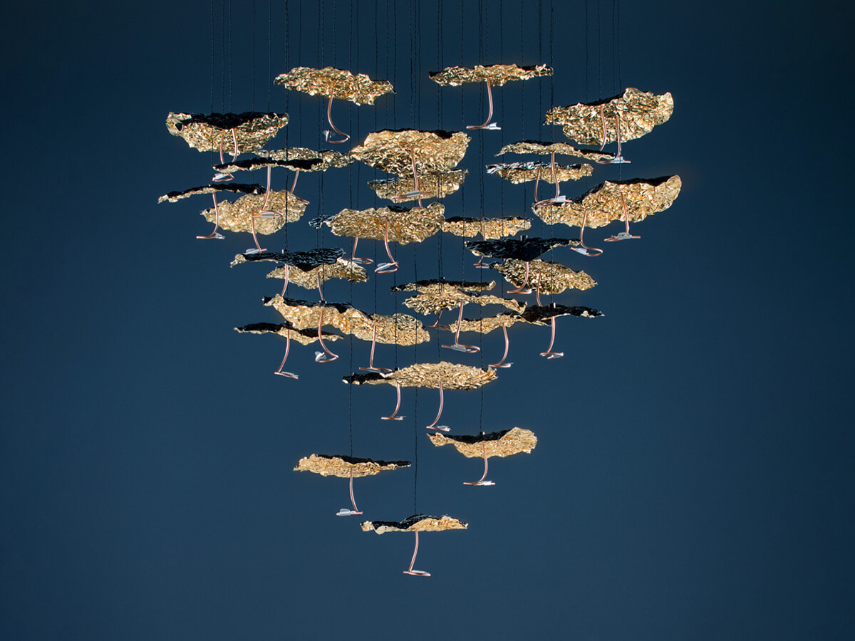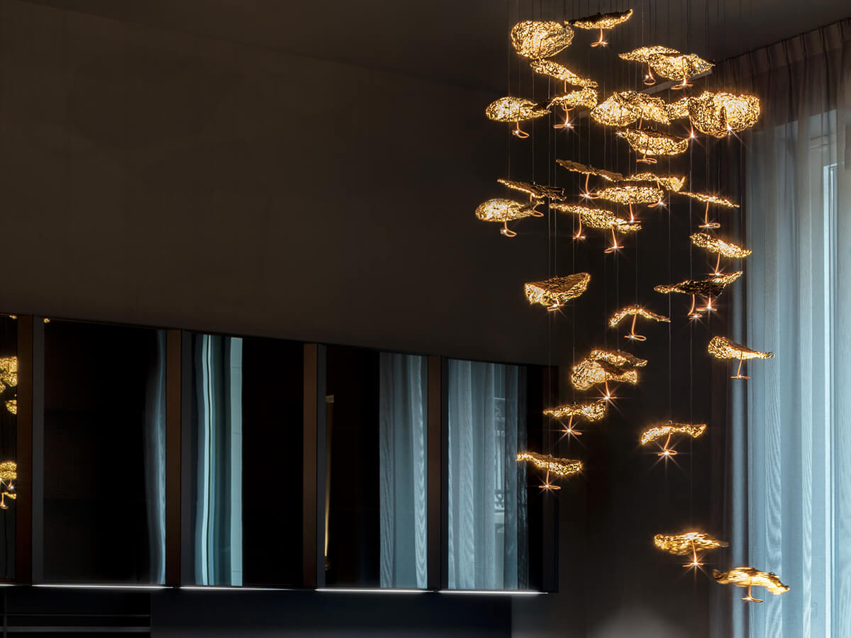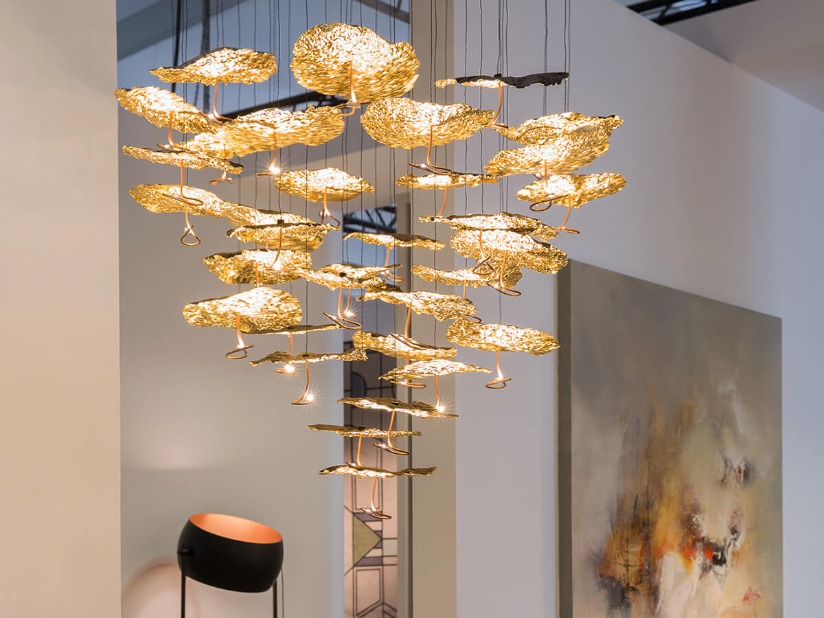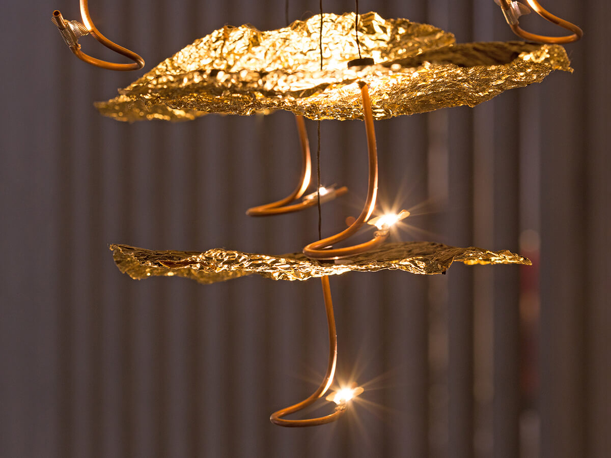 Gold Moon Chandelier viene progettata da Enzo Catellani nel 2018 interpretando in chiave contemporanea il concetto di chandelier secondo Catellani & Smith. Si tratta di una lampada a sospensione con base in acciaio satinato alla quale sono sospesi, tramite dei cavi neri di altezze differenti, dei dischi irregolari, impreziositi al loro interno da una lavorazione a foglia d’oro e da riccioli di rame e piccole gemme in vetro che ospitano i led. Le fonti di luce sono intercambiabili e dimmerabili consentendo così di regolare l’intensità luminosa in modo da personalizzare l’atmosfera negli ambienti in cui la lampada viene collocata. Il risultato visivo è quello di una cascata di luce ed oro che per la sua spettacolarità ben si presta ad inserirsi nel contesto di progetti contract, hotellerie e di residenze private.