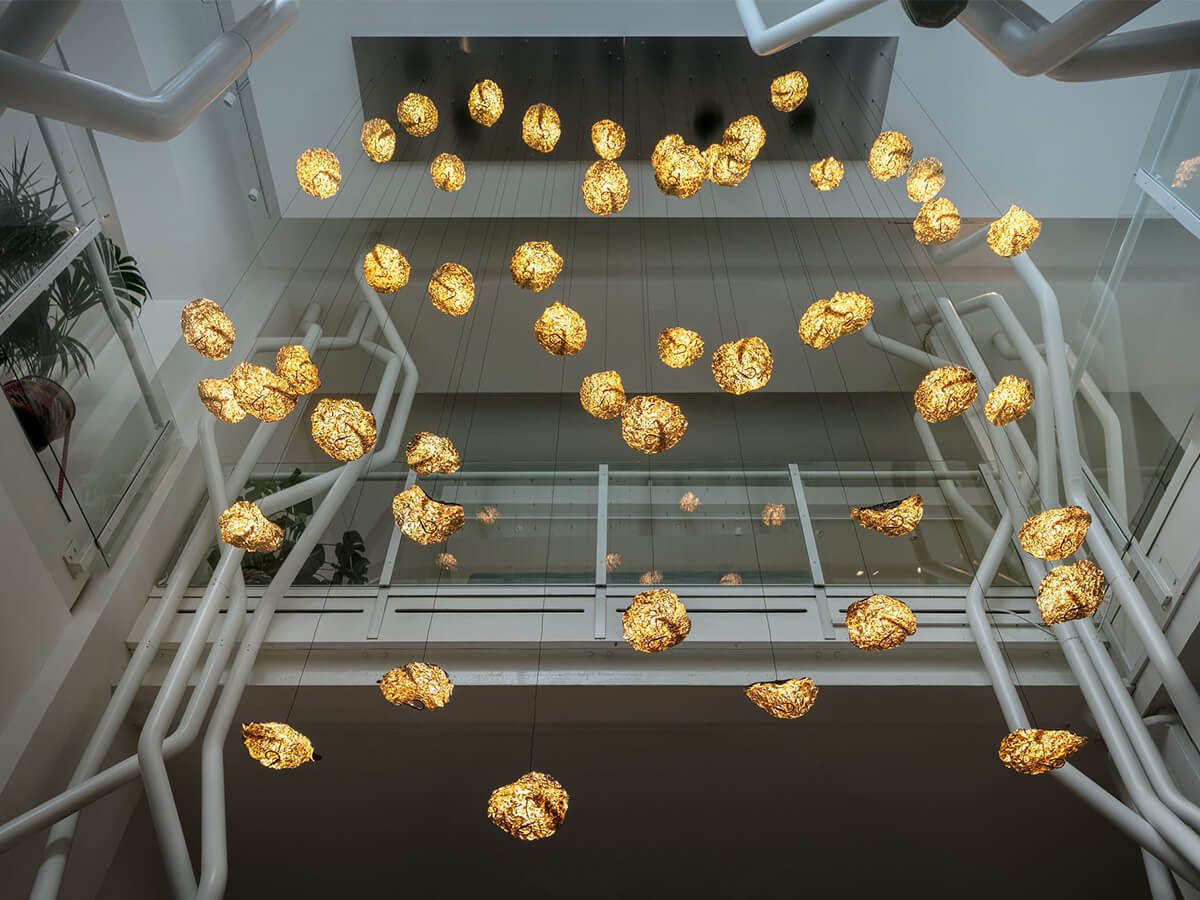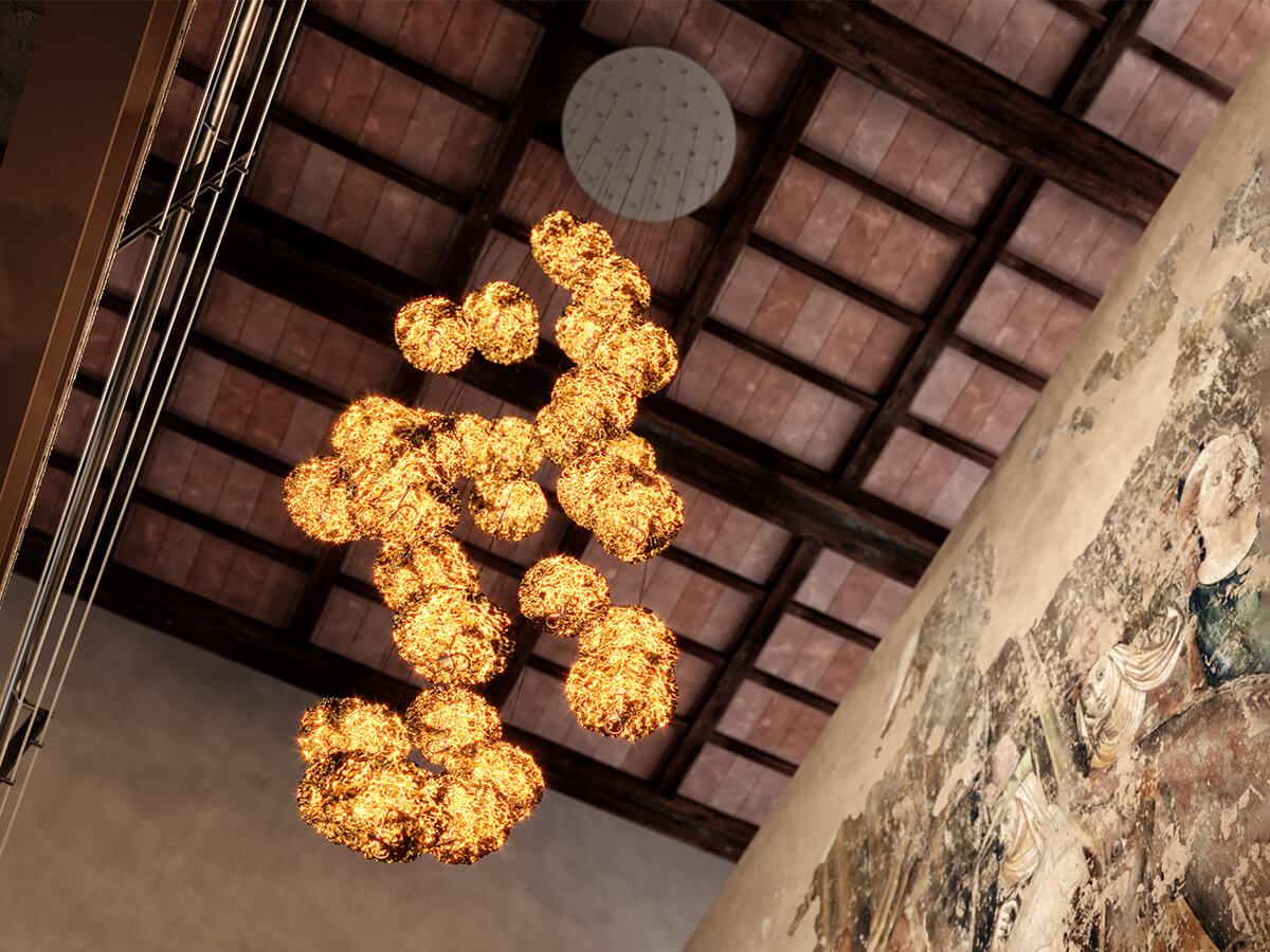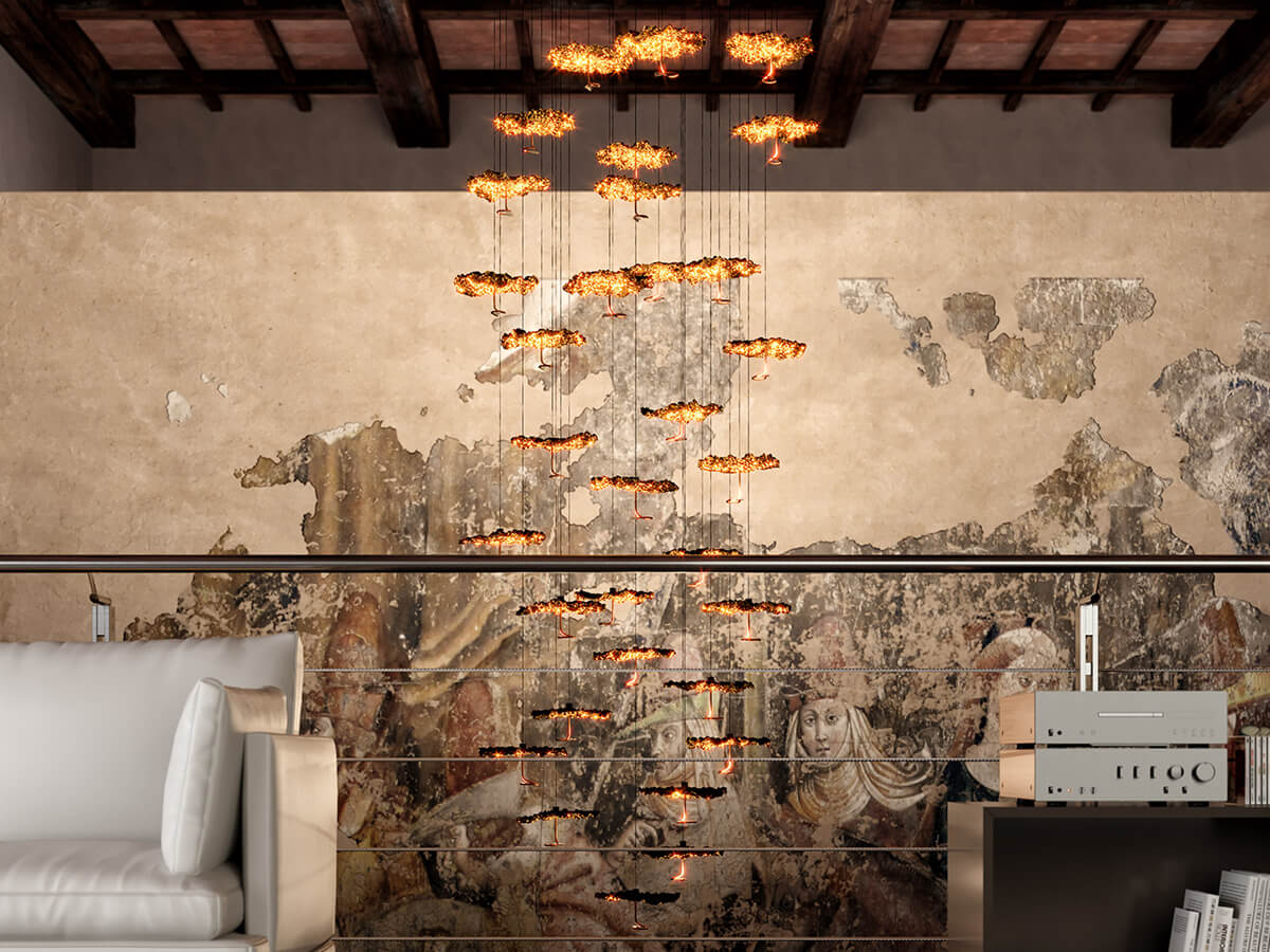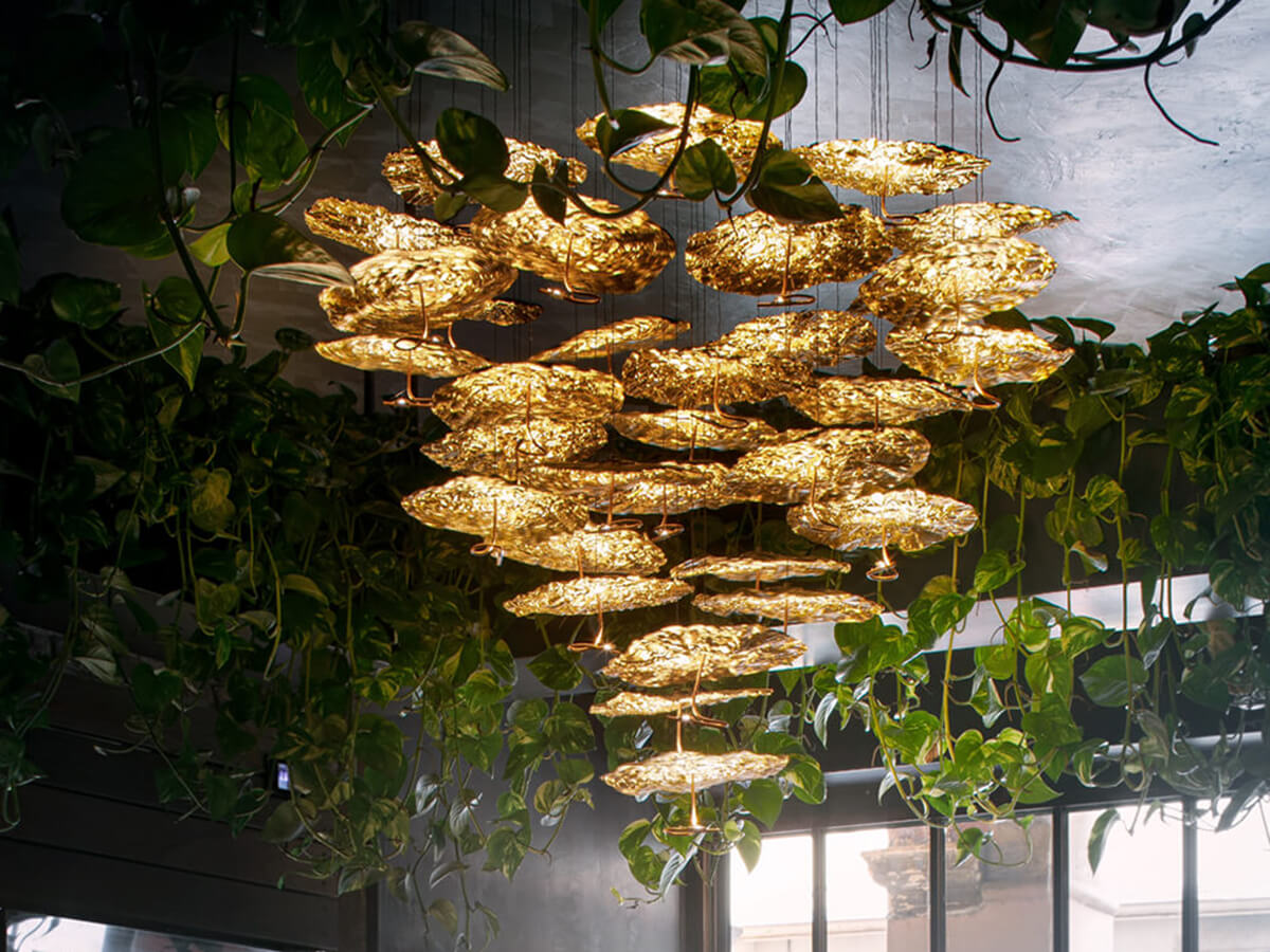 Gold Moon Chandelier viene progettata da Enzo Catellani nel 2018 interpretando in chiave contemporanea il concetto di chandelier secondo Catellani & Smith. Si tratta di una lampada a sospensione con base in acciaio satinato alla quale sono sospesi, tramite dei cavi neri di altezze differenti, dei dischi irregolari, impreziositi al loro interno da una lavorazione a foglia d’oro e da riccioli di rame e piccole gemme in vetro che ospitano i led. Le fonti di luce sono intercambiabili e dimmerabili consentendo così di regolare l’intensità luminosa in modo da personalizzare l’atmosfera negli ambienti in cui la lampada viene collocata. Il risultato visivo è quello di una cascata di luce ed oro che per la sua spettacolarità ben si presta ad inserirsi nel contesto di progetti contract, hotellerie e di residenze private.