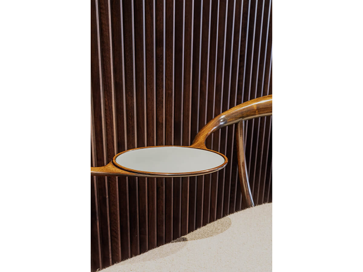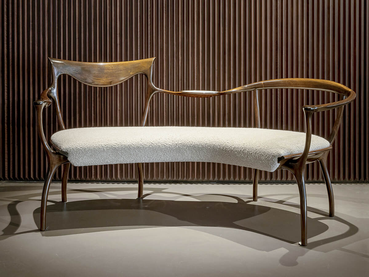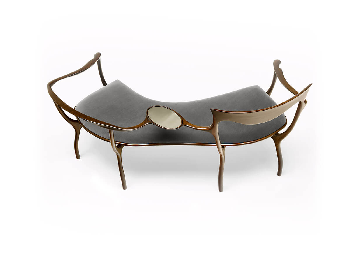 Un elemento d’arredo fortemente connotato, capace di riassumere eleganza e semplicità in forme che molto hanno a che spartire con l’arte della calligrafia. D.R.D.P. è un divanetto in massello di noce americano finemente modellato con tecniche artigianali volte a esaltare venature e pregevolezza del legno. La seduta è in multistrato, imbottita e provvista di un vassoio in vetro sabbiato con finitura argento. Ideale per chi desideri un elemento d’arredo classico eppure al passo con i tempi, che bene sappia incarnare un desiderio di estemporaneità da mode e tendenze. DRDP è disponibile in diverse misure e finiture fra cui noce americano, noce americano scuro, moda e brown.