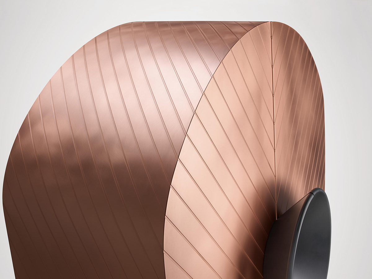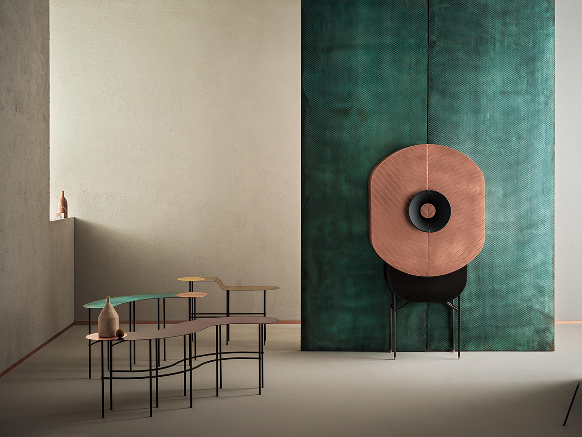 La designer Elena Salmistraro, con il suo tratto stilistico ironico, allegro e colorato, progetta per De Castelli il cabinet verticale Polifemo. La struttura interna di questa piccola madia a due ante è in legno laccato opaco, colore grigio antracite, mentre l’esterno è completamente rivestito in rame spazzolato, solcato da incisioni che danno movimento alla superficie. Un elemento decorativo centrale, che richiama la forma dell’occhio del ciclope, funge da maniglia mentre quattro sottili gambe in acciaio inox, con finitura délabré, sostengono il contenitore giocando sulle proporzioni. Polifemo è un mobile raffinato, molto versatile e facile da collocare in casa o in ufficio, perfetto per chi vuole stupire o valorizzare un angolo nascosto con un pezzo dal fascino senza tempo.