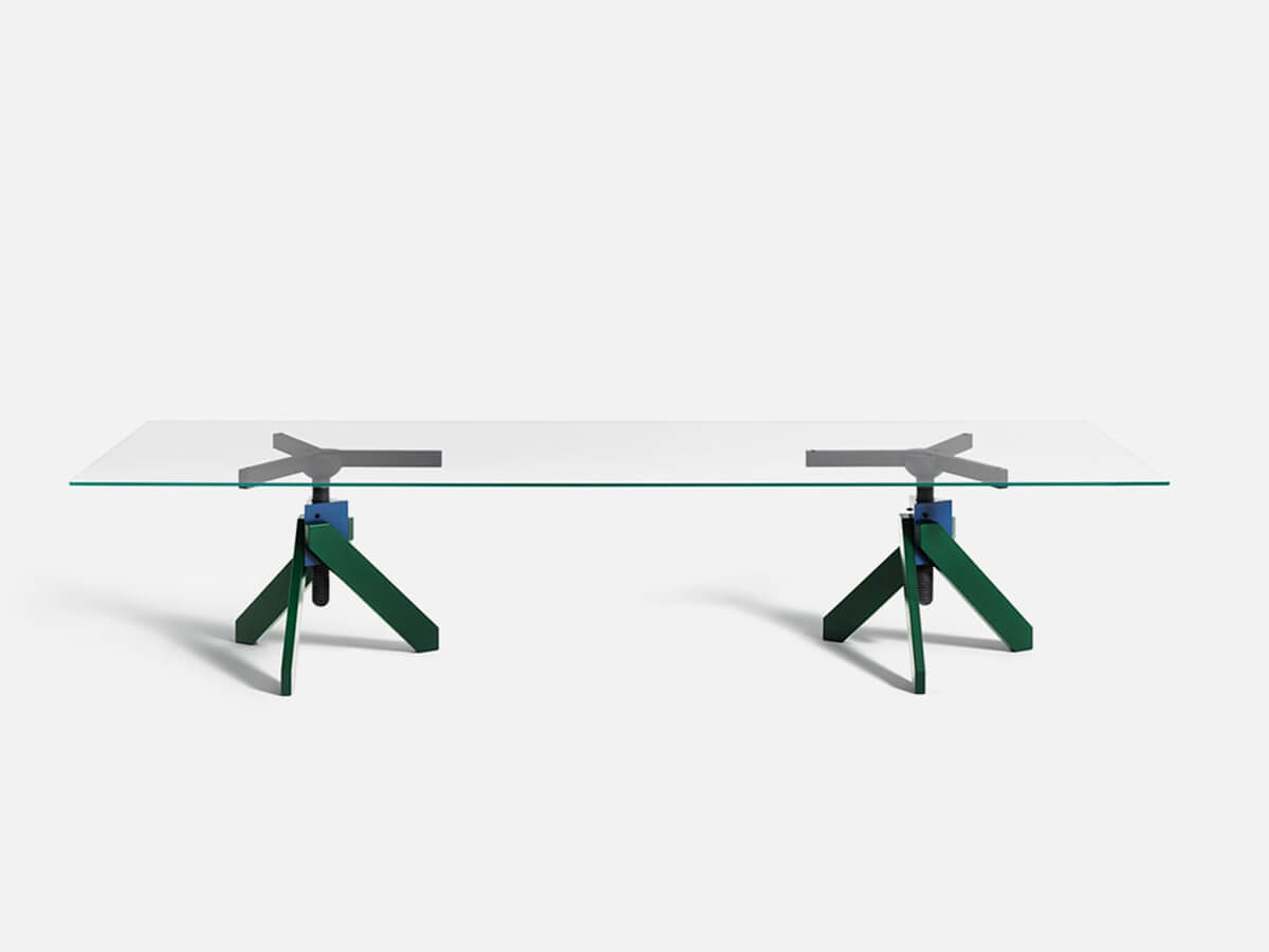 Come riecheggiato dal nome stesso (in dialetto milanese il termine “vidun” significa “grossa vite”), il tavolo Vidun di De Padova si caratterizza per l’iconica base che si richiama per l’appunto alla forma di una vite, che non ha però soltanto funzioni decorative: ruotando all’interno del sostegno permette infatti di alzare o abbassare il piano del tavolo, riprendendo un meccanismo tipico dei tavoli da lavoro degli artigiani. Il piano, rotondo o rettangolare, è realizzato in cristallo in modo da lasciar vedere interamente l’ingegnosa costruzione della base, nella quale l’elemento della vite è innestato su un largo treppiede in legno.