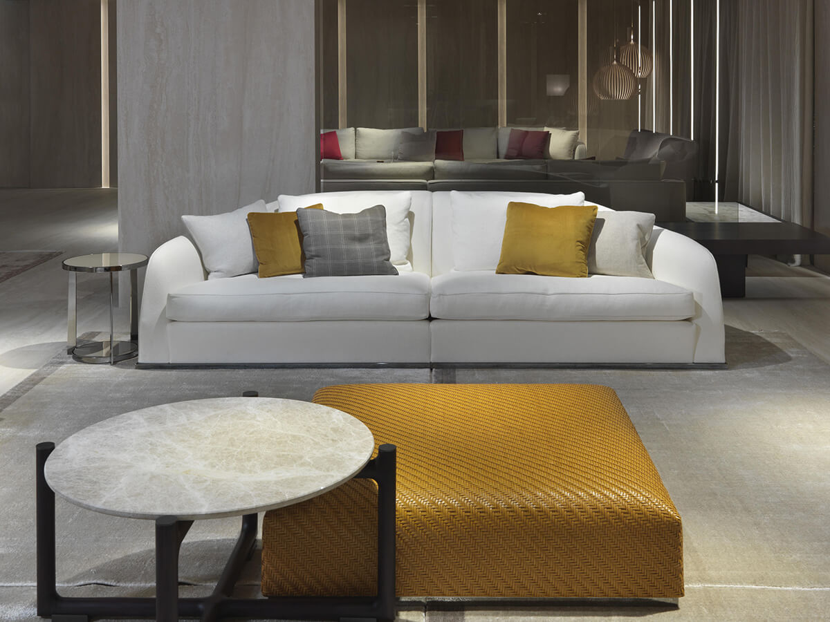 Alfred è un divano appartenente alla Collezione MOOD, dal tipico sapore “New Classic”, capace di offrire una visione bilanciata ed estremamente armonica del tipico elemento d’arredo per lo spazio living. Qui la maestria artigianale dell’azienda ci presenta uno schienale dalla linea avvolgente che si abbassa gradualmente fino a formare il bracciolo, ideale per composizioni versatili e utilizzi nei diversi momenti della giornata. Una raffinata base in metallo fornisce il sostegno alla struttura disponibile in versione lineare a due o tre posti o composizioni più eterogenee in base alle necessità di collocamento. Le numerose finiture disponibili, specialmente i tessuti, spiccano per i dettagli sartoriali, ideali per ricoprire i cuscini e l’intera gamma di arredi associati al grande imbottito principale. *Caratteristiche tecniche: profilo in gros grain